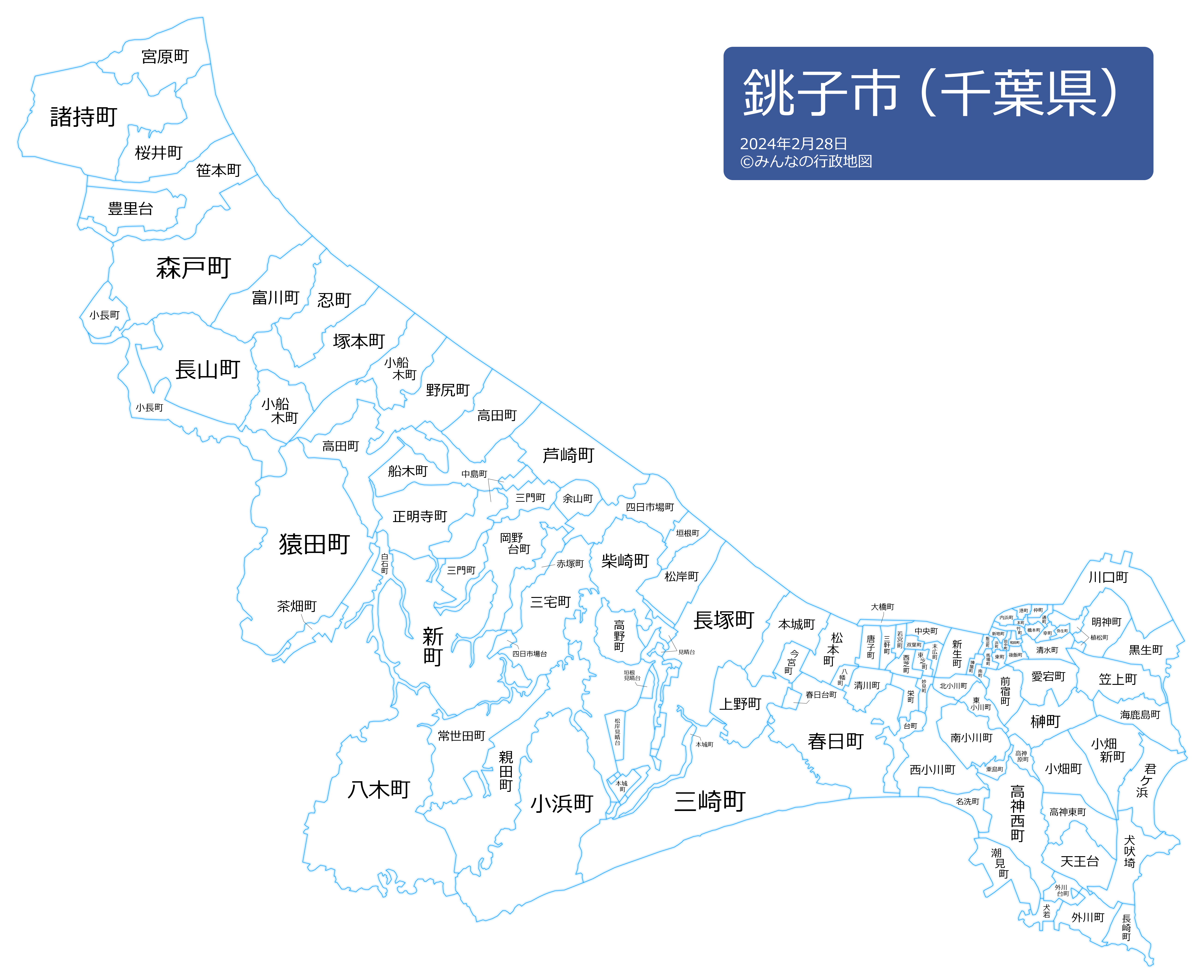 赤塚町(あかづかまち)海鹿島町(あしかじまちょう)芦崎町(あしさきちょう)愛宕町(あたごちょう)新生町(あらおいちょう)粟島町(あわしまちょう)飯沼町(いいぬまちょう)犬吠埼(いぬぼうざき)犬若(いぬわか)今宮町(いまみやちょう)上野町(うえのちょう)植松町(うえまつちょう)内浜町(うちばまちょう)大橋町(おおはしちょう)岡野台町(おかのだいちょう)小浜町(おばまちょう)親田町(おやだちょう)