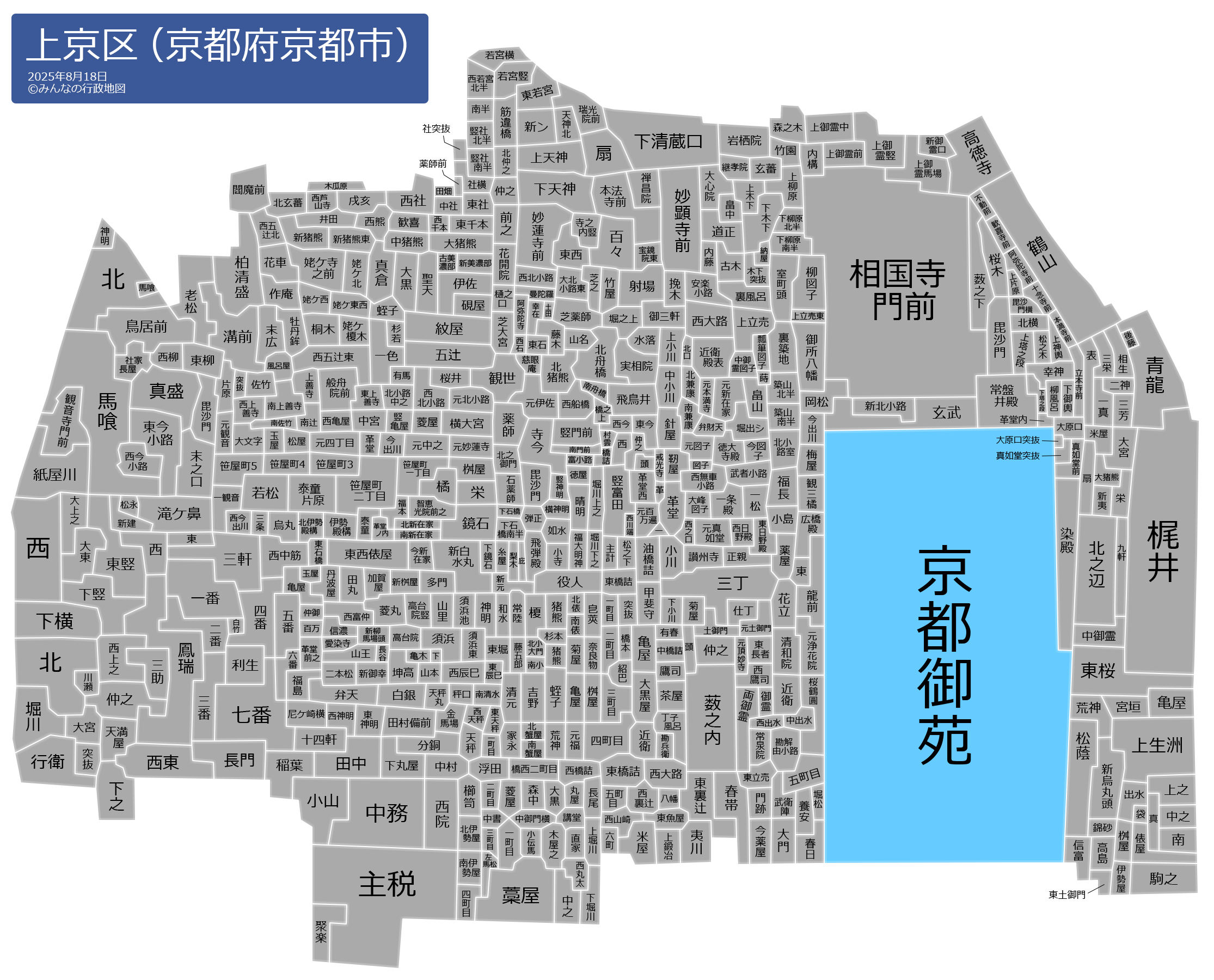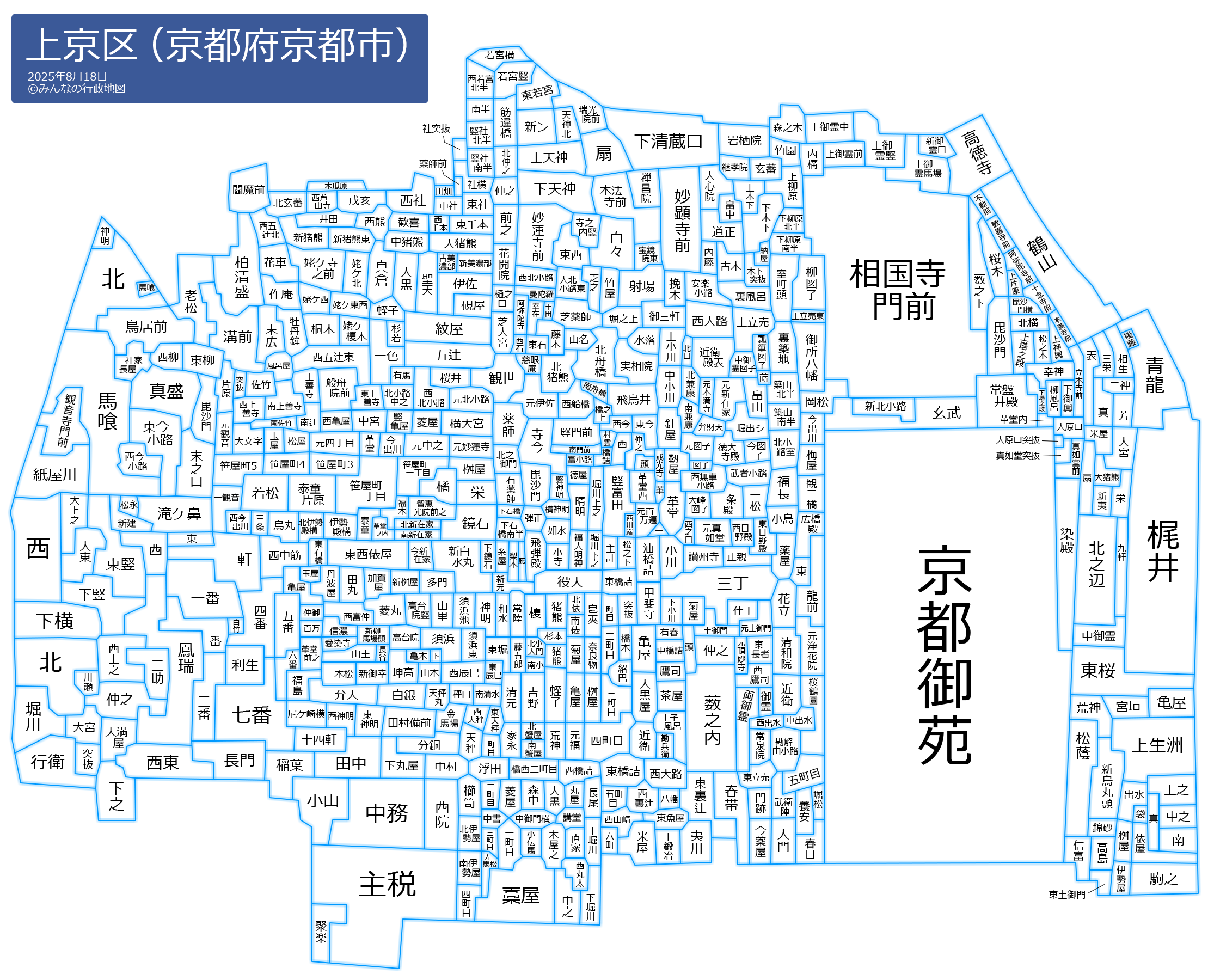 戒光寺町(かいこうじちょう)甲斐守町(かいのかみちょう)鏡石町(かがみいしちょう)加賀屋町(かがやちょう)勘解由小路町(かげゆこうじちょう)梶井町(かじいちょう)頭町(かしらちょう)柏清盛町(かしわきよもりちょう)春日町(かすがちょう)片原町(かたはらちょう)上生洲町(かみいけすちょう)上小川町(かみおがわちょう)上鍛冶町(かみかじちょう)上片原町(かみかたはらちょう)上木下町(かみきのしたちょう)上御霊竪町(かみごりょうたてまち)上御霊中町(かみごりょうなかまち)上御霊馬場町(かみごりょうばばちょう)上御霊前町(かみごりょうまえちょう)上立売町(かみだちうりちょう)上立売東町(かみだちうりひがしちょう)上天神町(かみてんじんちょう)上塔之段町(かみとうのだんちょう)上之町(かみのちょう)上堀川町(かみほりかわちょう)上神輿町(かみみこしちょう)紙屋川町(かみやがわちょう)上柳原町(かみやなぎはらちょう)亀木町(かめきちょう)亀屋町(かめやちょう)烏丸町(からすまちょう)川瀬町(かわせちょう)歓喜寺前町(かんきじまえちょう)歓喜町(かんきちょう)観三橘町(かんさんたちばなちょう)岩栖院町(がんすいんちょう)観世町(かんぜちょう)観音寺門前町(かんのんじもんぜんちょう)勘兵衛町(かんべえちょう)菊屋町(きくやちょう)北伊勢殿構町(きたいせどのかまえちょう)北伊勢屋町(きたいせやちょう)北猪熊町(きたいのくまちょう)北蟹屋町(きたかにやちょう)北兼康町(きたかねやすちょう)北玄蕃町(きたげんばちょう)北小路中之町(きたこうじなかのちょう)北小路室町(きたこうじむろまち)北小大門町(きたこだいもんちょう)北新在家町(きたしんざいけちょう)北俵町(きたたわらちょう)北仲之町(きたなかのちょう)北之御門町(きたのごもんちょう)北之辺町(きたのべちょう)北舟橋町(きたふなはしちょう)北町(きたまち)北横町(きたよこちょう)木下突抜町(きのしたつきぬけちょう)木屋之町(きやのちょう)九軒町(きゅうけんちょう)京都御苑(きょうとぎょえん)清元町(きよもとちょう)桐木町(きりのきちょう)錦砂町(きんしゃちょう)金馬場町(きんばばちょう)櫛笥町(くしげちょう)薬屋町(くすりやちょう)花開院町(けいかいんちょう)継孝院町(けいこういんちょう)玄蕃町(げんばちょう)玄武町(げんぶちょう)幸在町(こうざいちょう)荒神町(こうじんちょう)高台院竪町(こうだいいんたてまち)高台院町(こうだいいんちょう)革堂内町(こうどううちちょう)講堂町(こうどうちょう)革堂町(こうどうちょう)革堂町(こうどうちょう)革堂仲之町(こうどうなかのちょう)革堂西町(こうどうにしまち)革堂之内町(こうどうのうちちょう)革堂前之町(こうどうまえのちょう)高徳寺町(こうとくじちょう)御三軒町(ごさんげんちょう)小島町(こじまちょう)御所八幡町(ごしょはちまんちょう)五町目(ごちょうめ)五町目町(ごちょうめちょう)小寺町(こでらちょう)小伝馬町(こでんまちょう)後藤町(ごとうちょう)近衛町(このえちょう)近衛殿表町(このえでんおもてちょう)近衛殿北口町(このえでんきたぐちちょう)五番町(ごばんちょう)駒之町(こまのちょう)米屋町(こめやちょう)小山町(こやまちょう)御霊町(ごりょうちょう)坤高町(こんたかちょう)