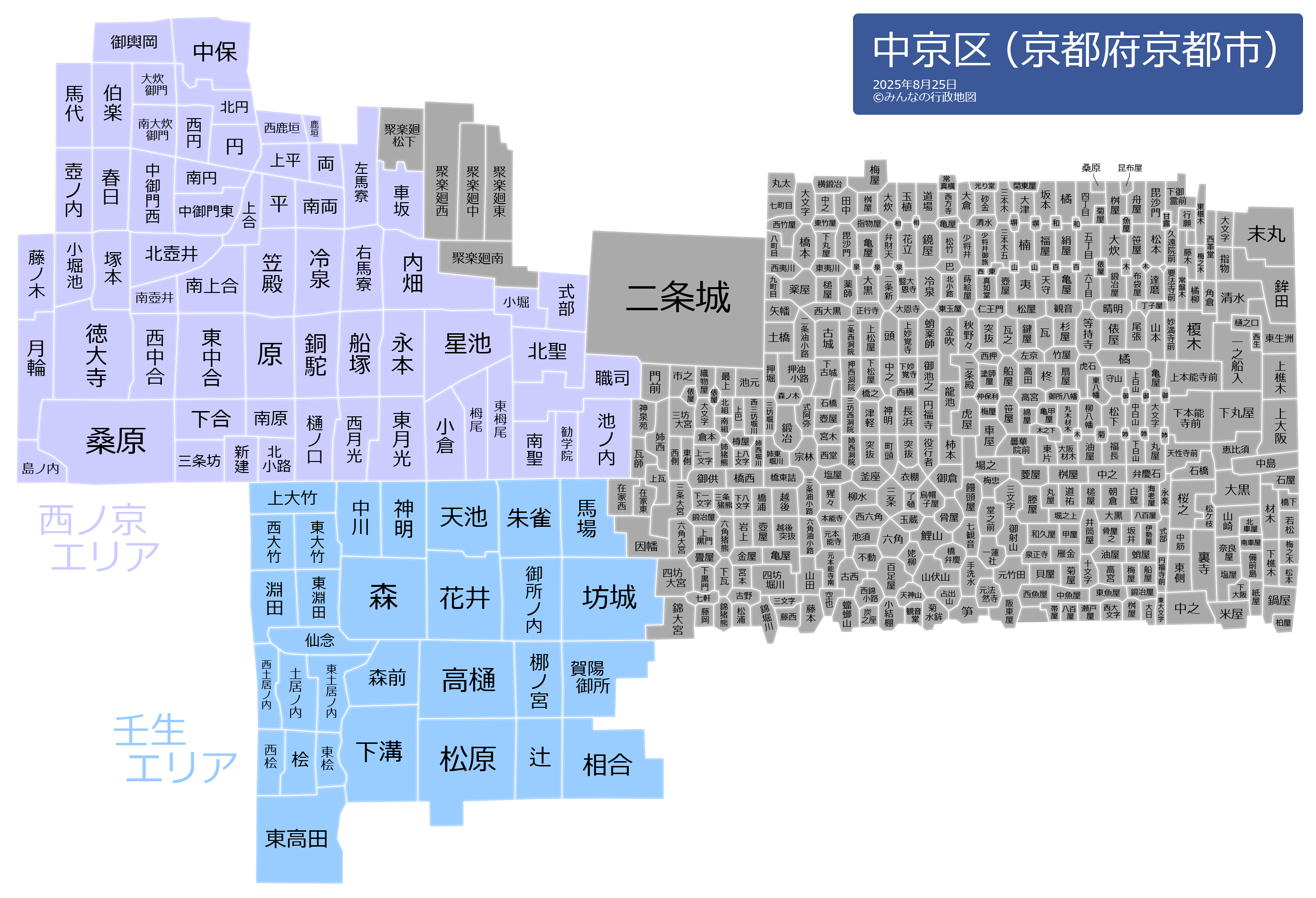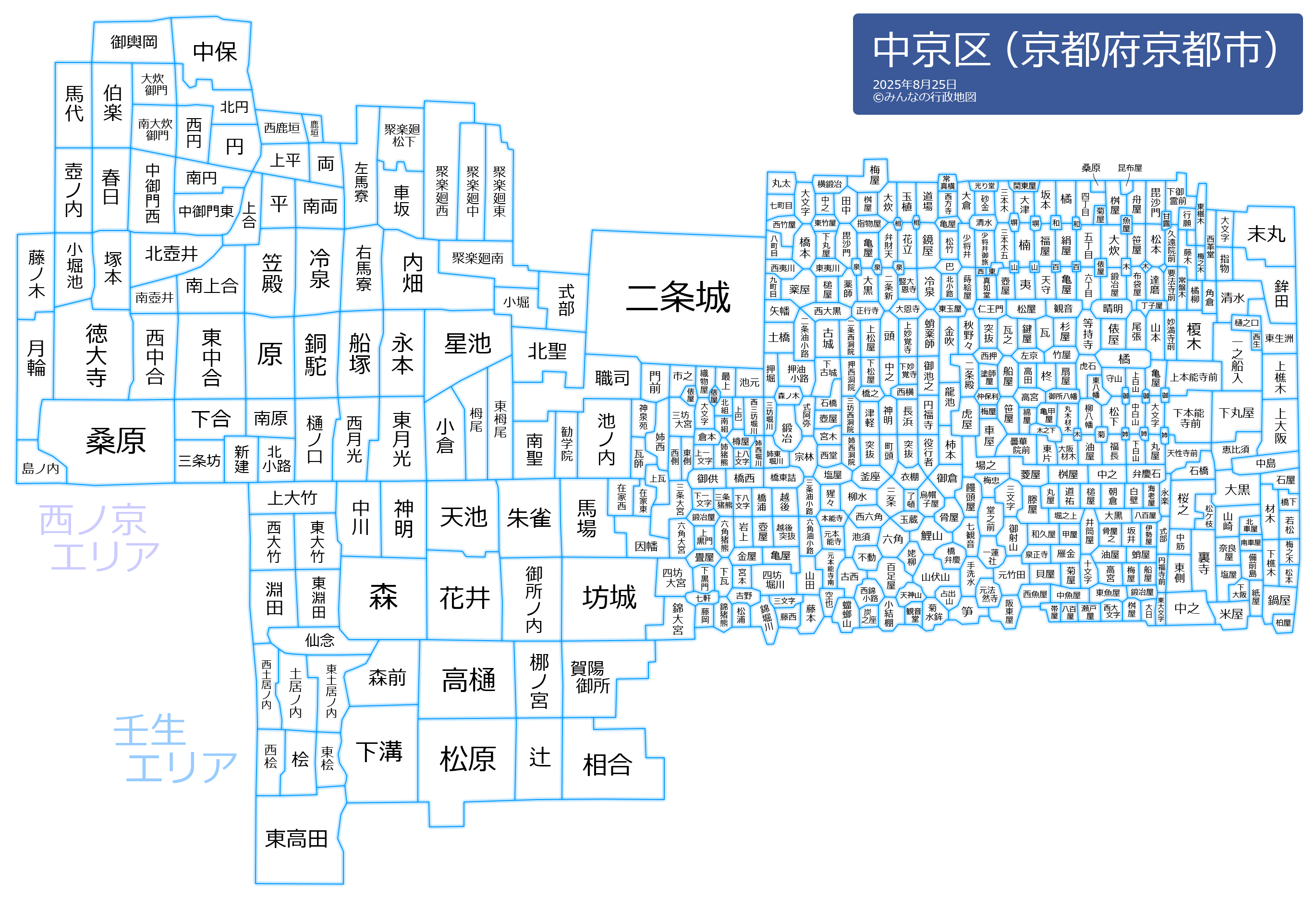 中魚屋町(なかうおやちょう)中島町(なかじまちょう)中筋町(なかすじちょう)中之町(なかのちょう)中白山町(なかはくさんちょう)長浜町(ながはまちょう)仲保利町(なかほりちょう)七町目(ななちょうめ)鍋屋町(なべやちょう)奈良屋町(ならやちょう)仁王門町(におうもんちょう)仁王門突抜町(におうもんつきぬけちょう)西生洲町(にしいけすちょう)西魚屋町(にしうおやちょう)西夷川町(にしえびすがわちょう)西押小路町(にしおしこうじちょう)錦猪熊町(にしきいのくまちょう)錦大宮町(にしきおおみやちょう)錦堀川町(にしきほりかわちょう)西九軒町(にしきゅうけんちょう)西革堂町(にしこうどうちょう)西三坊堀川町(にしさんぼうほりかわちょう)西大黒町(にしだいこくちょう)西大文字町(にしだいもんじちょう)西竹屋町(にしたけやちょう)西錦小路町(にしにしきこうじちょう)西ノ京池ノ内町(にしのきょういけのうちちょう)西ノ京内畑町(にしのきょううちはたちょう)西ノ京右馬寮町(にしのきょううまりょうちょう)西ノ京円町(にしのきょうえんまち)西ノ京大炊御門町(にしのきょうおおいごもんちょう)西ノ京小倉町(にしのきょうおぐらちょう)西ノ京笠殿町(にしのきょうかさどのちょう)西ノ京春日町(にしのきょうかすがちょう)西ノ京上合町(にしのきょうかみあいちょう)西ノ京上平町(にしのきょうかみひらちょう)西ノ京勧学院町(にしのきょうかんがくいんちょう)西ノ京北円町(にしのきょうきたえんまち)西ノ京北小路町(にしのきょうきたこうじちょう)西ノ京北壺井町(にしのきょうきたつぼいちょう)西ノ京車坂町(にしのきょうくるまざかちょう)西ノ京桑原町(にしのきょうくわばらちょう)西ノ京小堀池町(にしのきょうこぼりいけちょう)西ノ京小堀町(にしのきょうこぼりちょう)西ノ京左馬寮町(にしのきょうさまりょうちょう)西ノ京三条坊町(にしのきょうさんじょうぼうちょう)西ノ京鹿垣町(にしのきょうしかがきちょう)西ノ京式部町(にしのきょうしきぶちょう)西ノ京島ノ内町(にしのきょうしまのうちちょう)西ノ京下合町(にしのきょうしもあいちょう)西ノ京職司町(にしのきょうしょくしちょう)西ノ京新建町(にしのきょうしんだてちょう)西ノ京塚本町(にしのきょうつかもとちょう)西ノ京月輪町(にしのきょうつきのわちょう)西ノ京壺ノ内町(にしのきょうつぼのうちちょう)西ノ京銅駝町(にしのきょうどうだちょう)西ノ京栂尾町(にしのきょうとがのおちょう)西ノ京徳大寺町(にしのきょうとくだいじちょう)西ノ京中保町(にしのきょうなかほちょう)西ノ京中御門西町(にしのきょうなかみかどにしまち)西ノ京中御門東町(にしのきょうなかみかどひがしまち)西ノ京永本町(にしのきょうながもとちょう)西ノ京南聖町(にしのきょうなんせいちょう)西ノ京西円町(にしのきょうにしえんまち)西ノ京西月光町(にしのきょうにしげつこうちょう)西ノ京西鹿垣町(にしのきょうにししかがきちょう)西ノ京西中合町(にしのきょうにしなかあいちょう)西ノ京伯楽町(にしのきょうはくらくちょう)西ノ京馬代町(にしのきょうばだいちょう)西ノ京原町(にしのきょうはらまち)西ノ京東月光町(にしのきょうひがしげっこうちょう)西ノ京東栂尾町(にしのきょうひがしとがのおちょう)西ノ京東中合町(にしのきょうひがしなかあいちょう)西ノ京樋ノ口町(にしのきょうひのくちちょう)西ノ京平町(にしのきょうひらまち)西ノ京藤ノ木町(にしのきょうふじのきちょう)西ノ京船塚町(にしのきょうふなづかちょう)西ノ京北聖町(にしのきょうほくせいちょう)西ノ京星池町(にしのきょうほしがいけちょう)西ノ京御輿岡町(にしのきょうみこしがおかちょう)西ノ京南円町(にしのきょうみなみえんまち)西ノ京南大炊御門町(にしのきょうみなみおおいごもんちょう)西ノ京南上合町(にしのきょうみなみかみあいちょう)西ノ京南壺井町(にしのきょうみなみつぼいちょう)西ノ京南原町(にしのきょうみなみはらまち)西ノ京南両町(にしのきょうみなみりょうまち)西ノ京両町(にしのきょうりょうまち)西ノ京冷泉町(にしのきょうれいせんちょう)二条油小路町(にじょうあぶらのこうじちょう)二条新町(にじょうしんちょう)二条城町(にじょうじょうちょう)二条殿町(にじょうでんちょう)二条西洞院町(にじょうにしのとういんちょう)西横町(にしよこちょう)西六角町(にしろっかくちょう)塗師屋町(ぬしやちょう)