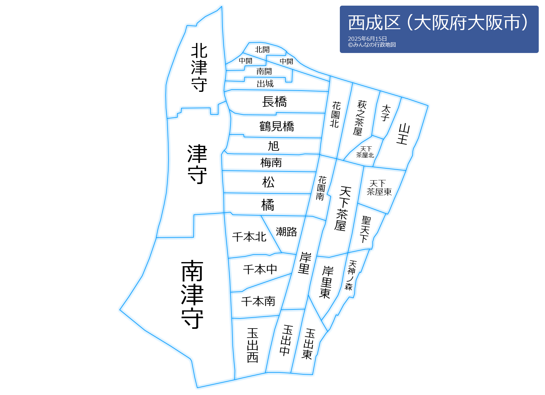 太子(たいし)橘(たちばな)玉出中(たまでなか)玉出東(たまでひがし)玉出西(たまでにし)津守(つもり)鶴見橋(つるみばし)出城(でしろ)天下茶屋(てんがちゃや)天下茶屋東(てんがちゃやひがし)天下茶屋北(てんがちゃやきた)天神ノ森(てんじんのもり)