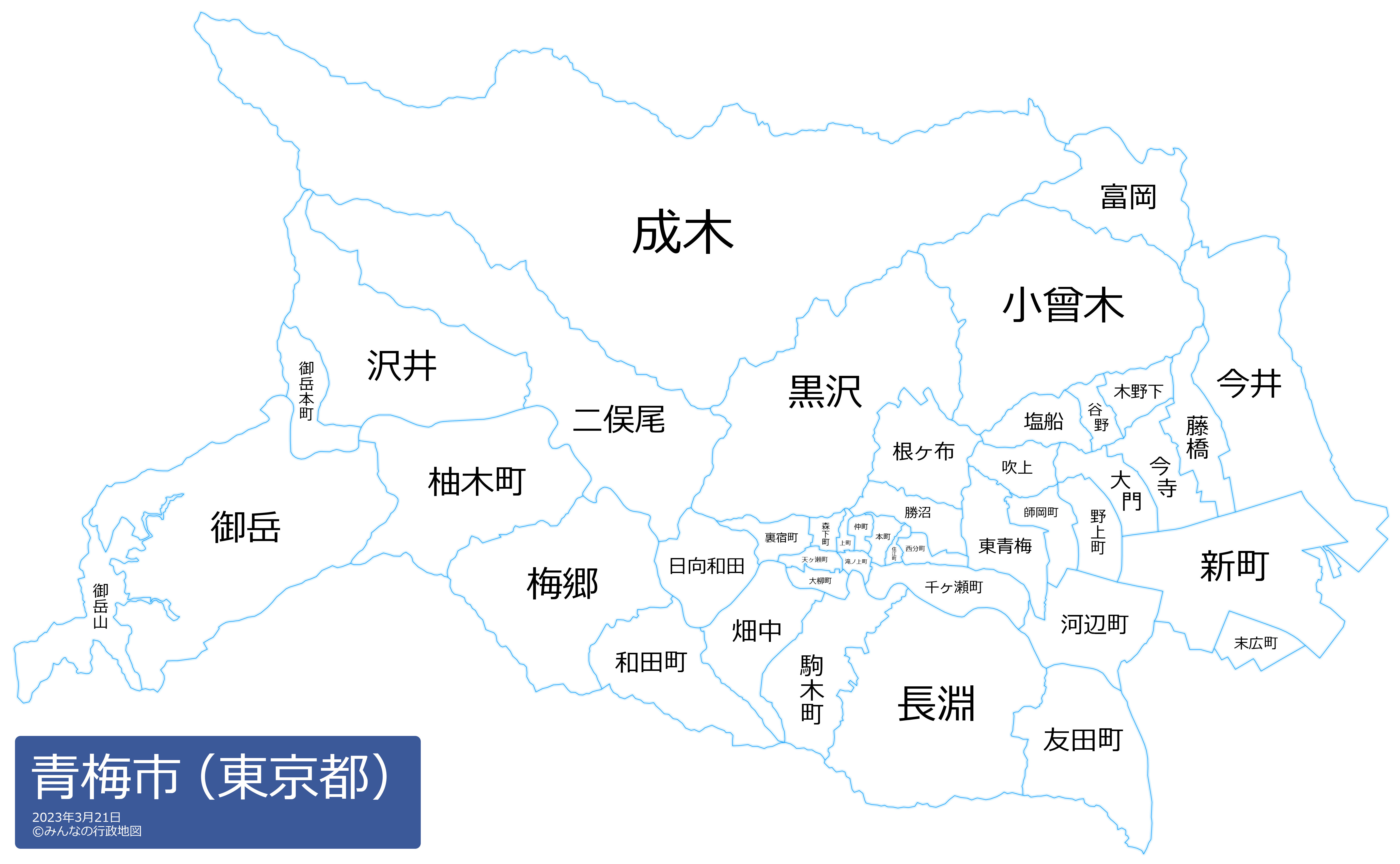 梅郷(ばいごう)畑中(はたなか)東青梅(ひがしおうめ)日向和田(ひなたわだ)吹上(ふきあげ)藤橋(ふじはし)二俣尾(ふたまたお)本町(ほんちょう)
