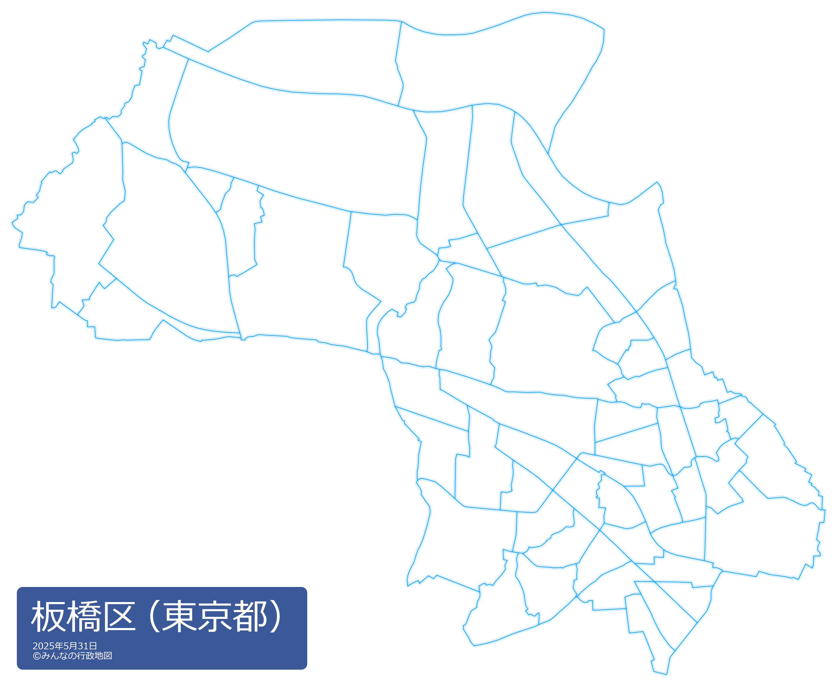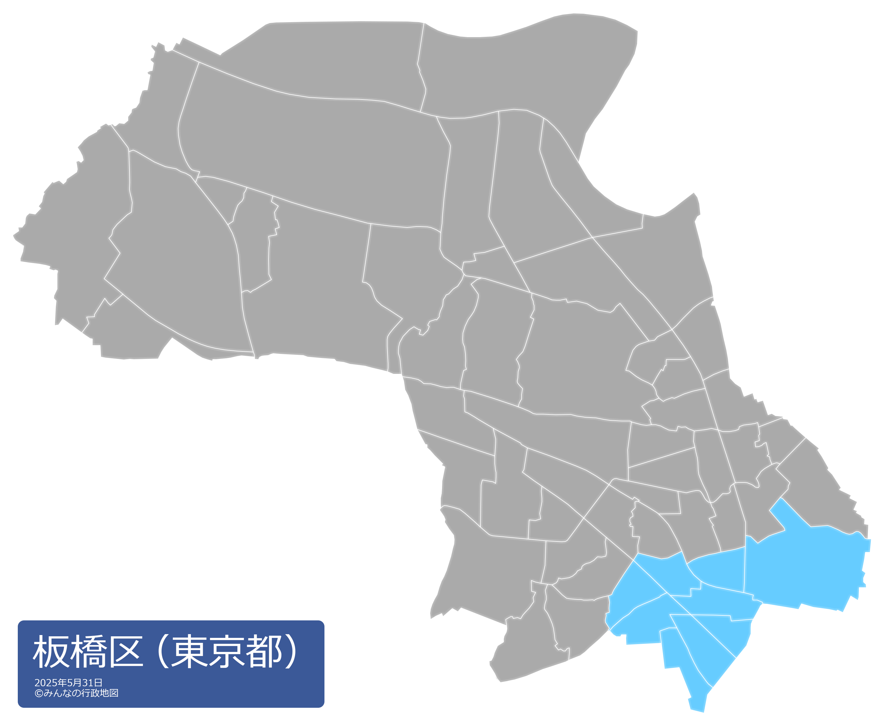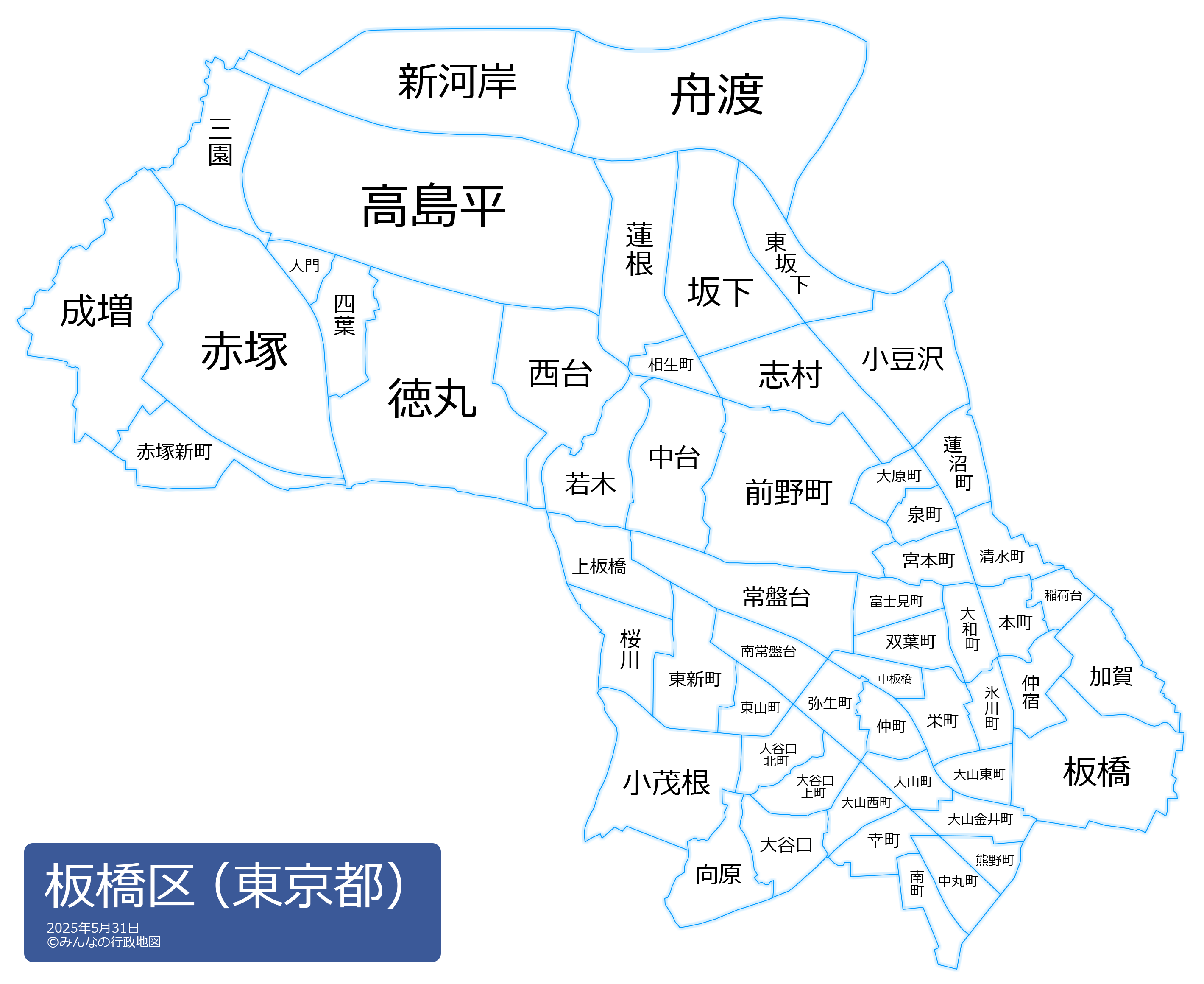 相生町(あいおいちょう)赤塚(あかつか)赤塚新町(あかつかしんまち)小豆沢(あずさわ)泉町(いずみちょう)板橋(いたばし)稲荷台(いなりだい)大原町(おおはらちょう)大谷口(おおやぐち)大谷口上町(おおやぐちかみちょう)大谷口北町(おおやぐちきたちょう)大山金井町(おおやまかないちょう)大山東町(おおやまひがしちょう)大山西町(おおやまにしちょう)大山町(おおやまちょう)
