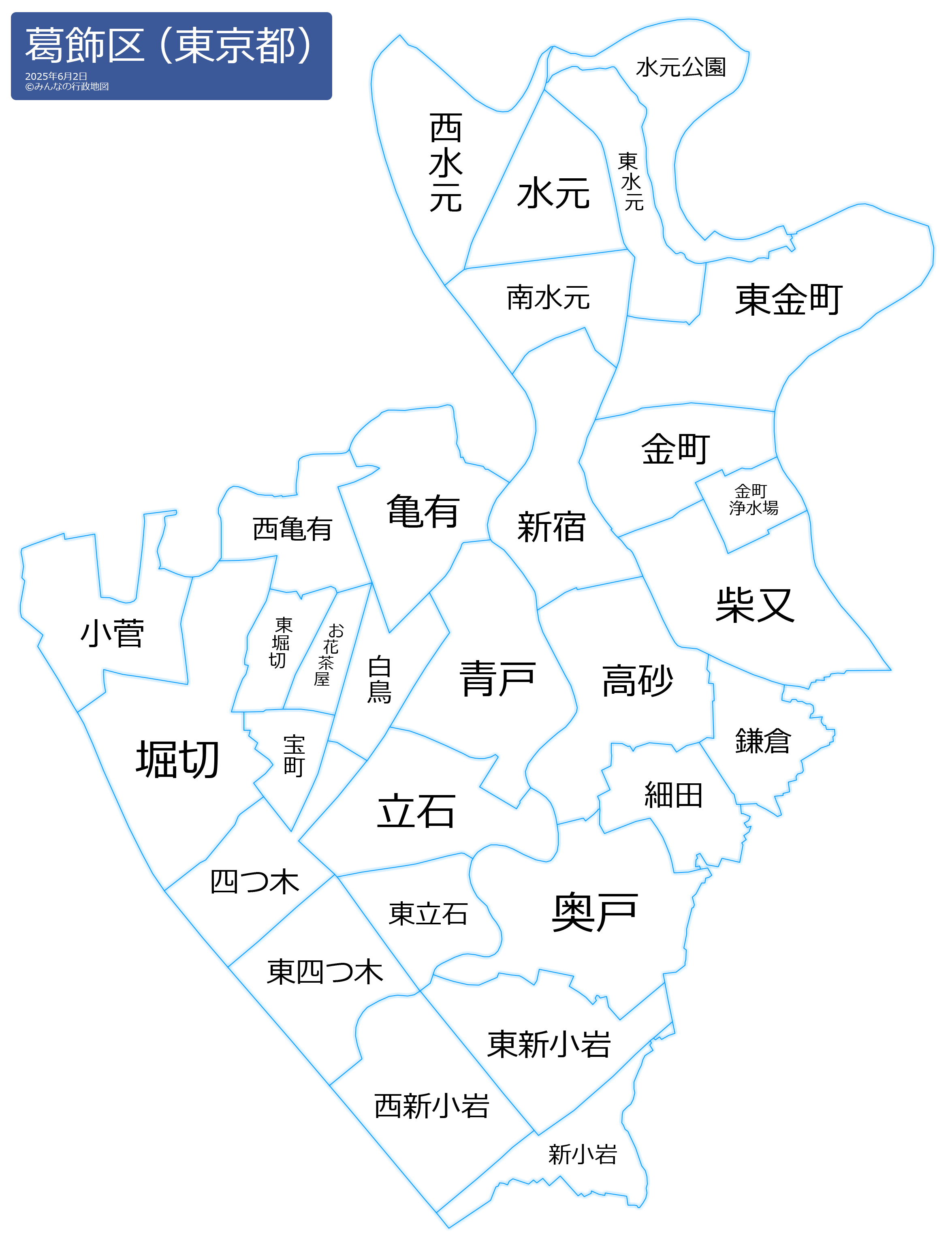 東金町(ひがしかなまち)東新小岩(ひがししんこいわ)東立石(ひがしたていし)東堀切(ひがしほりきり)東水元(ひがしみずもと)東四つ木(ひがしよつぎ)細田(ほそだ)堀切(ほりきり)