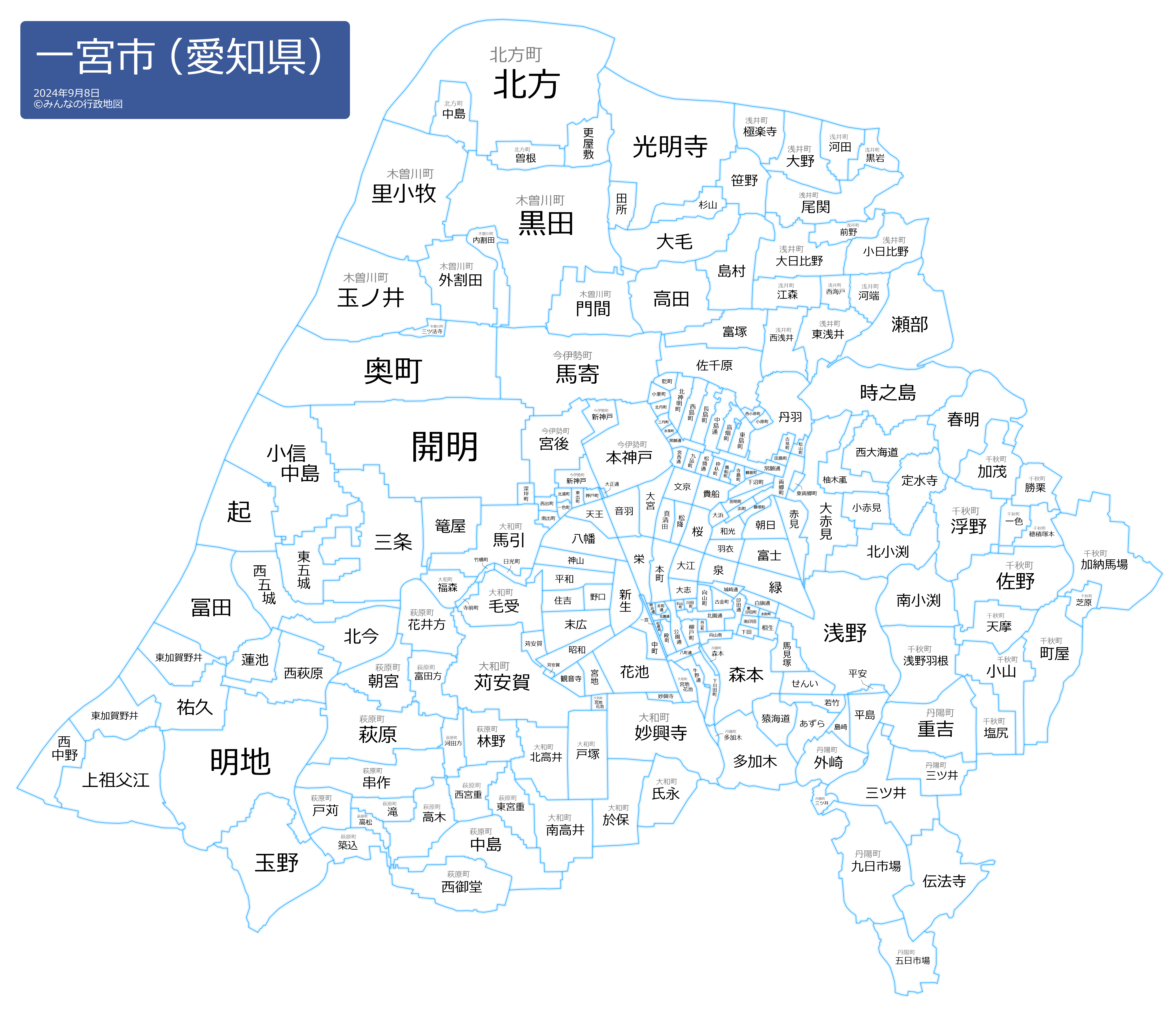 相生(あいおい)赤見(あかみ)浅野(あさの)朝日(あさひ)浅井町江森(あざいちょうえもり)浅井町大野(あざいちょうおおの)浅井町大日比野(あざいちょうおおひびの)浅井町尾関(あざいちょうおぜき)浅井町黒岩(あざいちょうくろいわ)浅井町河田(あざいちょうこうだ)浅井町河端(あざいちょうこうばた)浅井町小日比野(あざいちょうこひびの)浅井町極楽寺(あざいちょうごくらくじ)浅井町東浅井(あざいちょうひがしあざい)浅井町西浅井(あざいちょうにしあざい)浅井町西海戸(あざいちょうにしがいど)浅井町前野(あざいちょうまえの)あずら(あずら)一色町(いしきちょう)石山町(いしやまちょう)泉(いずみ)一宮(いちのみや)乾町(いぬいちょう)今伊勢町馬寄(いまいせちょううまよせ)今伊勢町新神戸(いまいせちょうしんかんべ)今伊勢町本神戸(いまいせちょうほんかんべ)今伊勢町宮後(いまいせちょうみやうしろ)印田通(いんでんどおり)牛野通(うしのどおり)大赤見(おおあかみ)大江(おおえ)大毛(おおけ)大浜(おおはま)大宮(おおみや)奥町(おくちょう)小栗町(おぐりちょう)起(おこし)音羽(おとわ)小原町(おはらちょう)