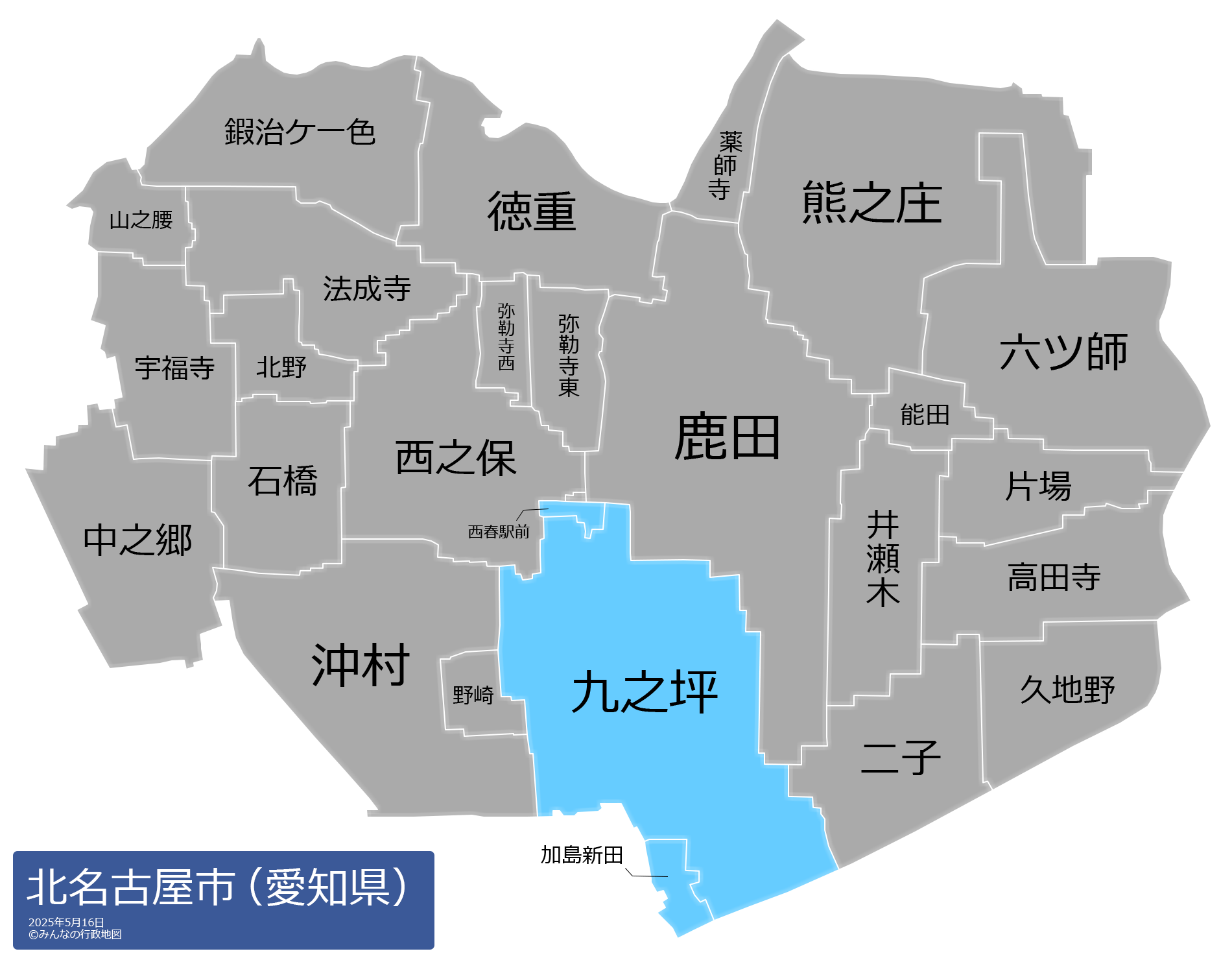 鍜治ケ一色(かじがいしき)加島新田(かしましんでん)片場(かたば)北野(きたの)久地野(くじの)九之坪(くのつぼ)熊之庄(くまのしょう)