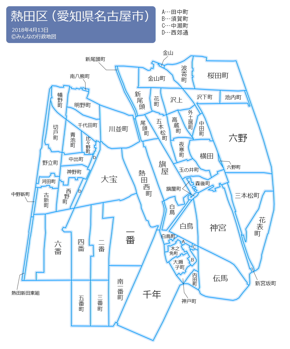 青池町(あおいけちょう)明野町(あけのちょう)熱田新田東組(あつたしんでんひがしぐみ)熱田西町(あつたにしまち)池内町(いけうちちょう)一番(いちばん)内田町(うちだちょう)大瀬子町(おおせこちょう)尾頭町(おとうちょう)