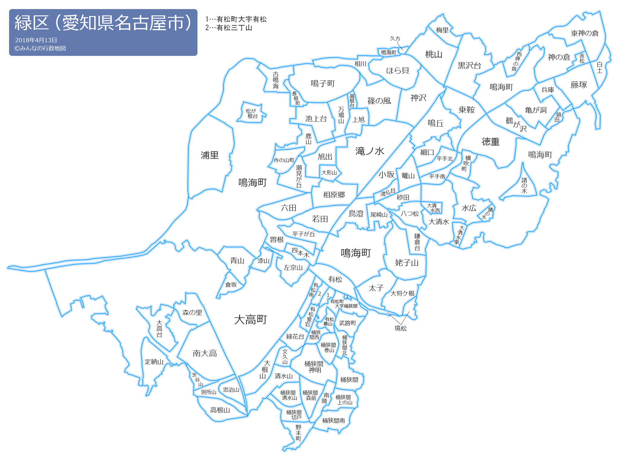 相川(あいかわ)相原郷(あいばらごう)青山(あおやま)赤松(あかまつ)旭出(あさひで)有松(ありまつ)有松愛宕(ありまつあたご)有松三丁山(ありまつさんちょうやま)有松町有松(ありまつちょうありまつ)有松町桶狭間(ありまつちょうおけはざま)有松幕山(ありまつまくやま)有松南(ありまつみなみ)池上台(いけがみだい)茨谷山(いばらだにやま)姥子山(うばこやま)梅里(うめさと)浦里(うらさと)漆山(うるしやま)大形山(おおがたやま)大清水(おおしみず)大清水西(おおしみずにし)大清水東(おおしみずひがし)大高台(おおだかだい)大高町(おおだかちょう)大根山(おおねやま)桶狭間(おけはざま)桶狭間上の山(おけはざまうえのやま)桶狭間北(おけはざまきた)桶狭間切戸(おけはざまきりと)桶狭間清水山(おけはざましみずやま)桶狭間神明(おけはざましんめい)桶狭間西(おけはざまにし)桶狭間巻山(おけはざままきやま)桶狭間南(おけはざまみなみ)桶狭間森前(おけはざまもりまえ)尾崎山(おざきやま)