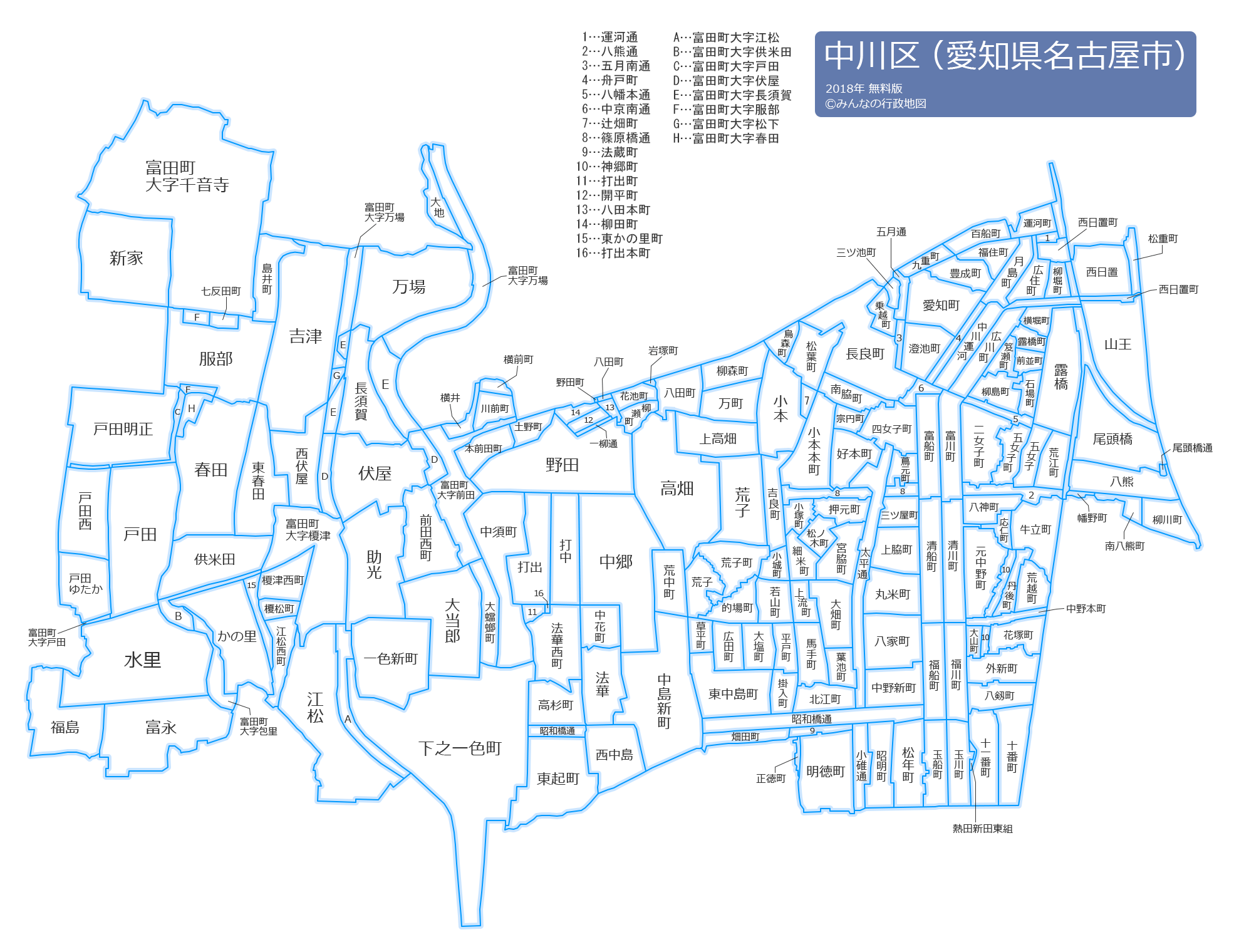 愛知町(あいちちょう)熱田新田東組(あつたしんでんひがしぐみ)荒江町(あらえちょう)荒子(あらこ)荒越町(あらこしちょう)荒子町(あらこちょう)荒中町(あらなかちょう)一色新町(いしきしんまち)石場町(いしばちょう)一柳通(いちやなぎどおり)岩塚町(いわつかちょう)牛立町(うしだてちょう)打出(うちで)打出町(うちでちょう)打出本町(うちでほんまち)打中(うちなか)馬手町(うまてちょう)運河町(うんがちょう)運河通(うんがとおり)榎津西町(えのきづにしまち)榎松町(えのきまつちょう)江松(えまつ)江松西町(えまつにしまち)笈瀬町(おいせちょう)応仁町(おうじんちょう)大塩町(おおしおちょう)大畑町(おおはたちょう)大山町(おおやまちょう)押元町(おしもとちょう)尾頭橋(おとうばし)小本町(おもとちょう)