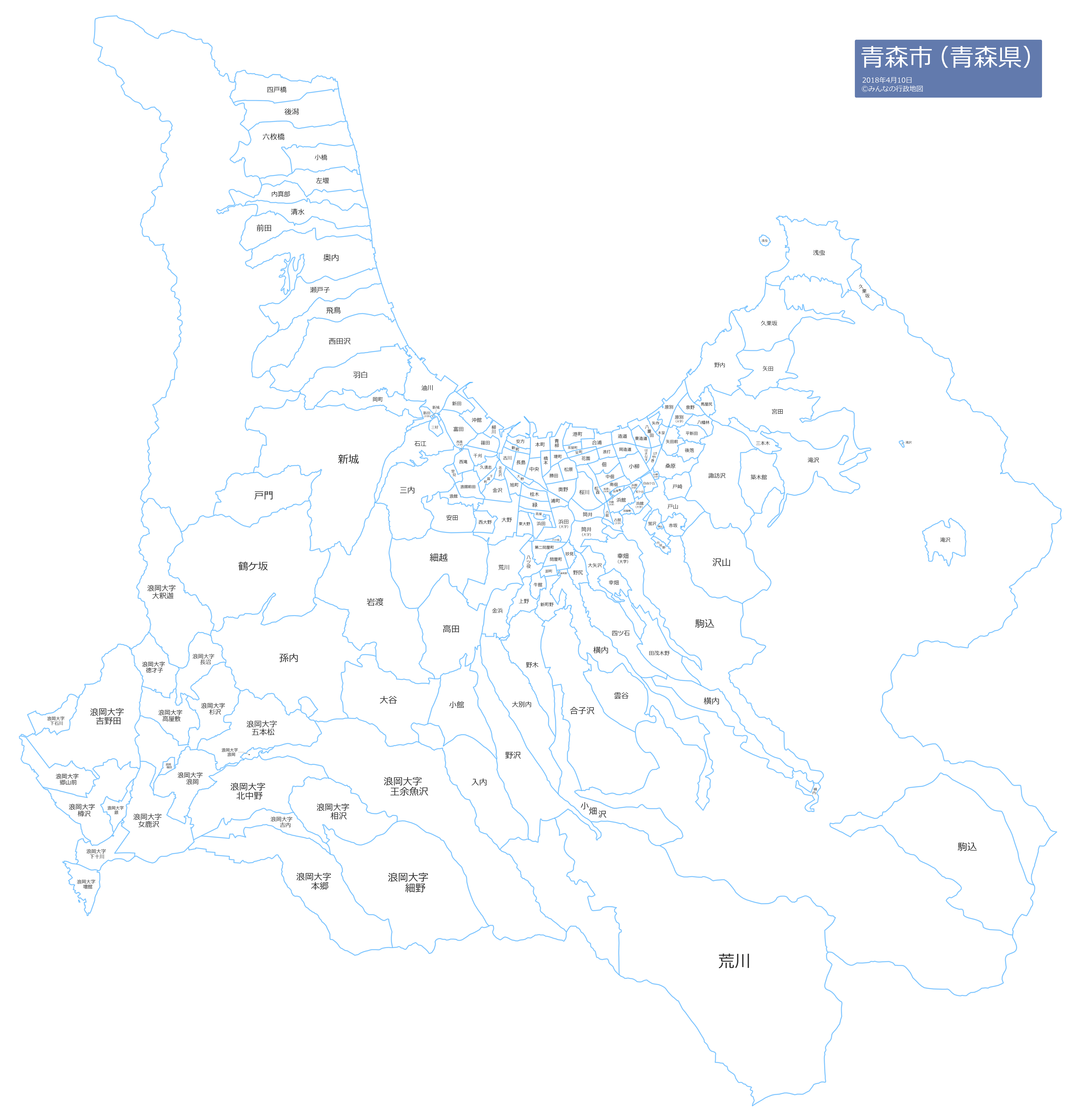 青葉(あおば)青柳(あおやぎ)赤坂(あかさか)旭町(あさひちょう)浅虫(あさむし)飛鳥(あすか)油川(あぶらかわ)荒川(あらかわ)石江(いしえ)泉野(いずみの)岩渡(いわたり)牛館(うしたて)後潟(うしろがた)後萢(うしろやち)内真部(うちまんぺ)浦町(うらまち)上野(うわの)大谷(おおたに)大野(おおの)大別内(おおべつない)大矢沢(おおやさわ)岡造道(おかつくりみち)岡町(おかまち)沖館(おきだて)奥内(おくない)奥野(おくの)小畑沢(おばたけざわ)卸町(おろしまち)