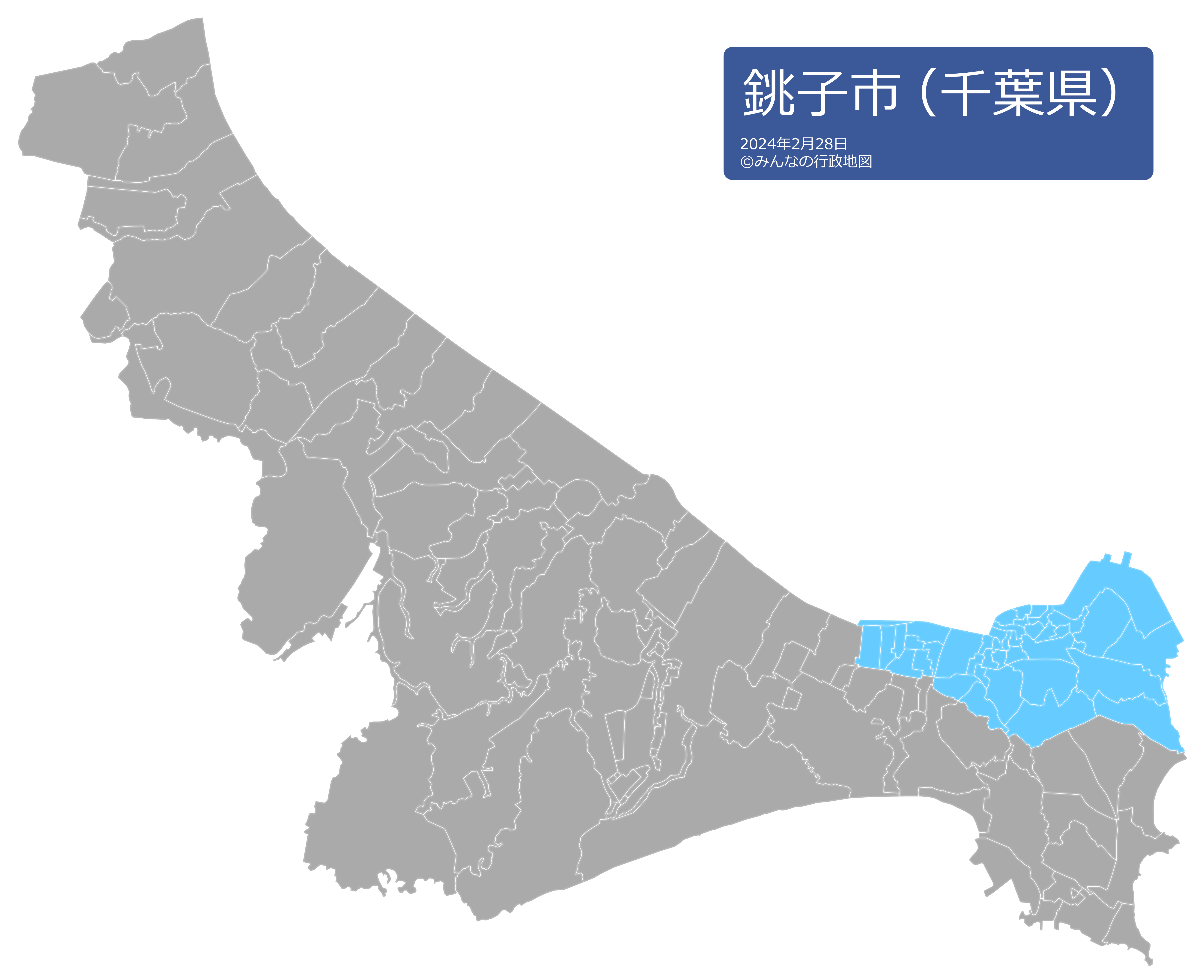 赤塚町(あかづかまち)海鹿島町(あしかじまちょう)芦崎町(あしさきちょう)愛宕町(あたごちょう)新生町(あらおいちょう)粟島町(あわしまちょう)飯沼町(いいぬまちょう)犬吠埼(いぬぼうざき)犬若(いぬわか)今宮町(いまみやちょう)上野町(うえのちょう)植松町(うえまつちょう)内浜町(うちばまちょう)大橋町(おおはしちょう)岡野台町(おかのだいちょう)小浜町(おばまちょう)親田町(おやだちょう)