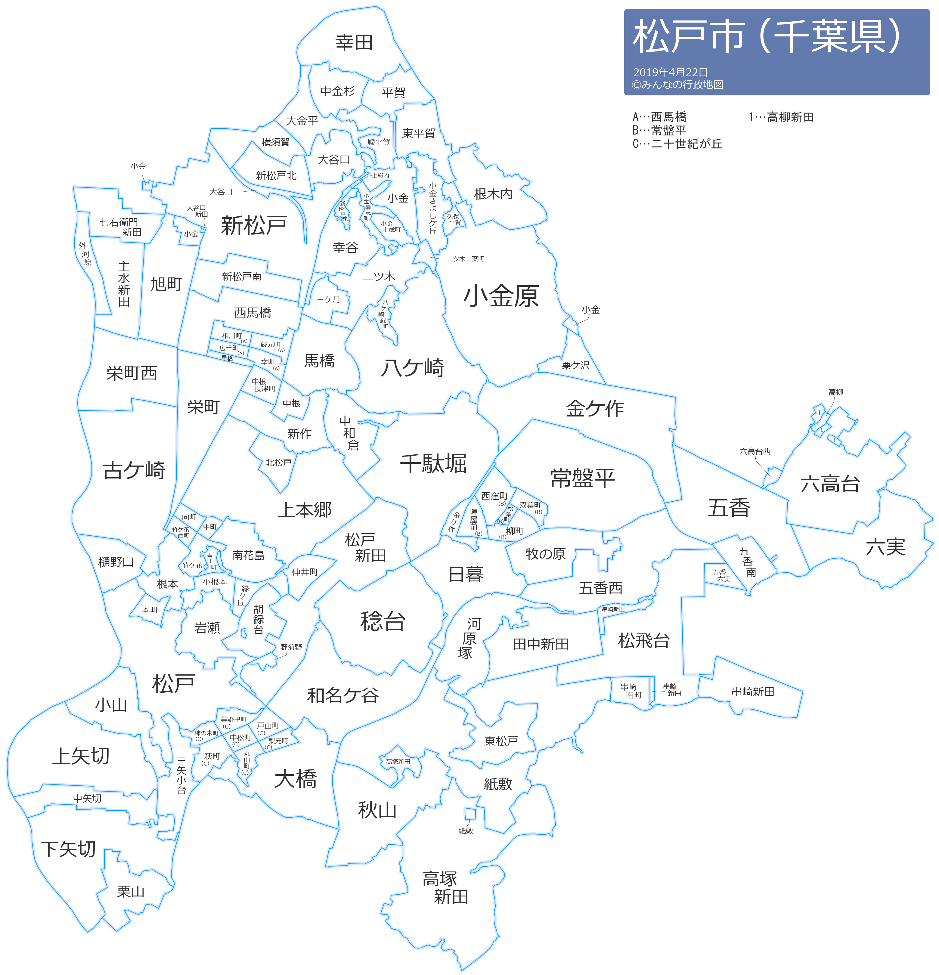 栄町(さかえちょう)栄町西(さかえちょうにし)七右衛門新田(しちうえもんしんでん)下矢切(しもやきり)新作(しんざく)新松戸(しんまつど)新松戸東(しんまつどひがし)新松戸南(しんまつどみなみ)新松戸北(しんまつどきた)千駄堀(せんだぼり)