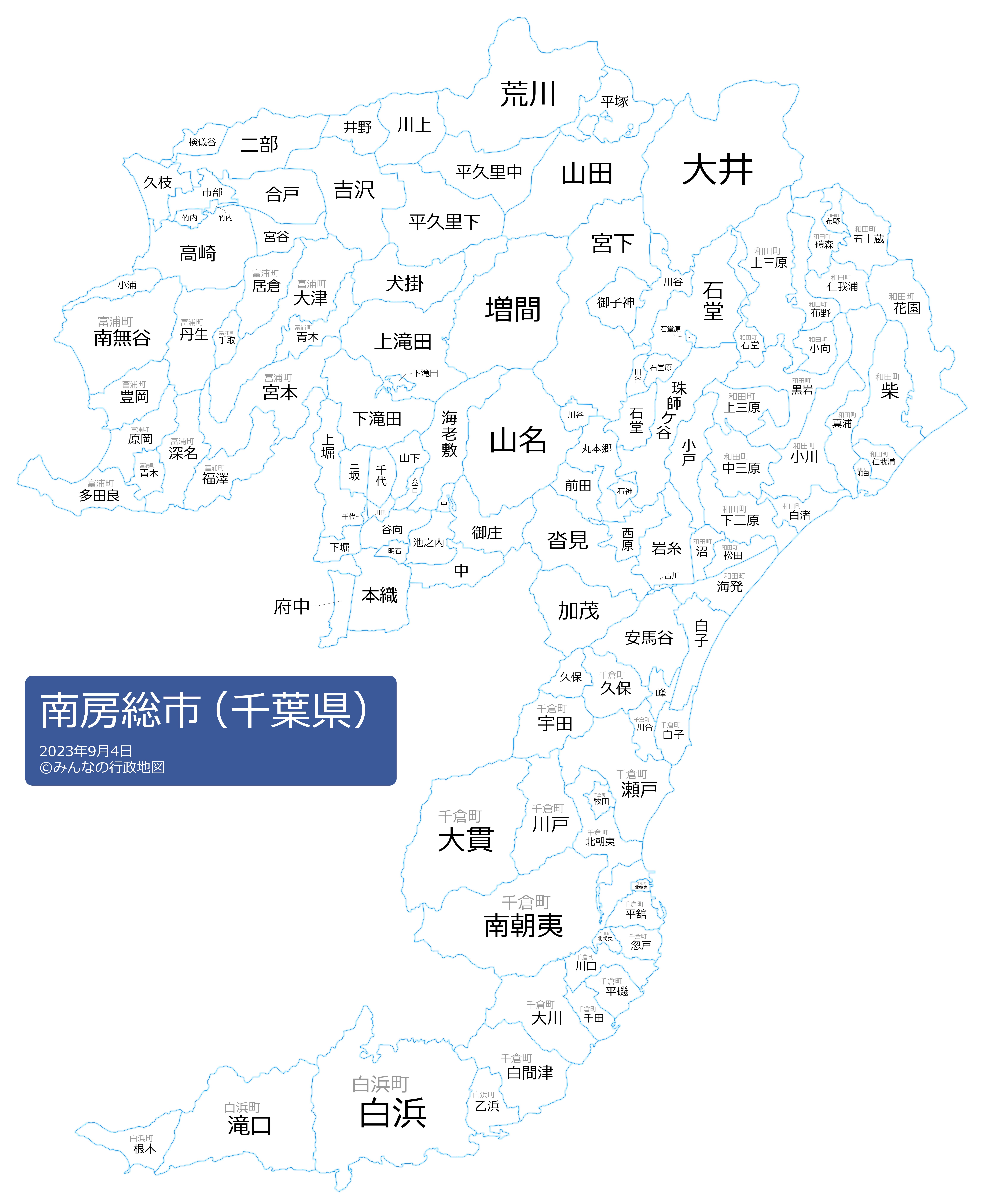 高崎(たかさき)竹内(たけのうち)千倉町宇田(ちくらちょううだ)千倉町大川(ちくらちょうおおかわ)千倉町大貫(ちくらちょうおおぬき)千倉町川合(ちくらちょうかわい)千倉町川口(ちくらちょうかわぐち)千倉町川戸(ちくらちょうかわと)千倉町北朝夷(ちくらちょうきたあさい)千倉町久保(ちくらちょうくぼ)千倉町忽戸(ちくらちょうこっと)千倉町白子(ちくらちょうしらこ)千倉町白間津(ちくらちょうしらまづ)千倉町瀬戸(ちくらちょうせと)千倉町千田(ちくらちょうせんだ)千倉町平磯(ちくらちょうひらいそ)千倉町平舘(ちくらちょうへだて)千倉町牧田(ちくらちょうまきだ)千倉町南朝夷(ちくらちょうみなみあさい)富浦町青木(とみうらちょうあおき)富浦町居倉(とみうらちょういぐら)富浦町大津(とみうらちょうおおつ)富浦町多田良(とみうらちょうただら)富浦町手取(とみうらちょうてどり)富浦町豊岡(とみうらちょうとよおか)富浦町南無谷(とみうらちょうなむや)富浦町丹生(とみうらちょうにゅう)富浦町原岡(とみうらちょうはらおか)富浦町深名(とみうらちょうふかな)富浦町福澤(とみうらちょうふくざわ)富浦町宮本(とみうらちょうみやもと)