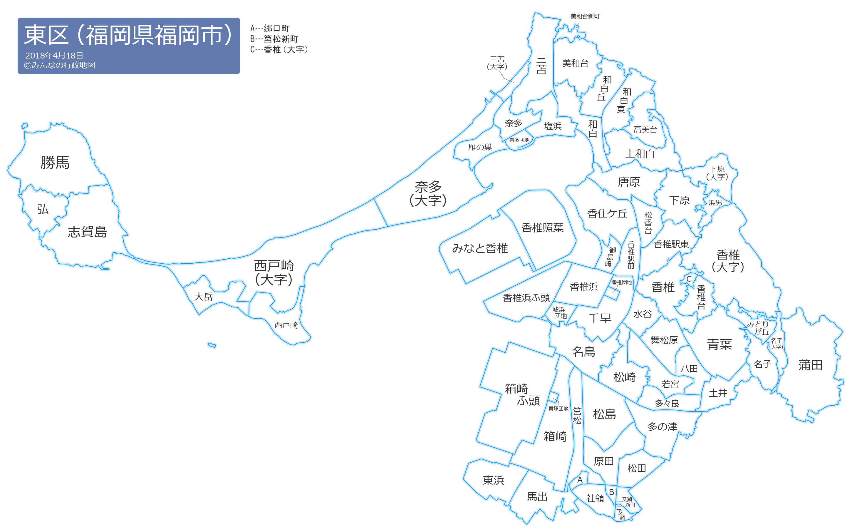 貝塚団地(かいづかだんち)香椎(かしい)香椎駅前(かしいえきまえ)香椎駅東(かしいえきひがし)香椎台(かしいだい)香椎団地(かしいだんち)香椎照葉(かしいてりは)香椎浜(かしいはま)香椎浜ふ頭(かしいはまふとう)香住ケ丘(かすみがおか)勝馬(かつま)蒲田(かまた)上和白(かみわじろ)雁の巣(がんのす)郷口町(ごうぐちまち)
