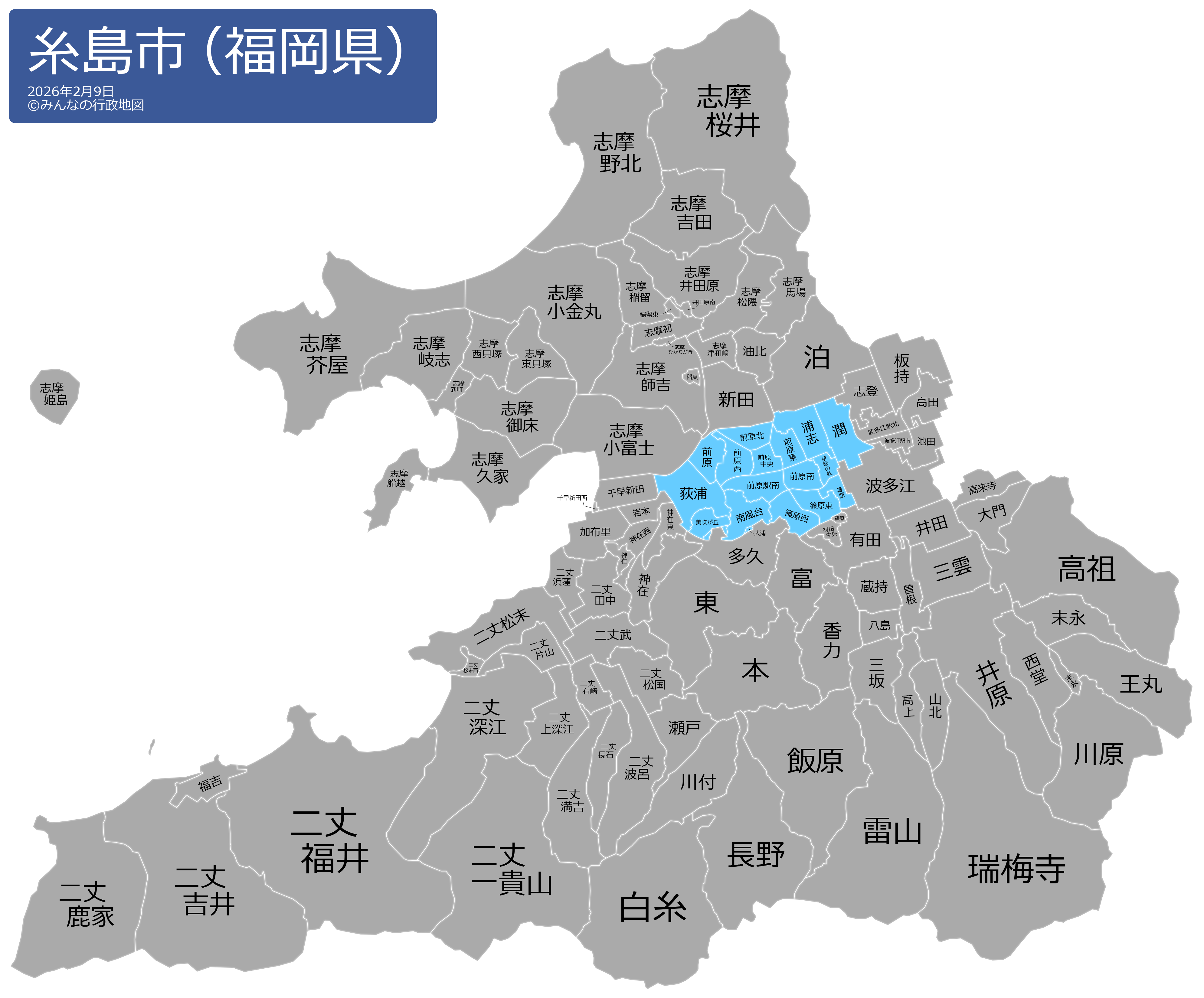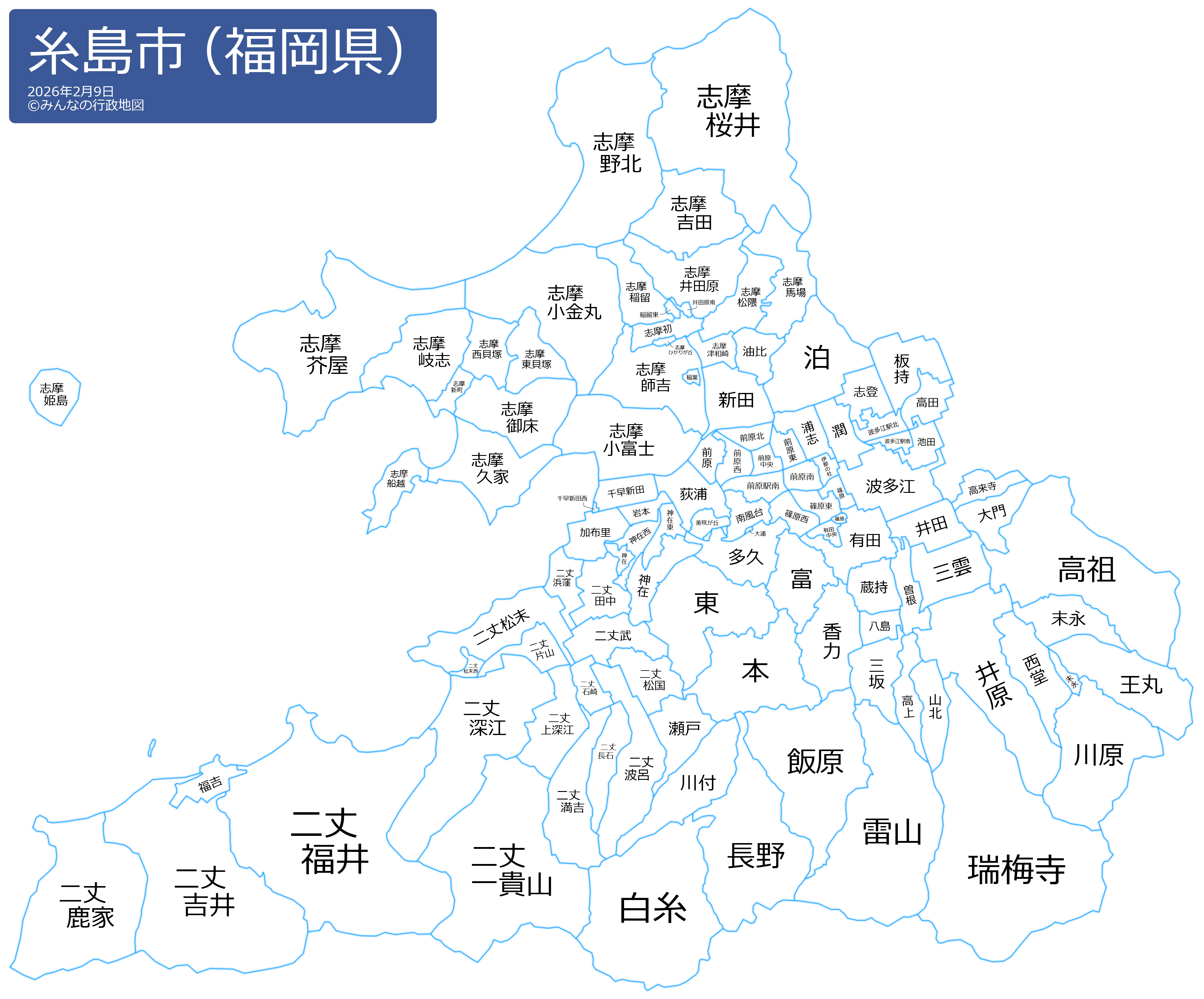 志登(しと)篠原(しのわら)篠原西(しのわらにし)篠原東(しのわらひがし)志摩井田原(しまいだわら)志摩井田原南(しまいだわらみなみ)志摩稲留(しまいなどめ)志摩稲留東(しまいなどめひがし)志摩稲葉(しまいなば)志摩岐志(しまきし)志摩久家(しまくが)志摩芥屋(しまけや)志摩小金丸(しまこがねまる)志摩小富士(しまこふじ)志摩桜井(しまさくらい)志摩新町(しましんまち)志摩津和崎(しまつわざき)志摩西貝塚(しまにしかいづか)志摩野北(しまのぎた)志摩初(しまはつ)志摩馬場(しまばば)志摩東貝塚(しまひがしかいづか)志摩ひかりが丘(しまひかりがおか)志摩姫島(しまひめしま)志摩船越(しまふなこし)志摩松隈(しままつぐま)志摩御床(しまみとこ)志摩師吉(しまもろよし)志摩吉田(しまよしだ)白糸(しらいと)新田(しんでん)瑞梅寺(ずいばいじ)末永(すえなが)瀬戸(せと)曽根(そね)