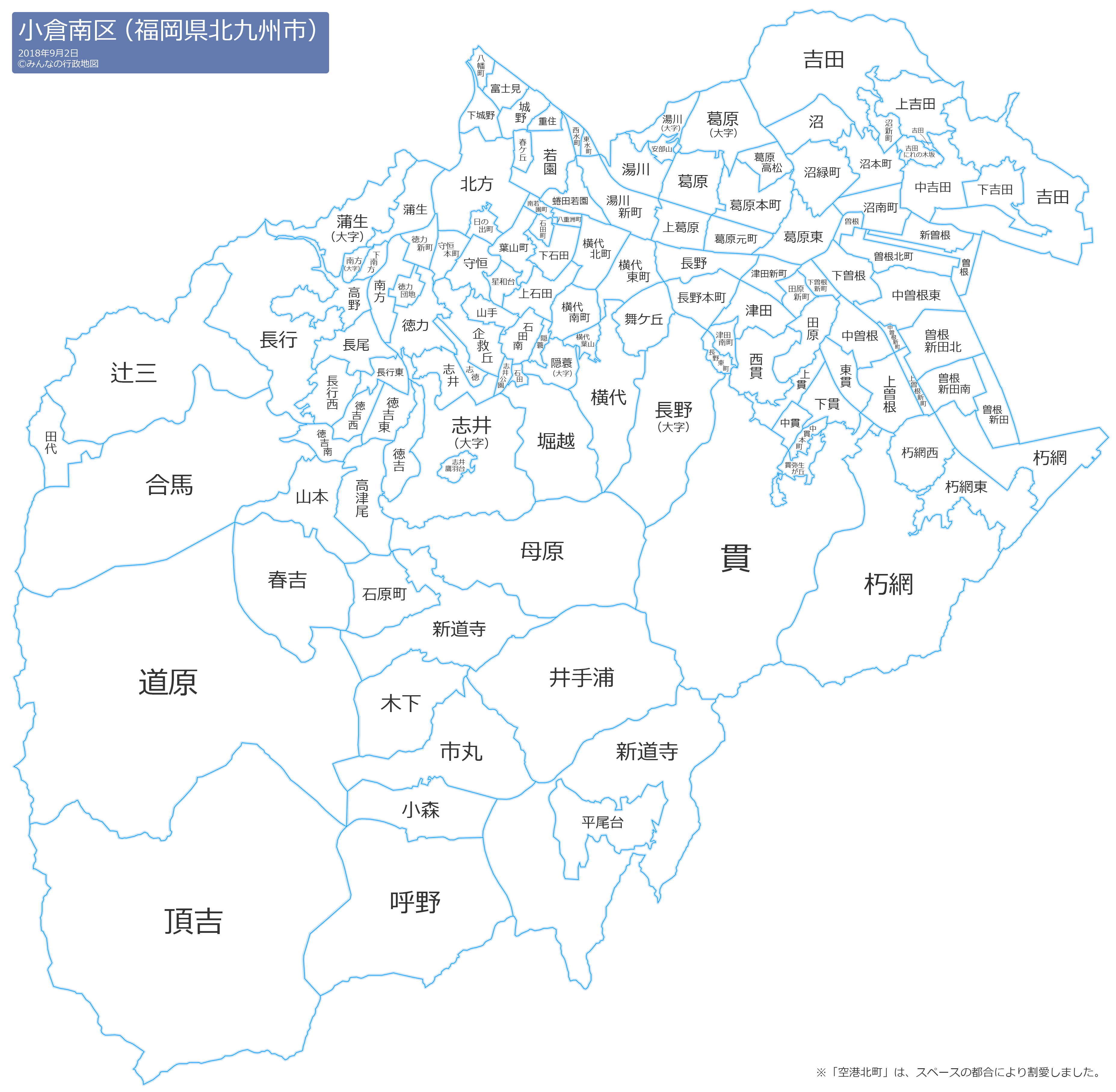 隠蓑(かくれみの)頂吉(かぐめよし)上石田(かみいしだ)上葛原(かみくずはら)上曽根(かみそね)上曽根新町(かみそねしんまち)上貫(かみぬき)上吉田(かみよしだ)蒲生(がもう)企救丘(きくがおか)北方(きたがた)木下(きのした)空港北町(くうこうきたまち)朽網(くさみ)朽網東(くさみひがし)朽網西(くさみにし)葛原(くずはら)葛原高松(くずはらたかまつ)葛原本町(くずはらほんまち)葛原元町(くずはらもとまち)葛原東(くずはらひがし)小森(こもり)