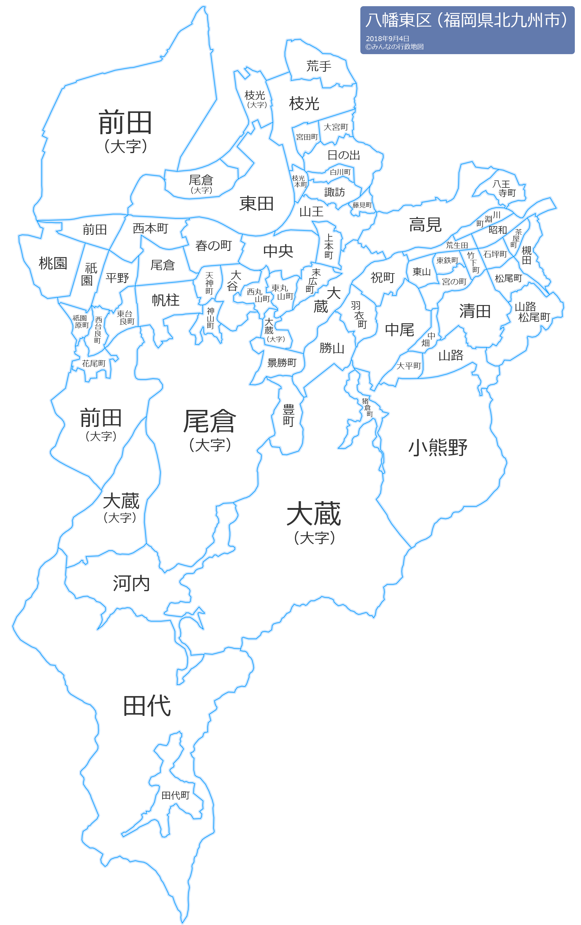 荒手(あらて)荒生田(あろうだ)石坪町(いしつぼまち)猪倉町(いのくらまち)祝町(いわいまち)枝光(えだみつ)枝光本町(えだみつほんまち)大蔵(おおくら)大谷(おおたに)大平町(おおひらまち)大宮町(おおみやまち)尾倉(おぐら)
