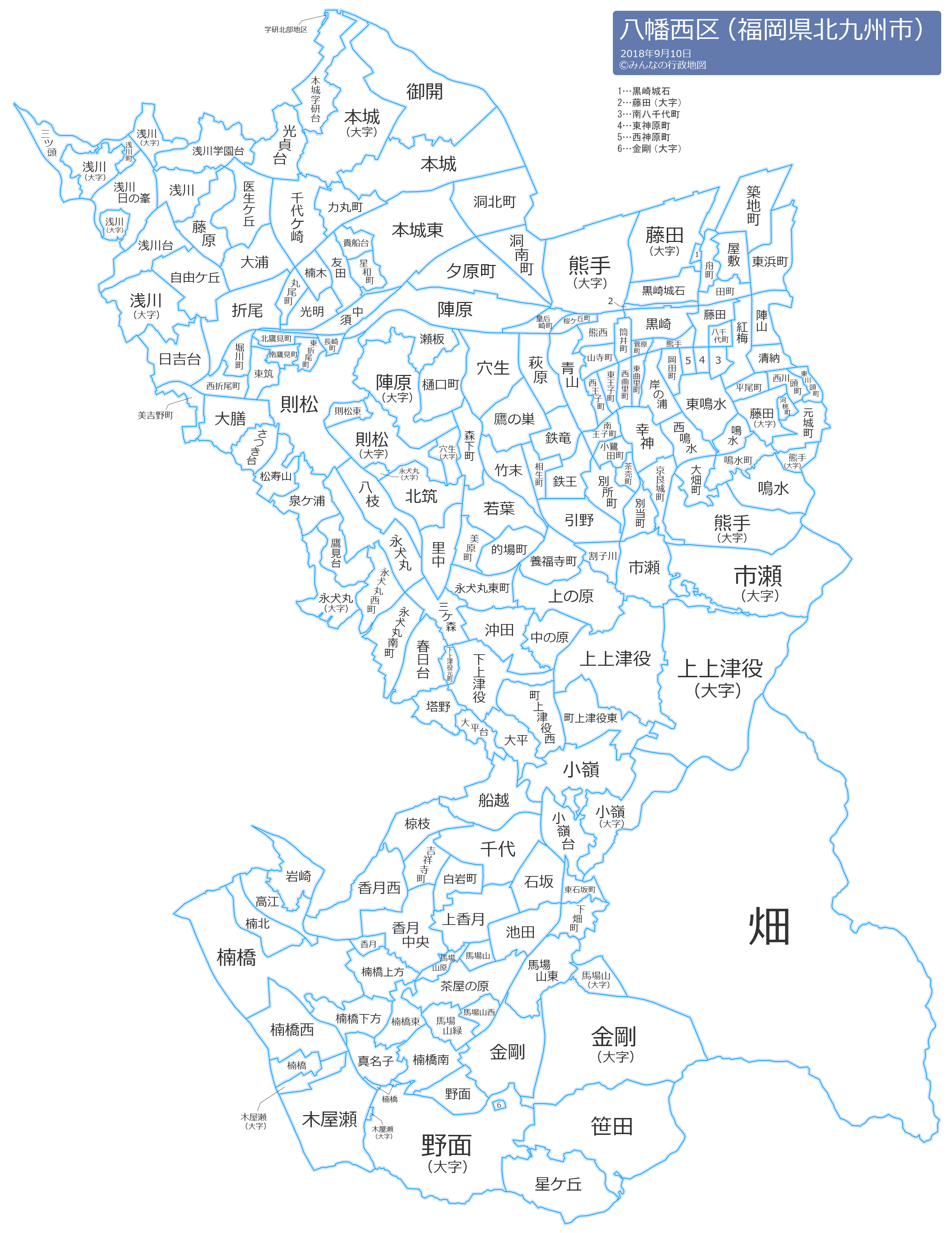 春日台(かすがだい)香月中央(かつきちゅうおう)香月西(かつきにし)上香月(かみかつき)上上津役(かみこうじゃく)岸の浦(きしのうら)北鷹見町(きたたかみまち)吉祥寺町(きっしょうじまち)貴船台(きふねだい)京良城町(きょうらぎまち)洞南町(くきなみまち)楠北(くすきた)楠木(くすのき)楠橋(くすばし)楠橋上方(くすばしかみかた)楠橋下方(くすばししもかた)楠橋東(くすばしひがし)楠橋西(くすばしにし)楠橋南(くすばしみなみ)熊手(くまで)熊西(くまにし)黒崎(くろさき)黒崎城石(くろさきしろいし)皇后崎町(こうがさきまち)河桃町(こうとうまち)紅梅(こうばい)光明(こうみょう)小鷺田町(こさぎだまち)小嶺(こみね)小嶺台(こみねだい)木屋瀬(こやのせ)金剛(こんごう)