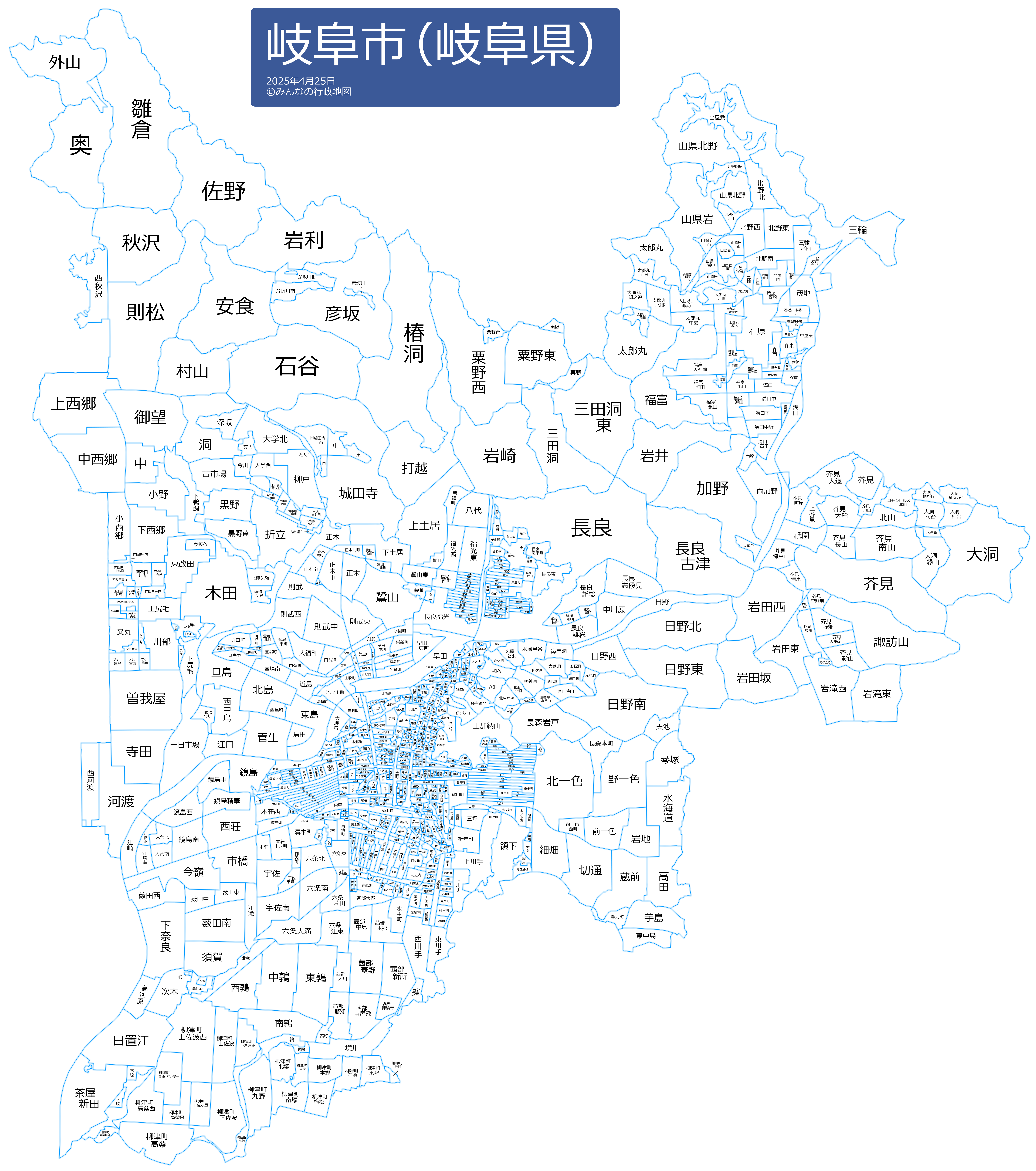 藍川町(あいかわちょう)間之町(あいのまち)青柳町(あおやぎちょう)赤池洞(あかいけぼら)赤ケ洞(あかがぼら)茜部大川(あかなべおおかわ)茜部大野(あかなべおおの)茜部新所(あかなべしんしょ)茜部神清寺(あかなべしんせいじ)茜部辰新(あかなべたつしん)茜部寺屋敷(あかなべてらやしき)茜部中島(あかなべなかしま)茜部野瀬(あかなべのせ)茜部菱野(あかなべひしの)茜部本郷(あかなべほんごう)茜町(あかねちょう)県町(あがたまち)秋沢(あきさわ)秋津町(あきつまち)芥見(あくたみ)芥見大退(あくたみおおのぎ)芥見大船(あくたみおおぶね)芥見海戸山(あくたみかいとやま)芥見影山(あくたみかげやま)芥見清水(あくたみきよみず)芥見嵯峨(あくたみさが)芥見大般若(あくたみだいはんにゃ)芥見中野畑(あくたみなかのばた)芥見長山(あくたみながやま)芥見野畑(あくたみのばた)芥見東山(あくたみひがしやま)芥見堀田(あくたみほりた)芥見町屋(あくたみまちや)芥見南山(あくたみみなみやま)曙町(あけぼのちょう)朝霧町(あさぎりちょう)朝日町(あさひまち)安食(あじき)安宅町(あたかまち)吾妻町(あづまちょう)天池(あまいけ)雨踊町(あまおどりちょう)尼ケ崎町(あまがさきちょう)荒川町(あらかわちょう)安良田町(あらたまち)粟野(あわの)粟野東(あわのひがし)粟野西(あわのにし)粟野台(あわのだい)庵町(いおりまち)生田町(いくたまち)池田町(いけだまち)池ノ上町(いけのうえちょう)石谷(いしがい)石切町(いしきりちょう)石長町(いしながちょう)石原(いしはら)泉町(いずみまち)市ノ坪町(いちのつぼちょう)市橋(いちはし)一番町(いちばんちょう)一松道(いっしょうどう)伊奈波通(いなばどおり)稲荷町(いなりちょう)稲荷山(いなりやま)茨木町(いばらぎちょう)伊吹町(いぶきちょう)今川(いまがわ)今川町(いまがわちょう)今小町(いまこまち)今沢町(いまざわちょう)今町(いままち)今嶺(いまみね)芋島(いもじま)入舟町(いりふねちょう)岩井(いわい)岩栄町(いわえいちょう)岩倉町(いわくらちょう)岩崎(いわさき)岩田東(いわたひがし)岩田西(いわたにし)岩滝東(いわたきひがし)岩滝西(いわたきにし)岩田坂(いわたざか)岩地(いわち)岩利(いわり)魚屋町(うおやちょう)鵜川町(うかわちょう)鶯谷(うぐいすだに)鶯谷町(うぐいすだにちょう)宇佐(うさ)宇佐東町(うさひがしまち)宇佐南(うさみなみ)鶉(うずら)打越(うちこし)靱屋町(うつぼやちょう)梅ケ枝町(うめがえちょう)梅河町(うめがわちょう)梅園町(うめぞのちょう)雲竜町(うんりゅうちょう)栄扇町(えいせんちょう)永楽町(えいらくちょう)江川町(えがわちょう)江口(えぐち)江崎(えさき)江崎北(えさききた)江崎南(えさきみなみ)江添(えぞえ)戎町(えびすちょう)老松町(おいまつちょう)大池町(おおいけちょう)大落洞(おおおちぼら)大蔵台(おおくらだい)大倉町(おおくらちょう)大菅北(おおすがきた)大菅南(おおすがみなみ)大富町(おおとみちょう)大縄場(おおなわば)大洞(おおぼら)大洞柏台(おおぼらかしわだい)大洞桐が丘(おおぼらきりがおか)大洞桜台(おおぼらさくらだい)大洞緑山(おおぼらみどりやま)大洞紅葉が丘(おおぼらもみじがおか)大洞西(おおぼらにし)大宮町(おおみやちょう)大柳町(おおやなぎちょう)大脇(おおわき)沖ノ橋町(おきのはしちょう)奥(おく)小熊町(おぐまちょう)御杉町(おすぎちょう)織田塚町(おだづかちょう)織田町(おだまち)御浪町(おなみちょう)雄総桜町(おぶささくらまち)雄総緑町(おぶさみどりまち)雄総柳町(おぶさやなぎまち)折立(おりたて)