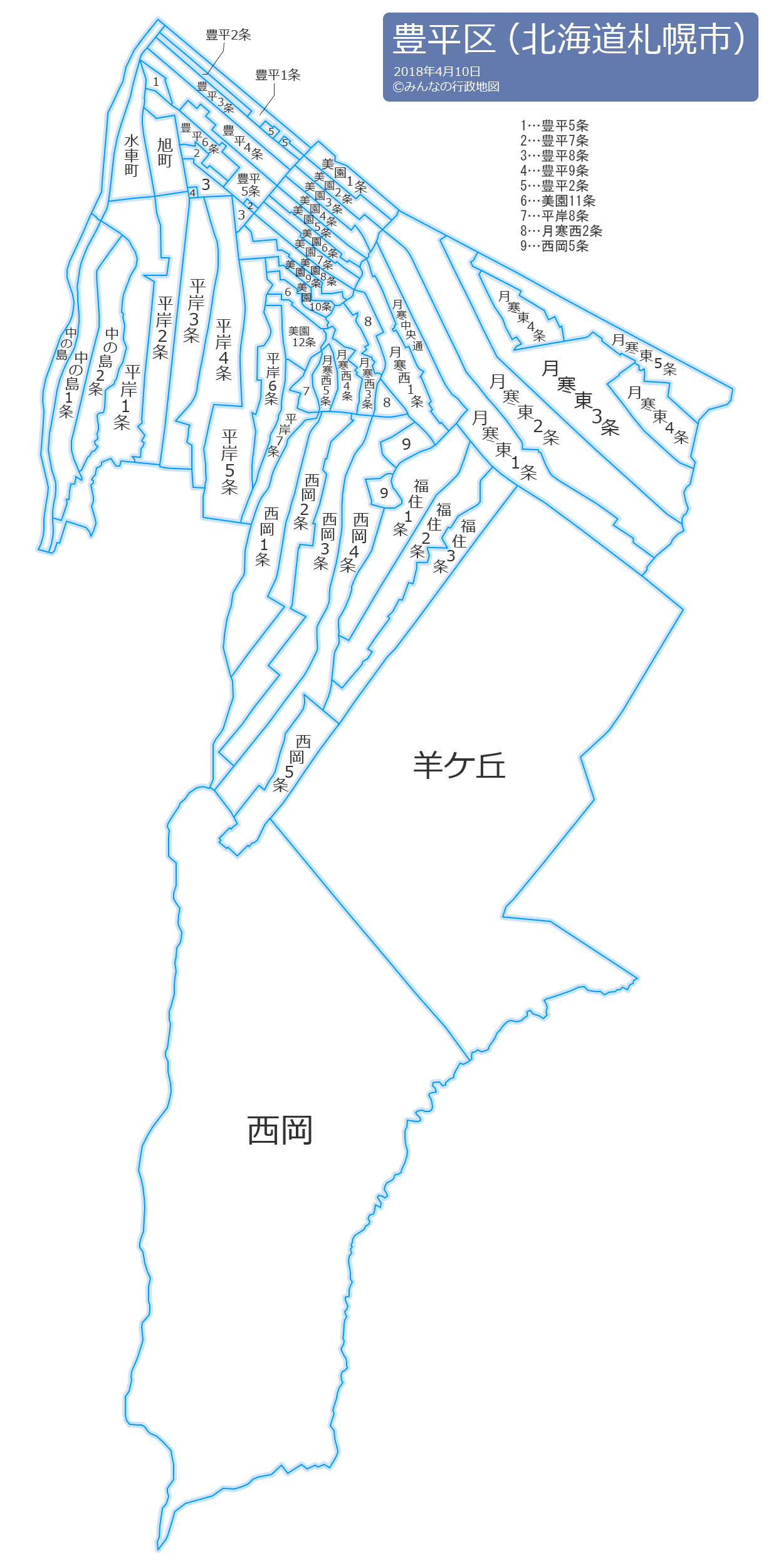 月寒中央通(つきさむちゅうおうどおり)月寒西一条(つきさむにし1じょう)月寒西二条(つきさむにし2じょう)月寒西三条(つきさむにし3じょう)月寒西四条(つきさむにし4じょう)月寒西五条(つきさむにし5じょう)月寒東一条(つきさむひがし1じょう)月寒東二条(つきさむひがし2じょう)月寒東三条(つきさむひがし3じょう)月寒東四条(つきさむひがし4じょう)月寒東五条(つきさむひがし5じょう)豊平一条(とよひら1じょう)豊平二条(とよひら2じょう)豊平三条(とよひら3じょう)豊平四条(とよひら4じょう)豊平五条(とよひら5じょう)豊平六条(とよひら6じょう)豊平七条(とよひら7じょう)豊平八条(とよひら8じょう)豊平九条(とよひら9じょう)