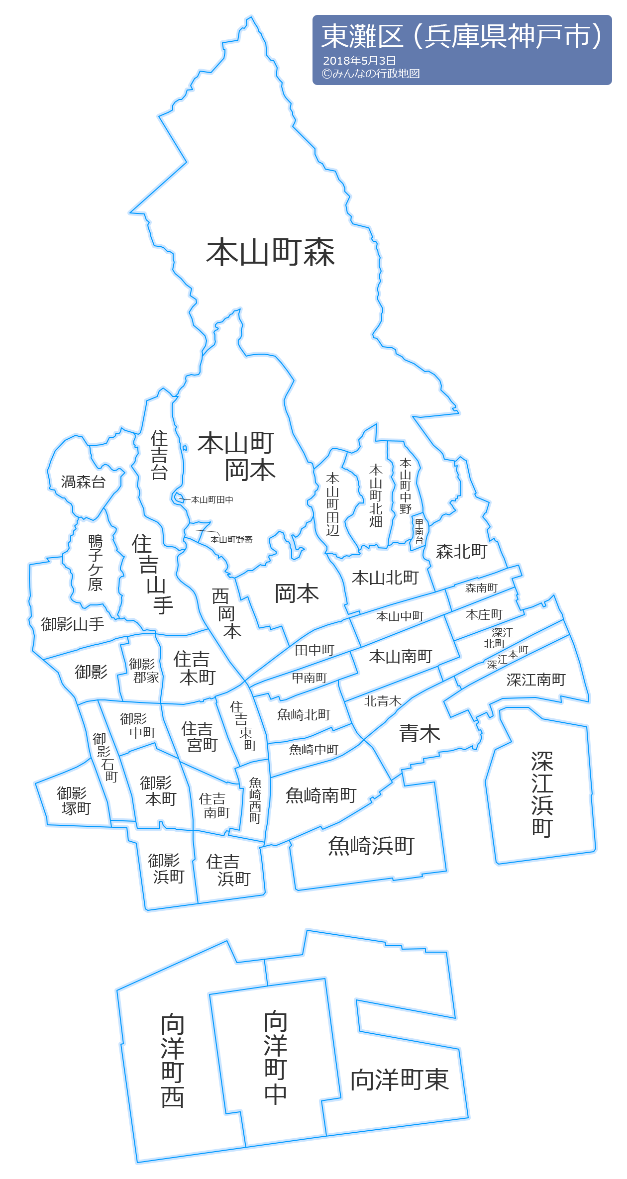 御影(みかげ)御影石町(みかげいしまち)御影郡家(みかげぐんげ)御影塚町(みかげつかまち)御影中町(みかげなかまち)御影浜町(みかげはままち)御影本町(みかげほんまち)御影山手(みかげやまて)本山北町(もとやまきたまち)本山町岡本(もとやまちょうおかもと)本山町北畑(もとやまちょうきたはた)本山町田中(もとやまちょうたなか)本山町田辺(もとやまちょうたなべ)本山町森(もとやまちょうもり)本山中町(もとやまなかまち)本山南町(もとやまみなみまち)森北町(もりきたまち)森南町(もりみなみまち)