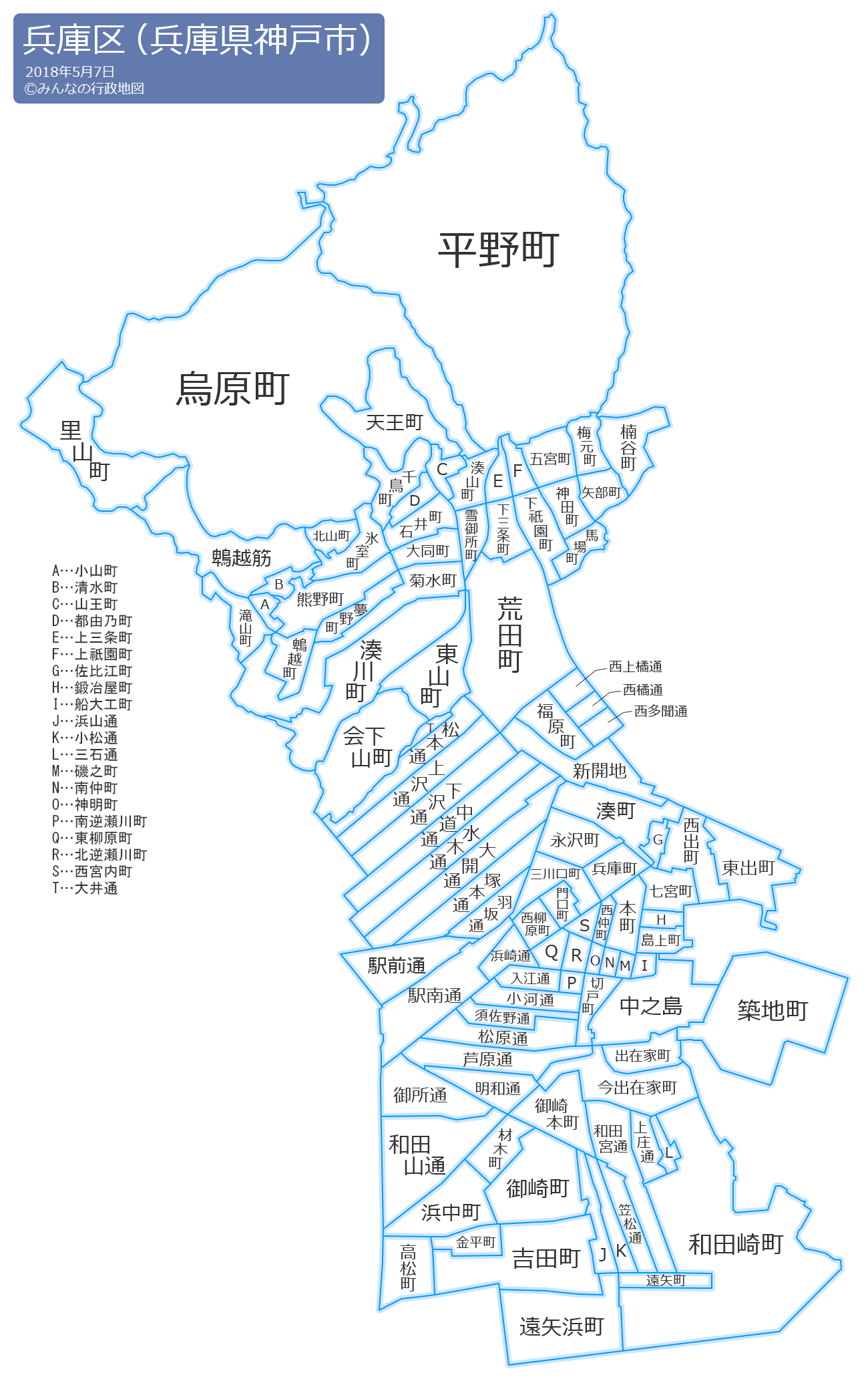 羽坂通(はさかどおり)馬場町(ばばちょう)浜崎通(はまさきどおり)浜中町(はまなかちょう)浜山通(はまやまどおり)東出町(ひがしでまち)東柳原町(ひがしやなぎわらちょう)東山町(ひがしやまちょう)氷室町(ひむろちょう)兵庫町(ひょうごちょう)鵯越筋(ひよどりごえすじ)鵯越町(ひよどりごえちょう)平野町(ひらのちょう)福原町(ふくわらちょう)船大工町(ふなだいくちょう)本町(ほんまち)