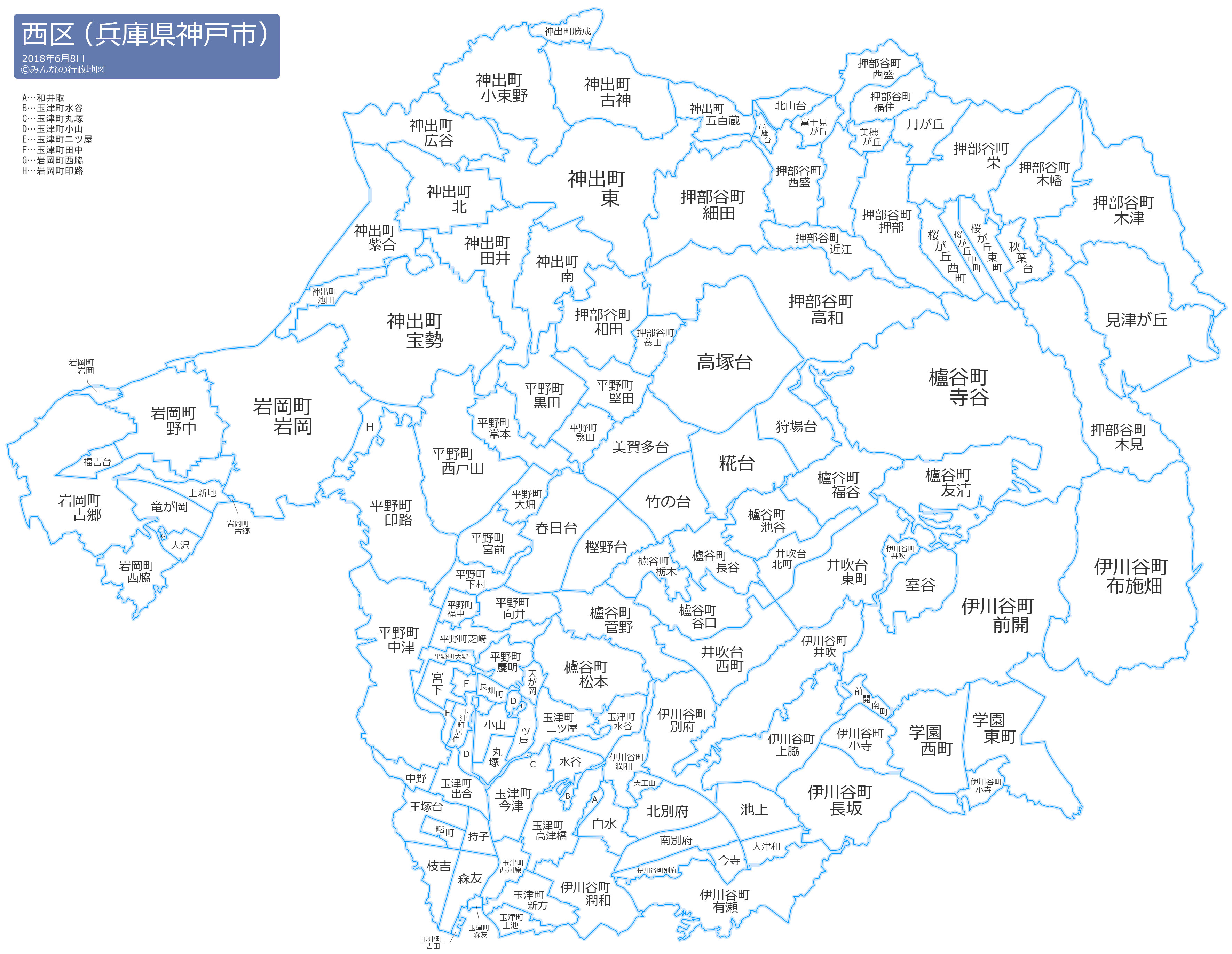 秋葉台(あきばだい)曙町(あけぼのちょう)天が岡(あまがおか)伊川谷町有瀬(いかわだにちょうありせ)伊川谷町井吹(いかわだにちょういぶき)伊川谷町上脇(いかわだにちょうかみわき)伊川谷町小寺(いかわだにちょうこでら)伊川谷町潤和(いかわだにちょうじゅんな)伊川谷町前開(いかわだにちょうぜんかい)伊川谷町長坂(いかわだにちょうながさか)伊川谷町布施畑(いかわだにちょうふせはた)伊川谷町別府(いかわだにちょうべふ)池上(いけがみ)井吹台東町(いぶきだいひがしまち)井吹台西町(いぶきだいにしまち)井吹台北町(いぶきだいきたまち)今寺(いまでら)岩岡町岩岡(いわおかちょういわおか)岩岡町印路(いわおかちょういんじ)岩岡町西脇(いわおかちょうにしわき)岩岡町野中(いわおかちょうのなか)岩岡町古郷(いわおかちょうふるさと)枝吉(えだよし)王塚台(おうつかだい)大沢(おおさわ)大津和(おおつわ)押部谷町押部(おしべだにちょうおしべ)押部谷町木津(おしべだにちょうきづ)押部谷町近江(おしべだにちょうきんこう)押部谷町木見(おしべだにちょうこうみ)押部谷町木幡(おしべだにちょうこばた)押部谷町細田(おしべだにちょうさいた)押部谷町栄(おしべだにちょうさかえ)押部谷町高和(おしべだにちょうたかわ)押部谷町西盛(おしべだにちょうにしもり)押部谷町福住(おしべだにちょうふくすみ)押部谷町養田(おしべだにちょうようだ)押部谷町和田(おしべだにちょうわだ)