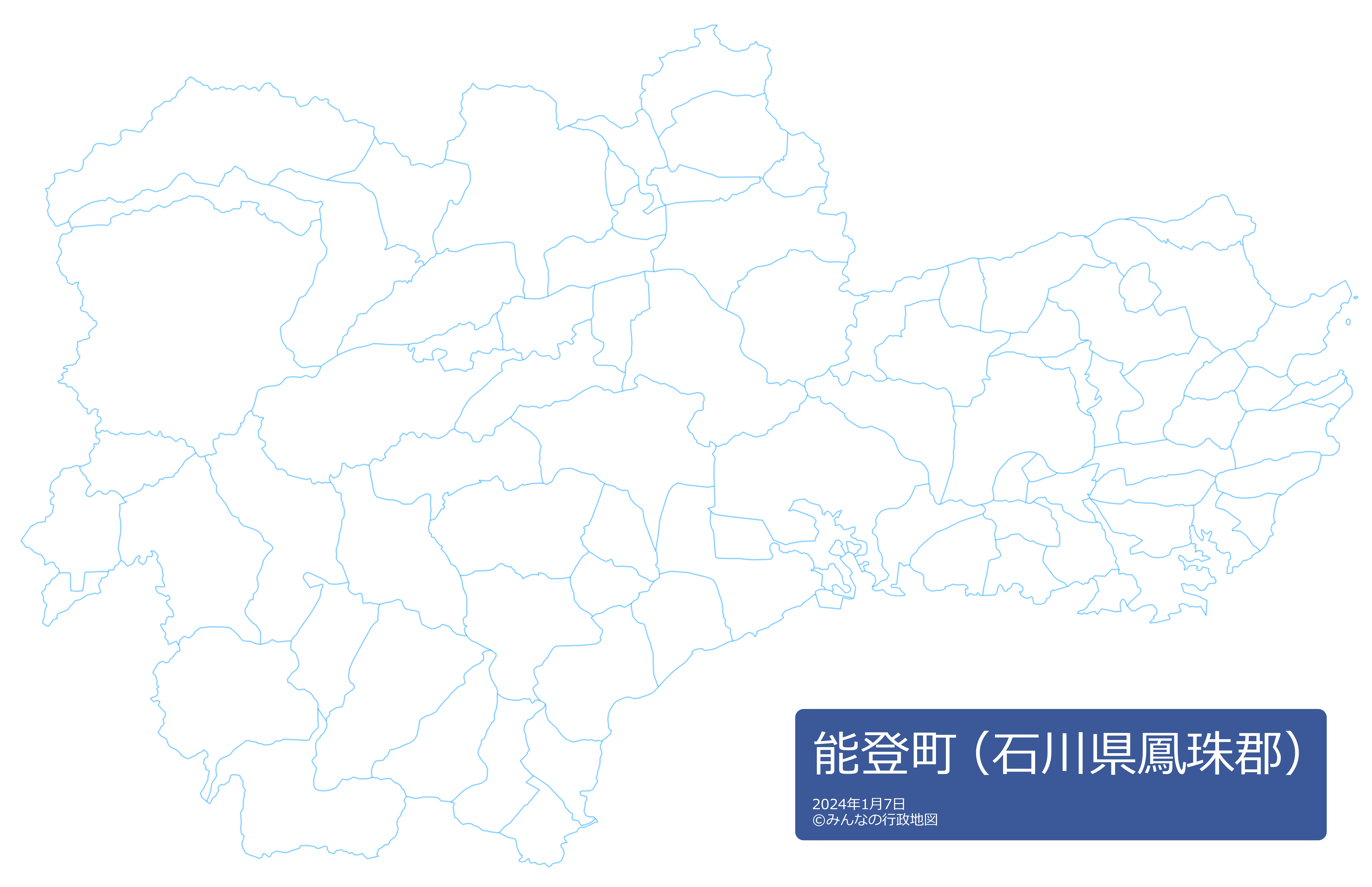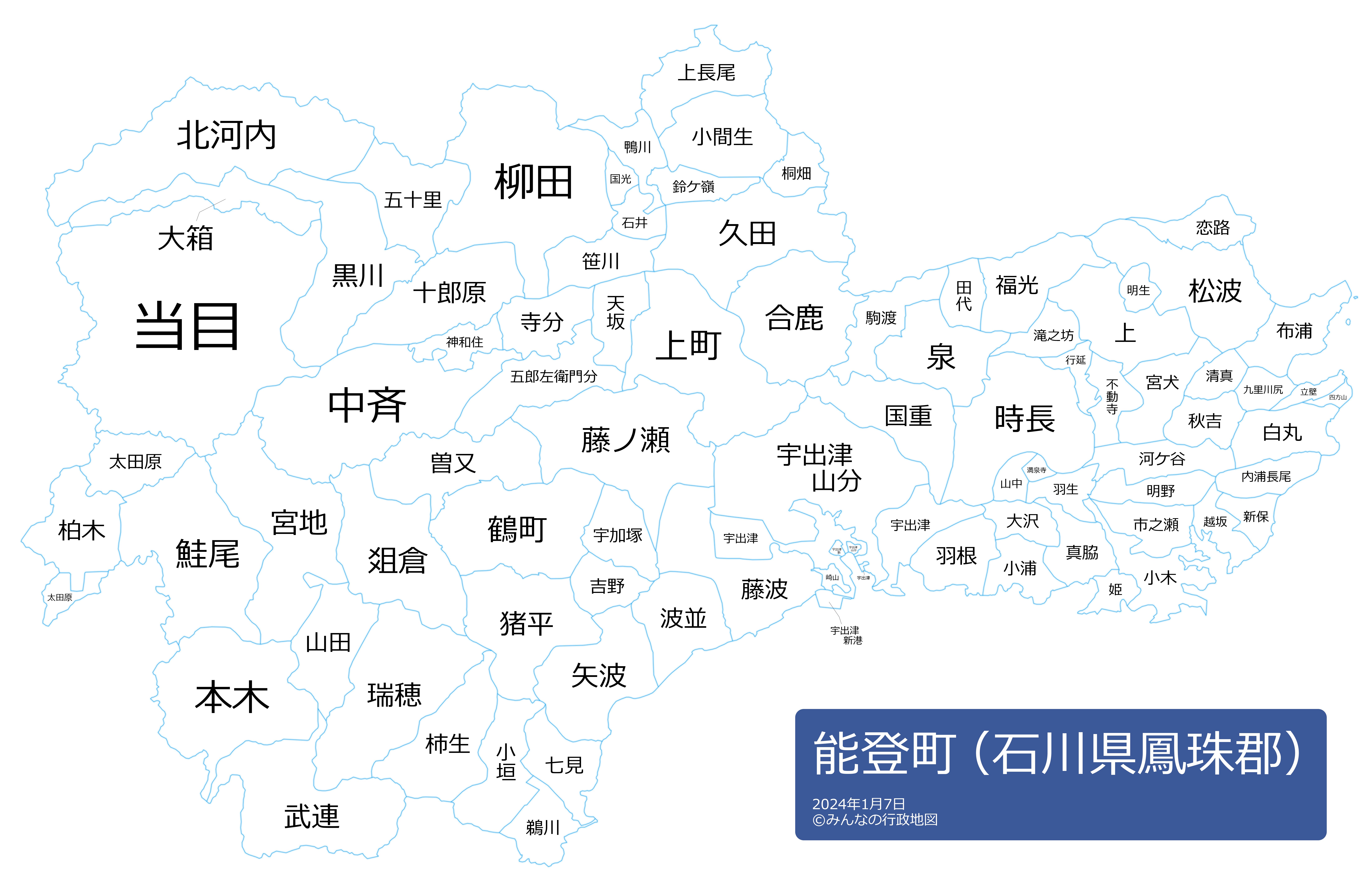 秋吉(あきよし)明野(あけの)五十里(いかり)石井(いしい)泉(いずみ)市之瀬(いちのせ)猪平(いのひら)宇加塚(うかづか)鵜川(うかわ)宇出津(うしつ)宇出津新(うしつしん)宇出津新港(うしつしんこう)宇出津山分(うしつやまぶん)内浦長尾(うちうらなご)小浦(おうら)太田原(おおだわら)大箱(おおばこ)小垣(おがき)小木(おぎ)越坂(おっさか)小間生(おもう)