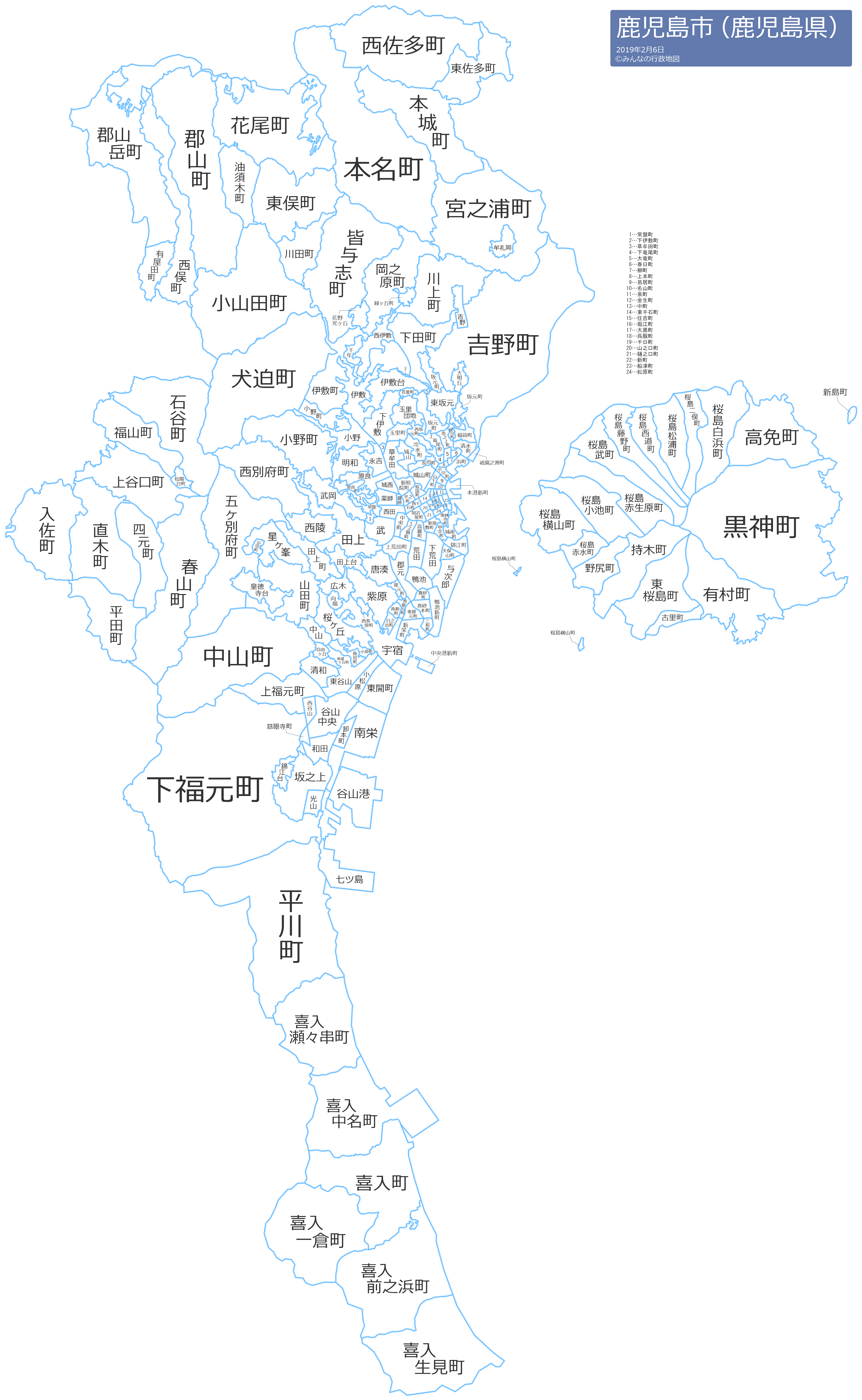加治屋町(かじやちょう)春日町(かすがちょう)上竜尾町(かみたつおちょう)上谷口町(かみたにぐちちょう)上福元町(かみふくもとちょう)上本町(かみほんまち)鴨池(かもいけ)鴨池新町(かもいけしんまち)川上町(かわかみちょう)川田町(かわだちょう)喜入瀬々串町(きいれせせくしちょう)喜入中名町(きいれなかみょうちょう)喜入生見町(きいれぬくみちょう)喜入一倉町(きいれひとくらちょう)喜入前之浜町(きいれまえのはまちょう)喜入町(きいれちょう)希望ケ丘町(きぼうがおかちょう)錦江台(きんこうだい)錦江町(きんこうちょう)金生町(きんせいちょう)祇園之洲町(ぎおんのすちょう)黒神町(くろかみちょう)花野光ケ丘(けのひかりがおか)甲突町(こうつきちょう)皇徳寺台(こうとくじだい)高免町(こうめんちょう)向陽(こうよう)高麗町(こうらいちょう)郡元(こおりもと)郡元町(こおりもとちょう)郡山岳町(こおりやまたけまち)郡山町(こおりやまちょう)五ケ別府町(ごかべっぷちょう)呉服町(ごふくまち)小松原(こまつばら)小山田町(こやまだちょう)