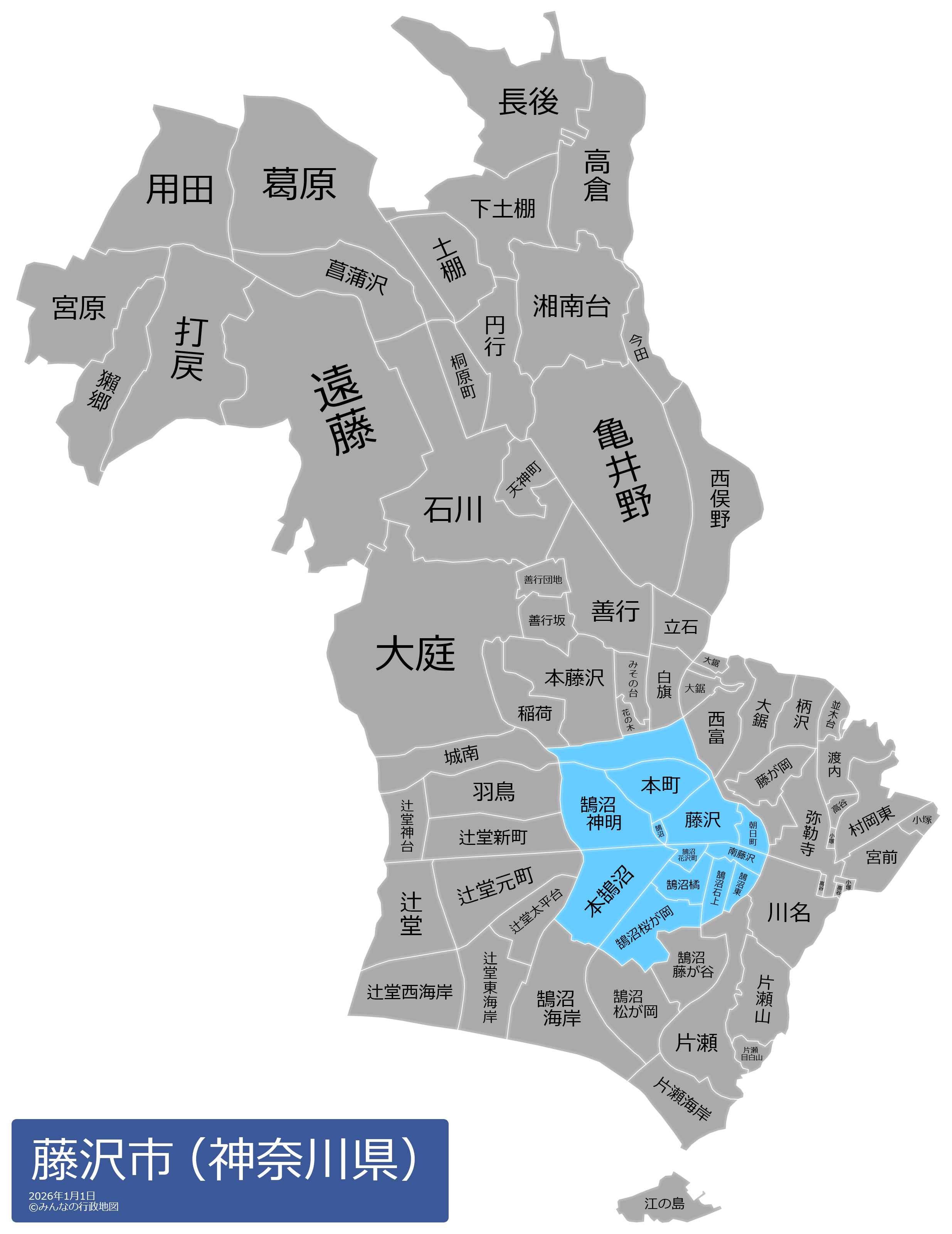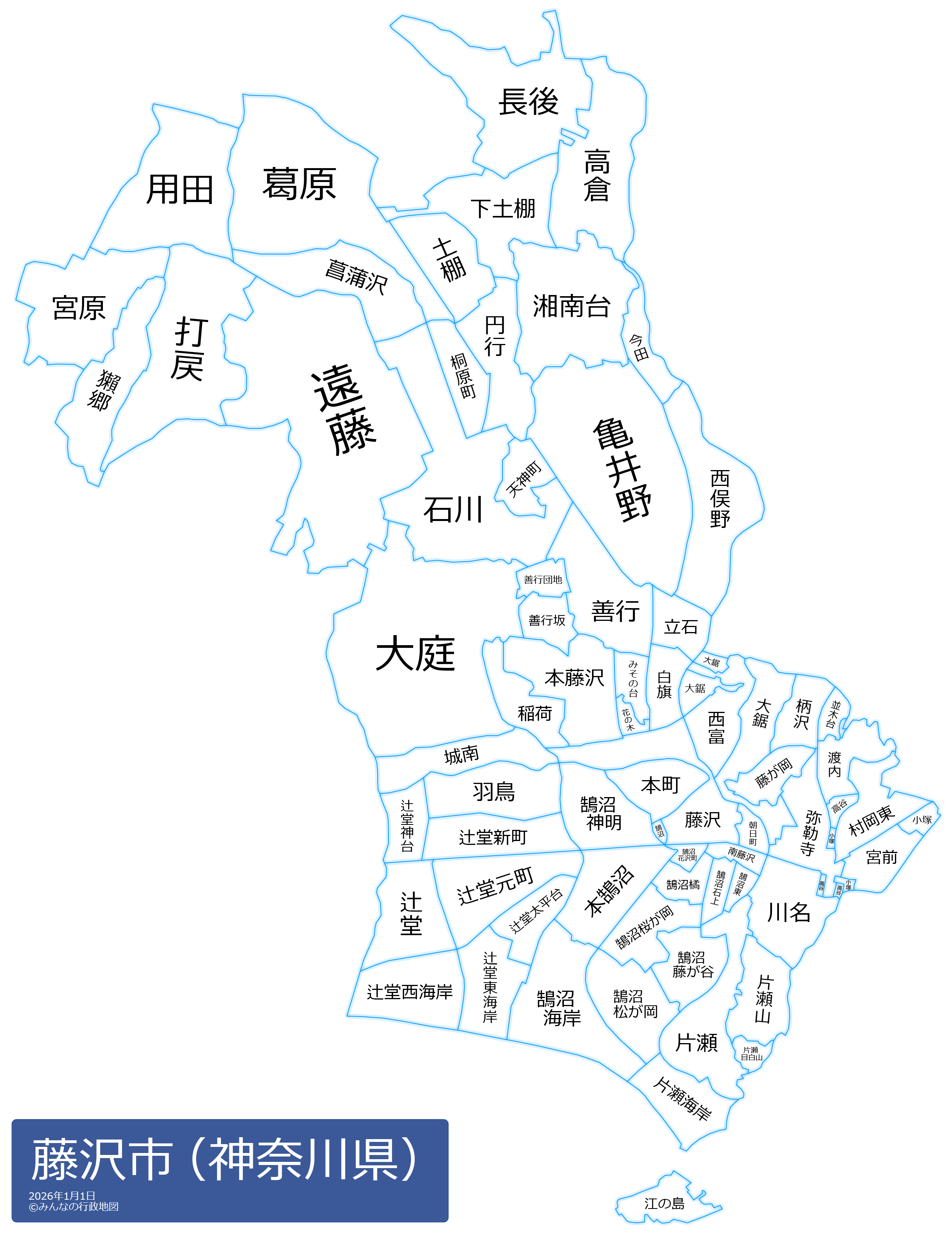 片瀬(かたせ)片瀬海岸(かたせかいがん)片瀬目白山(かたせめじろやま)片瀬山(かたせやま)亀井野(かめいの)柄沢(からさわ)川名(かわな)桐原町(きりはらちょう)鵠沼(くげぬま)鵠沼石上(くげぬまいしがみ)鵠沼海岸(くげぬまかいがん)鵠沼桜が岡(くげぬまさくらがおか)鵠沼神明(くげぬましんめい)鵠沼橘(くげぬまたちばな)鵠沼花沢町(くげぬまはなざわちょう)鵠沼藤が谷(くげぬまふじがや)鵠沼松が岡(くげぬままつがおか)鵠沼東(くげぬまひがし)葛原(くずはら)小塚(こつか)