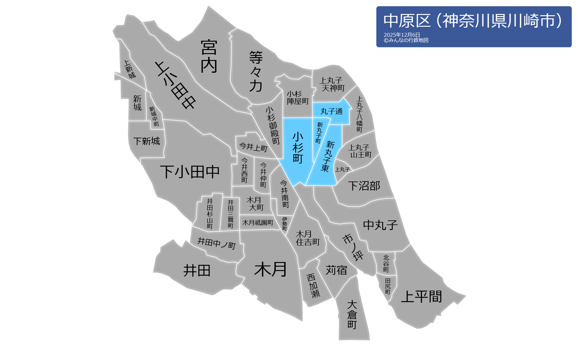 上小田中(かみこだなか)上新城(かみしんじょう)上平間(かみひらま)上丸子(かみまるこ)上丸子山王町(かみまるこさんのうちょう)上丸子天神町(かみまるこてんじんちょう)上丸子八幡町(かみまるこはちまんちょう)苅宿(かりやど)北谷町(きたやちょう)木月(きづき)木月伊勢町(きづきいせちょう)木月祗園町(きづきぎおんちょう)木月住吉町(きづきすみよしちょう)木月大町(きづきおおまち)小杉御殿町(こすぎごてんちょう)小杉陣屋町(こすぎじんやちょう)小杉町(こすぎまち)