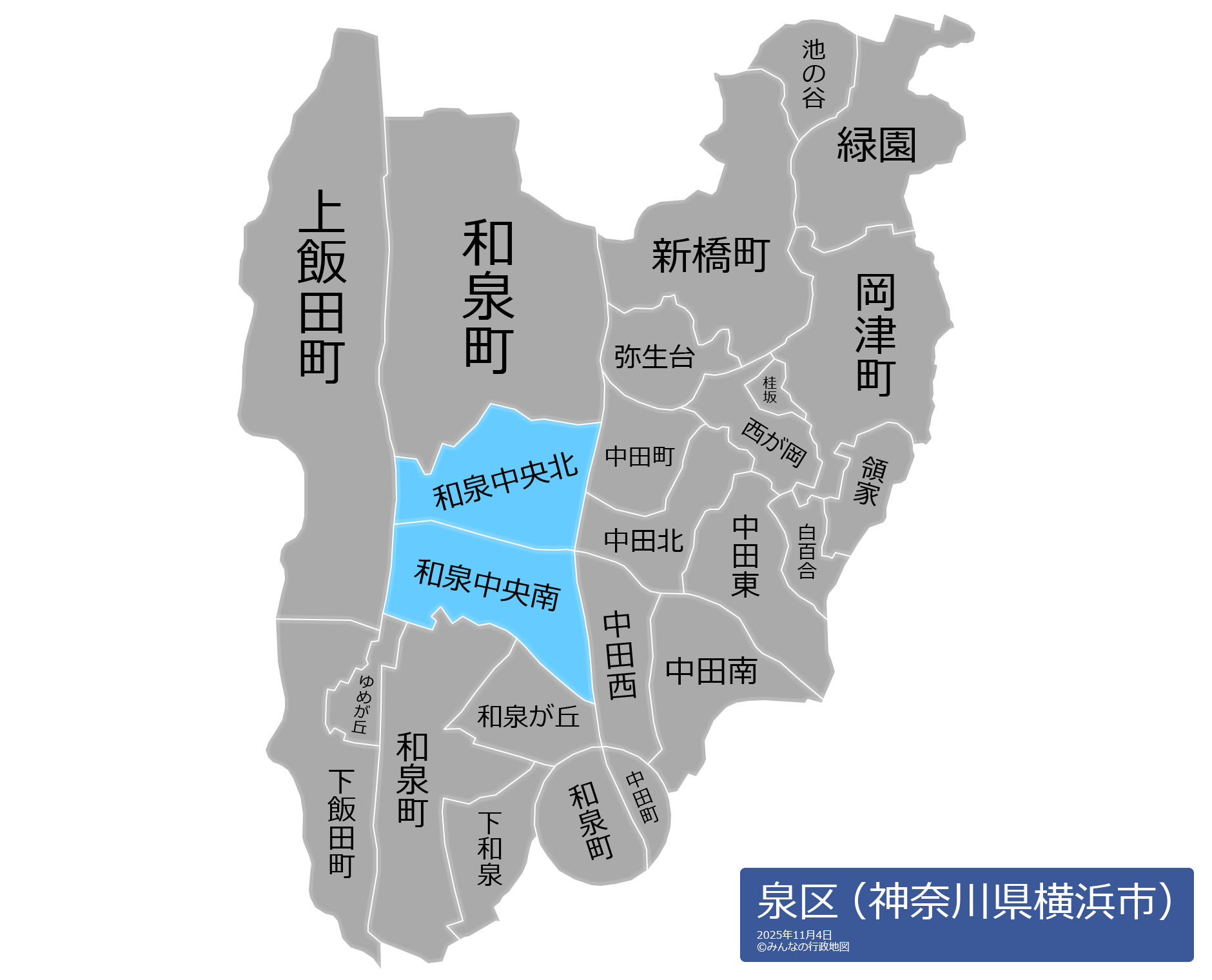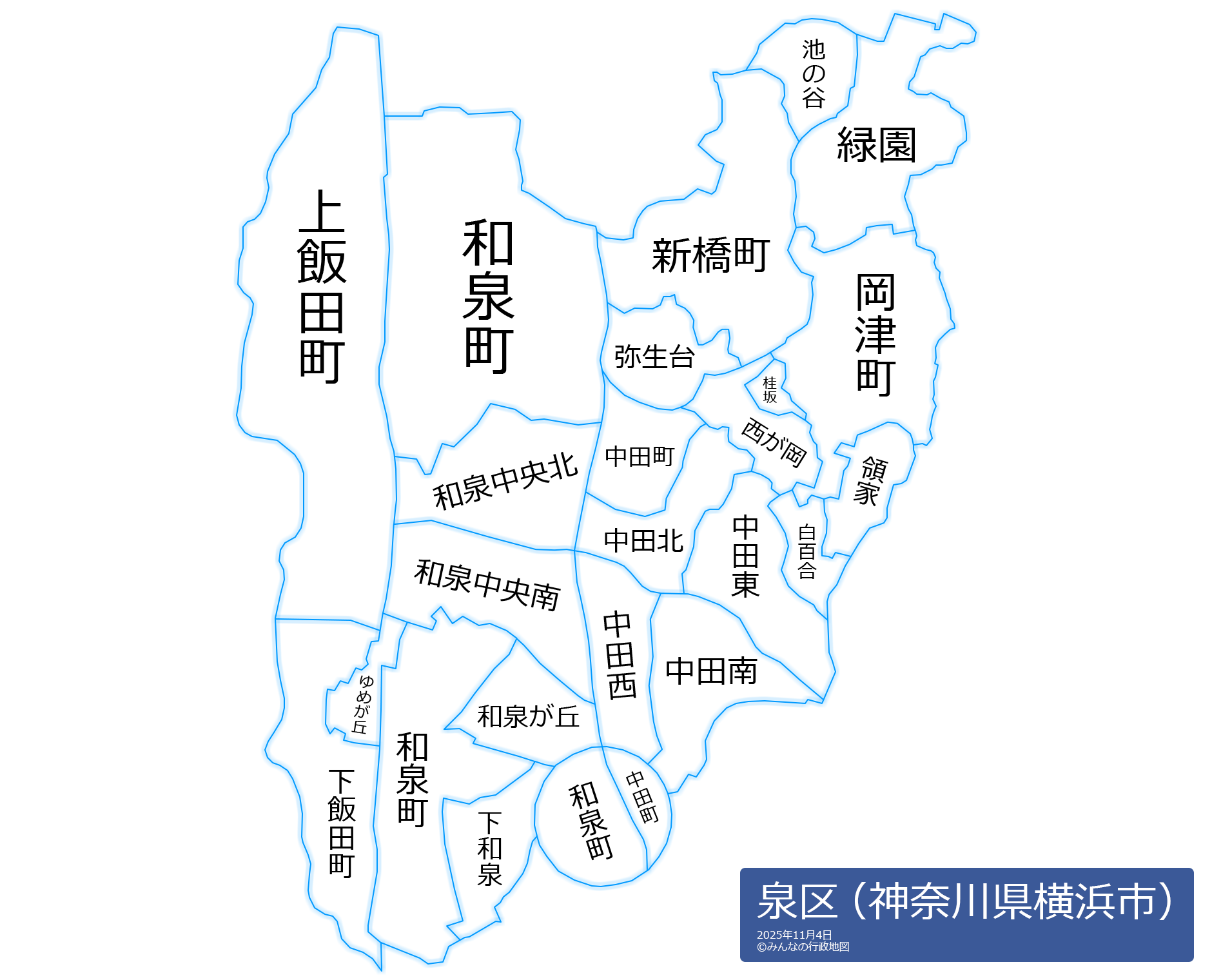 池の谷(いけのたに)和泉が丘(いずみがおか)和泉中央北(いずみちゅうおうきた)和泉中央南(いずみちゅうおうみなみ)和泉町(いずみちょう)岡津町(おかづちょう)