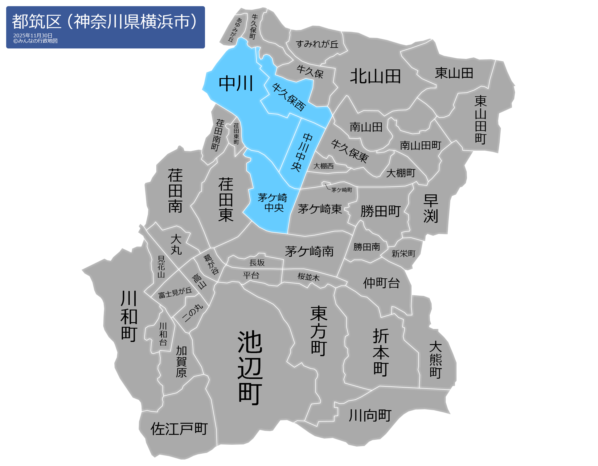 中川(なかがわ)中川中央(なかがわちゅうおう)仲町台(なかまちだい)長坂(ながさか)二の丸(にのまる)
