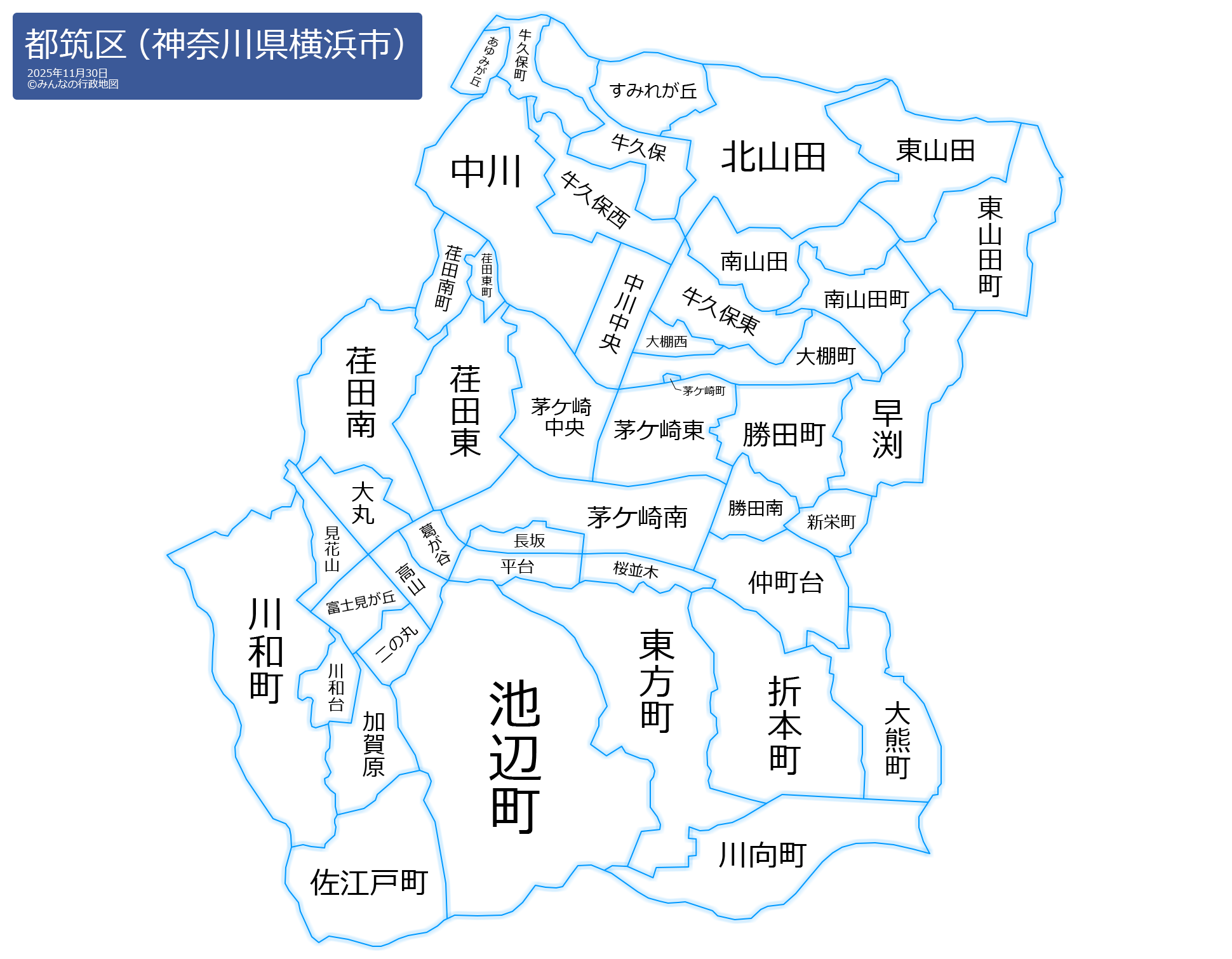 あゆみが丘(あゆみがおか)池辺町(いこのべちょう)牛久保(うしくぼ)牛久保町(うしくぼちょう)牛久保東(うしくぼひがし)牛久保西(うしくぼにし)荏田東町(えだひがしちょう)荏田南町(えだみなみちょう)荏田東(えだひがし)荏田南(えだみなみ)大熊町(おおくまちょう)大棚西(おおだなにし)大棚町(おおだなちょう)大丸(おおまる)折本町(おりもとちょう)