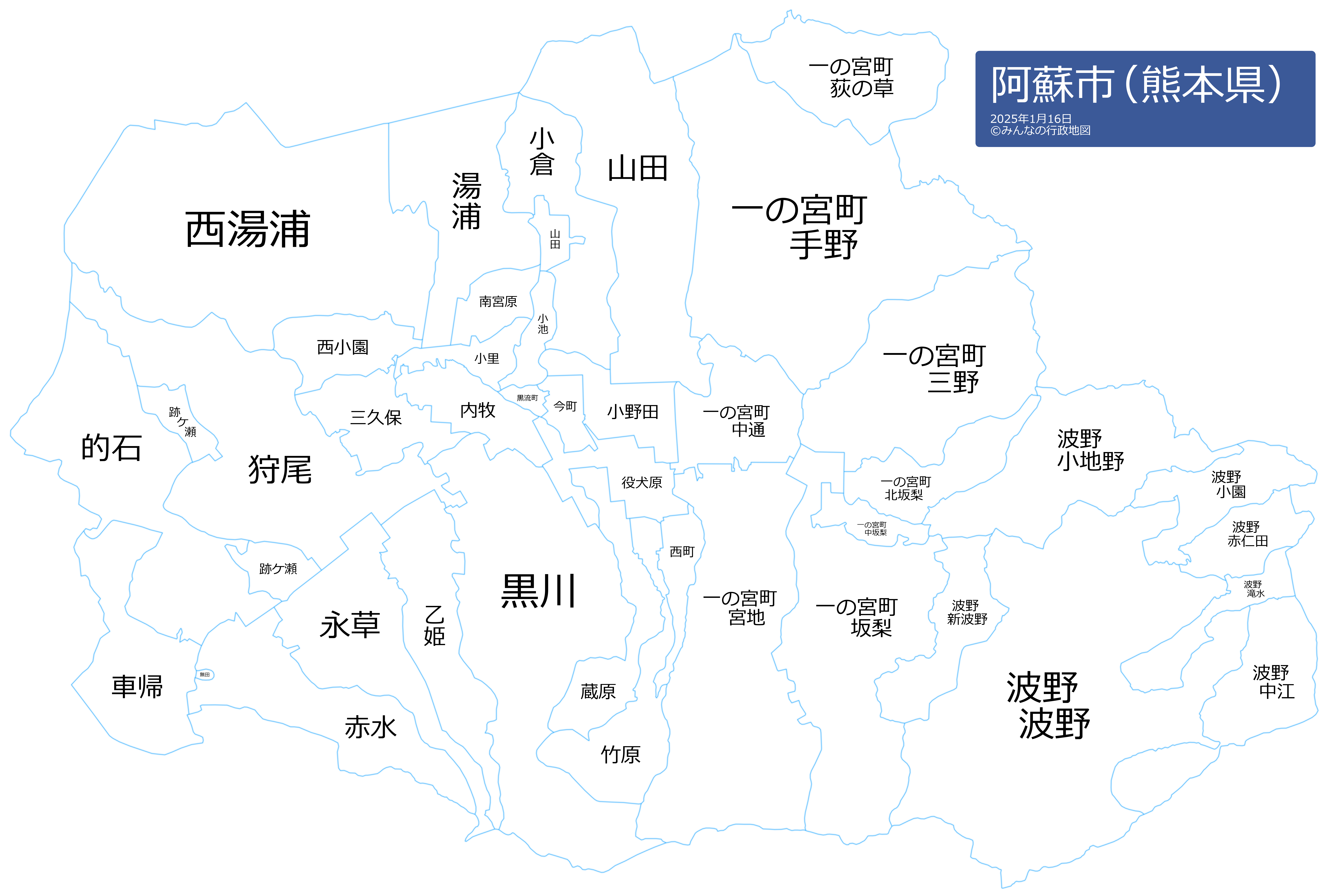 赤水(あかみず)跡ケ瀬(あとがせ)一の宮町荻の草(いちのみやまちおぎのくさ)一の宮町北坂梨(いちのみやまちきたさかなし)一の宮町坂梨(いちのみやまちさかなし)一の宮町三野(いちのみやまちさんの)一の宮町手野(いちのみやまちての)一の宮町中坂梨(いちのみやまちなかさかなし)一の宮町中通(いちのみやまちなかどおり)一の宮町宮地(いちのみやまちみやじ)今町(いままち)内牧(うちのまき)小倉(おくら)小里(おざと)乙姫(おとひめ)小野田(おのだ)
