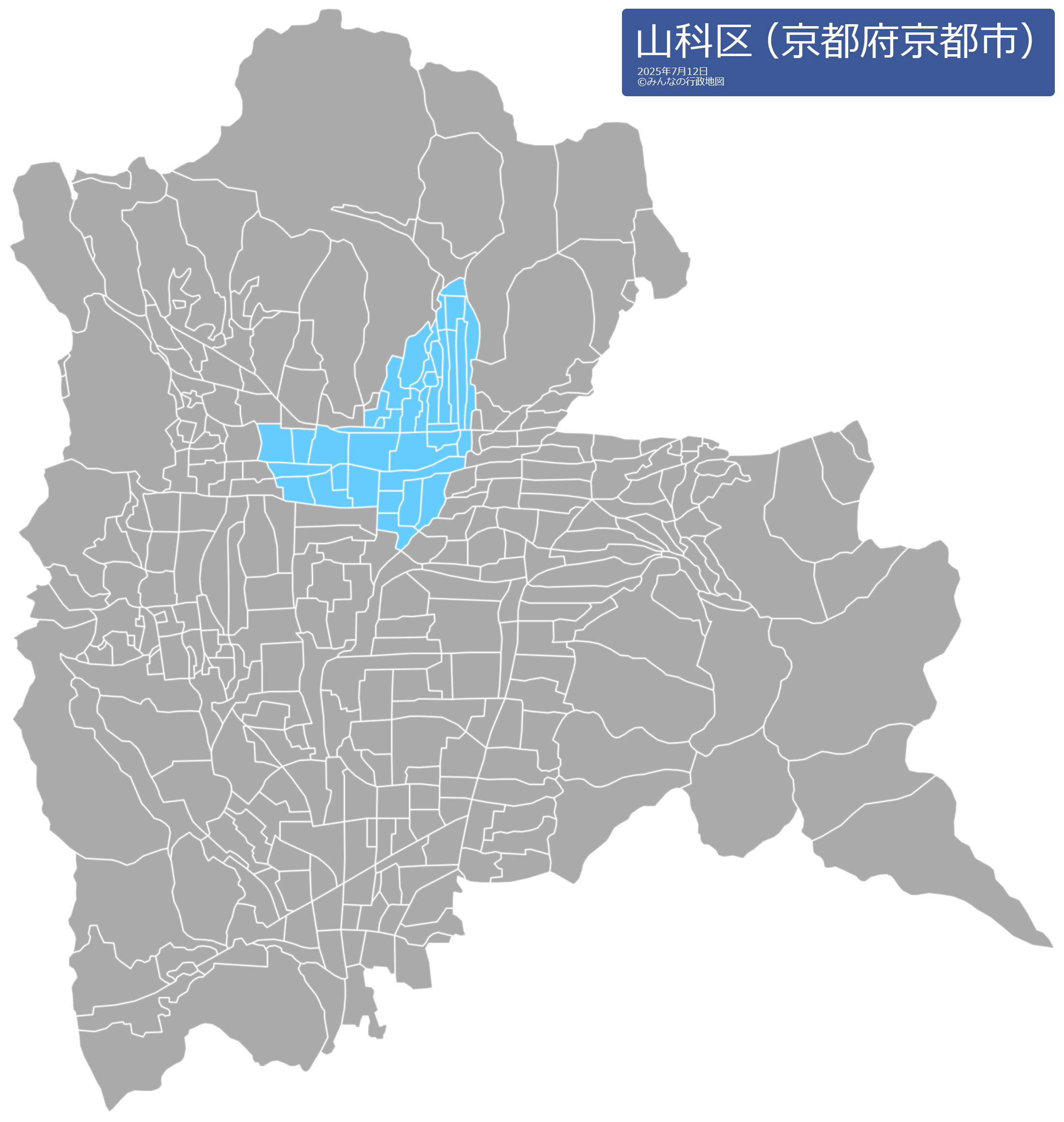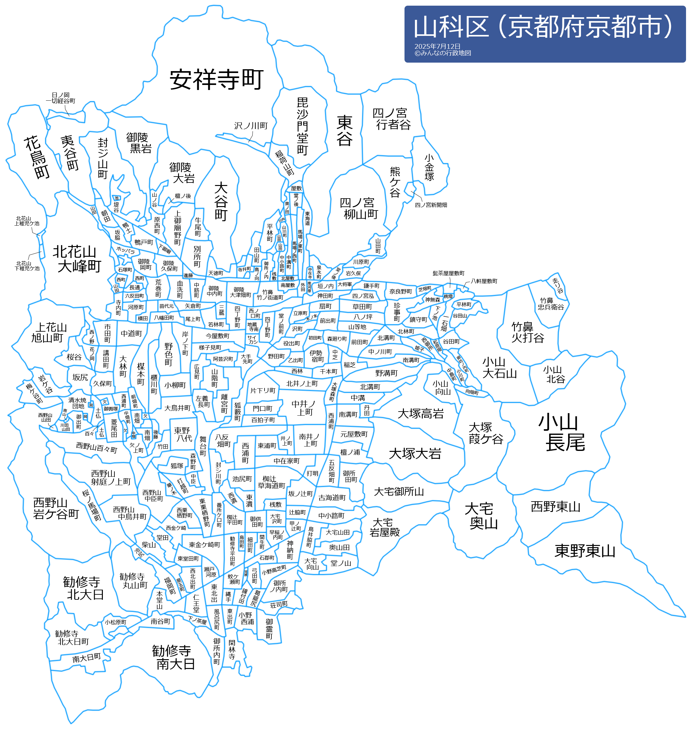 上花山旭山町(かみかざんあさひやまちょう)上花山久保町(かみかざんくぼちょう)上花山講田町(かみかざんこうだちょう)上花山坂尻(かみかざんさかじり)上花山桜谷(かみかざんさくらだに)上花山花ノ岡町(かみかざんはなのおかちょう)川田岩ケ谷(かわたいわがたに)川田梅ケ谷町(かわたうめがたにちょう)川田御出町(かわたおいでちょう)川田岡ノ西(かわたおかのにし)川田欠ノ上(かわたかけのうえ)川田清水焼団地町(かわたきよみずやきだんちちょう)川田土仏(かわたつちぼとけ)川田百々(かわたどど)川田中畑町(かわたなかばたちょう)川田西浦町(かわたにしうらちょう)川田菱尾田(かわたひしおだ)川田前畑町(かわたまえはたちょう)川田御輿塚町(かわたみこしづかちょう)川田南畑町(かわたみなみばたちょう)川田南山(かわたみなみやま)川田山田(かわたやまだ)勧修寺閑林寺(かんしゅうじかんりんじ)勧修寺北大日(かんしゅうじきただいにち)勧修寺北大日町(かんしゅうじきただいにちちょう)勧修寺御所内町(かんしゅうじごしょうちちょう)勧修寺小松原町(かんしゅうじこまつばらちょう)勧修寺柴山(かんしゅうじしばやま)勧修寺下ノ茶屋町(かんしゅうじしものちゃやちょう)勧修寺瀬戸河原(かんしゅうじせとがわら)勧修寺泉玉町(かんしゅうじせんぎょくちょう)勧修寺堂田(かんしゅうじどうでん)勧修寺縄手町(かんしゅうじなわてちょう)勧修寺仁王堂町(かんしゅうじにおうどうちょう)勧修寺西金ケ崎(かんしゅうじにしかながさき)勧修寺西北出町(かんしゅうじにしきたでちょう)勧修寺西栗栖野町(かんしゅうじにしくりすのちょう)勧修寺冷尻(かんしゅうじひえじり)勧修寺東金ケ崎(かんしゅうじひがしかながさき)勧修寺東北出町(かんしゅうじひがしきたでちょう)勧修寺東栗栖野町(かんしゅうじひがしくりすのちょう)勧修寺東出町(かんしゅうじひがしでちょう)勧修寺東堂田町(かんしゅうじひがしどうでんちょう)勧修寺平田町(かんしゅうじひらたちょう)勧修寺福岡町(かんしゅうじふくおかちょう)勧修寺風呂尻町(かんしゅうじふろじりちょう)勧修寺本堂山町(かんしゅうじほんどうやまちょう)勧修寺丸山町(かんしゅうじまるやまちょう)勧修寺南大日(かんしゅうじみなみだいにち)勧修寺南大日町(かんしゅうじみなみだいにちちょう)勧修寺南谷町(かんしゅうじみなみだにちょう)北花山市田町(きたかざんいちだちょう)北花山大林町(きたかざんおおはやしちょう)北花山大峰町(きたかざんおおみねちょう)北花山上稚児ケ池(きたかざんかみちごがいけ)北花山河原町(きたかざんかわらちょう)北花山下稚児ケ池(きたかざんしもちごがいけ)北花山寺内町(きたかざんてらうちちょう)北花山中道町(きたかざんなかみちちょう)北花山西ノ野町(きたかざんにしののちょう)北花山山田町(きたかざんやまだちょう)北花山横田町(きたかざんよこたちょう)北花山六反田町(きたかざんろくたんだちょう)栗栖野打越町(くりすのうちこしちょう)栗栖野狐塚(くりすのきつねづか)栗栖野中臣町(くりすのなかとみちょう)栗栖野華ノ木町(くりすのはなのきちょう)小山一石畑(こやまいっこくばた)小山大石山(こやまおおいしやま)小山小川町(こやまおがわちょう)小山神無森町(こやまかみなしもりちょう)小山北谷(こやまきただに)小山北林町(こやまきたばやしちょう)小山北溝町(こやまきたみぞちょう)小山御坊ノ内町(こやまごぼうのうちちょう)小山下ノ池(こやましものいけ)小山谷田町(こやまたにだちょう)小山谷田山(こやまたにだやま)小山鎮守町(こやまちんじゅちょう)小山長尾(こやまながお)小山中島町(こやまなかじまちょう)小山中ノ川町(こやまなかのかわちょう)小山西御所町(こやまにしごしょちょう)小山姫子町(こやまひめこちょう)小山松原畑町(こやままつはらばたちょう)小山南溝町(こやまみなみみぞちょう)小山向山(こやまむかいやま)