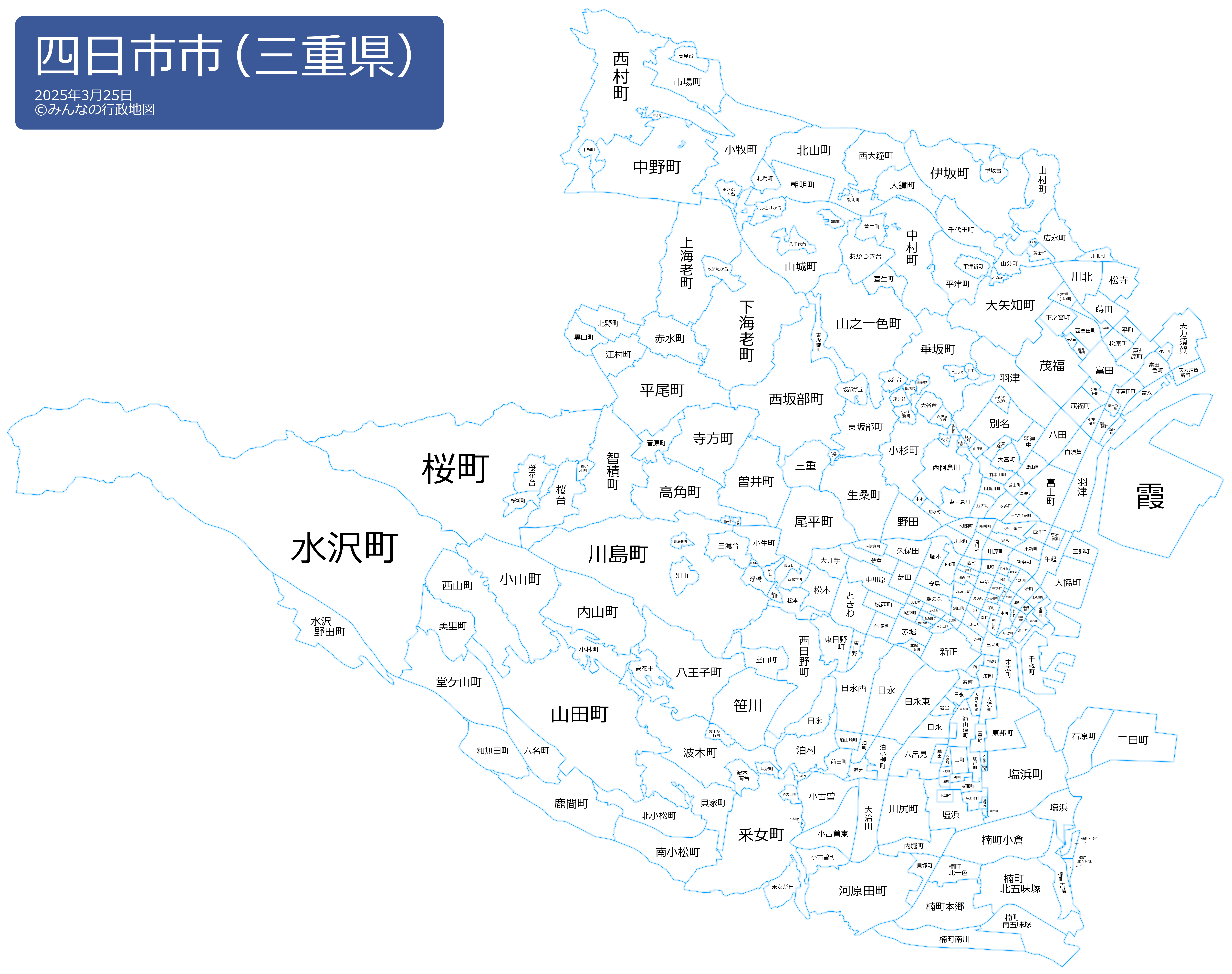 相生町(あいおいちょう)青葉町(あおばちょう)あかつき台(あかつきだい)赤堀(あかほり)赤堀新町(あかほりしんまち)赤堀南町(あかほりみなみまち)あがたが丘(あがたがおか)阿倉川新町(あくらがわしんまち)阿倉川町(あくらがわちょう)曙(あけぼの)曙町(あけぼのちょう)赤水町(あこずちょう)あさけが丘(あさけがおか)朝明町(あさけちょう)朝日町(あさひまち)雨池町(あまいけちょう)天カ須賀(あまがすか)天カ須賀新町(あまがすかしんまち)生桑町(いくわちょう)伊倉(いぐら)伊坂台(いさかだい)伊坂町(いさかちょう)石塚町(いしづかちょう)石原町(いしはらちょう)市場町(いちばちょう)稲葉町(いなばちょう)浮橋(うきはし)内山町(うちやまちょう)内堀町(うつぼりちょう)釆女が丘(うねめがおか)釆女町(うねめちょう)鵜の森(うのもり)午起(うまおこし)江村町(えむらちょう)追分(おいわけ)桜花台(おうかだい)大池町(おおいけちょう)大井手(おおいで)大井の川町(おおいのかわちょう)大鐘町(おおがねちょう)大谷台(おおたにだい)大浜町(おおはまちょう)大宮町(おおみやちょう)大宮西町(おおみやにしまち)大矢知新町(おおやちしんまち)大矢知町(おおやちちょう)沖の島町(おきのしまちょう)小古曽(おごそ)小古曽町(おごそちょう)小古曽東(おごそひがし)尾上町(おのえちょう)大治田(おばた)尾平町(おびらちょう)小山町(おやまちょう)