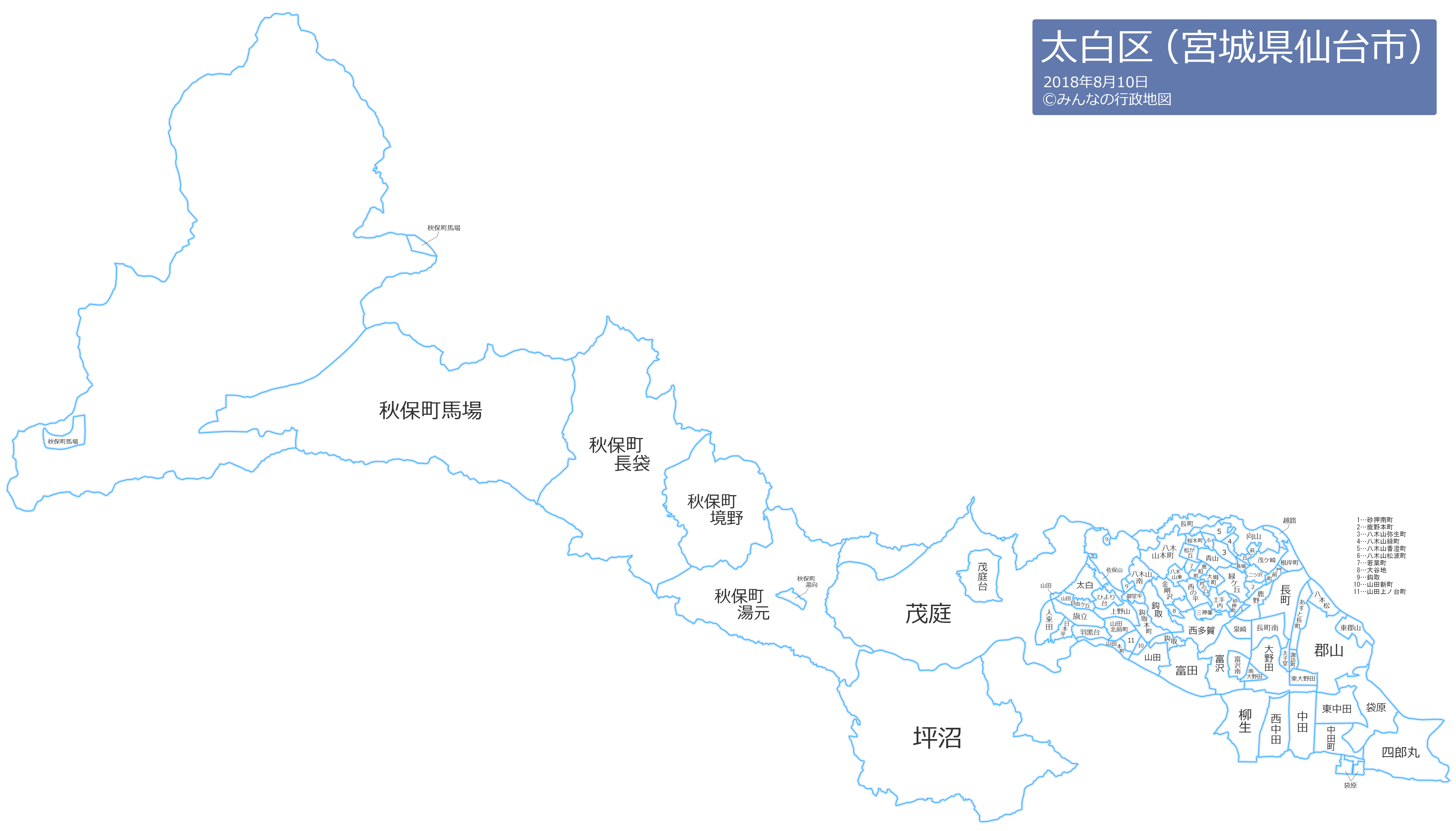 青山(あおやま)秋保町境野(あきうまちさかいの)秋保町長袋(あきうまちながふくろ)秋保町馬場(あきうまちばば)秋保町湯向(あきうまちゆむかい)秋保町湯元(あきうまちゆもと)芦の口(あしのくち)あすと長町(あすとながまち)飯田(いいだ)泉崎(いずみざき)大塒町(おおとやまち)大野田(おおのだ)大谷地(おおやち)