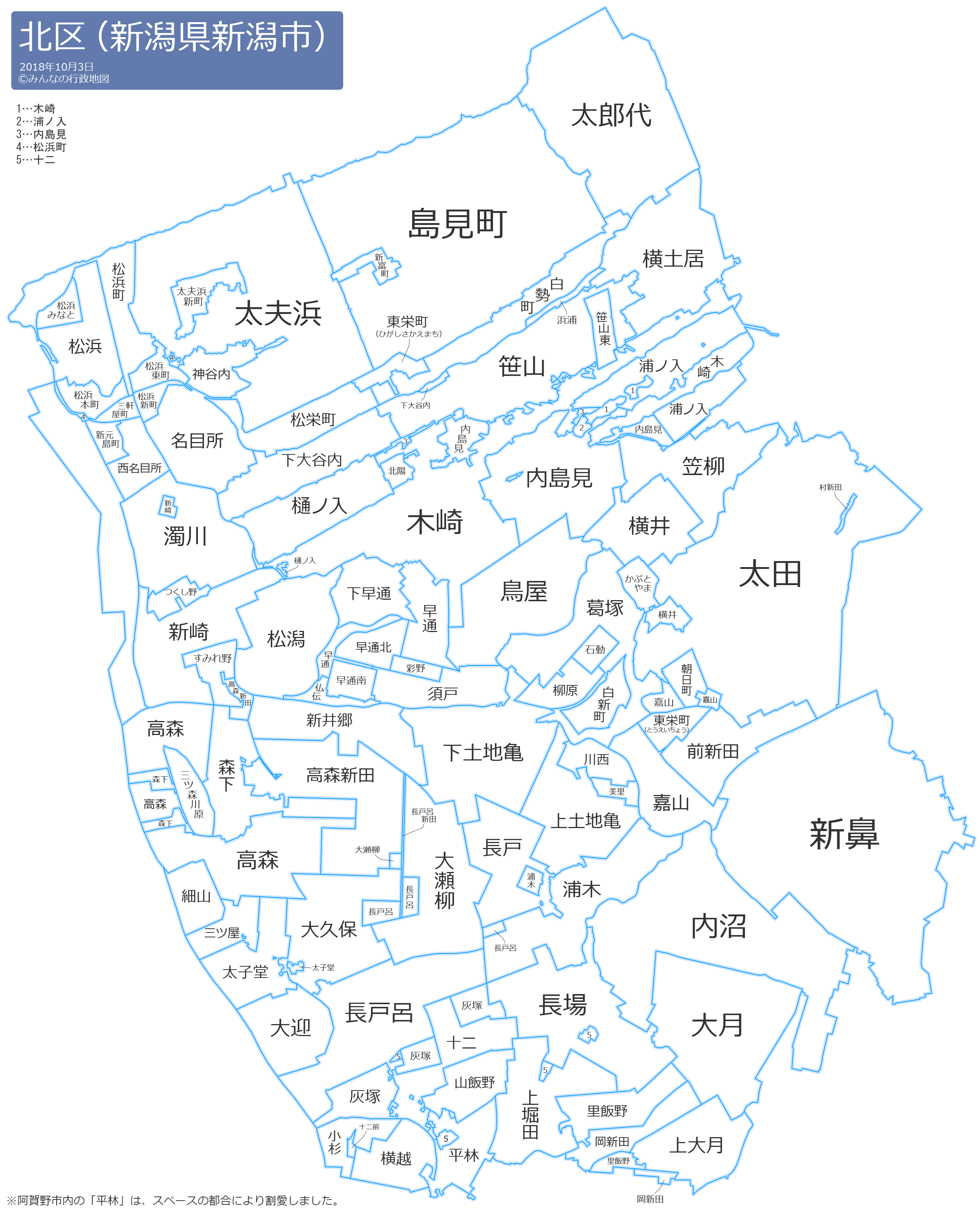 長戸(ながと)長戸呂(ながとろ)長戸呂新田(ながとろしんでん)長場(ながば)名目所(なめところ)新井郷(にいごう)新崎(にいざき)濁川(にごりかわ)西名目所(にしなめところ)