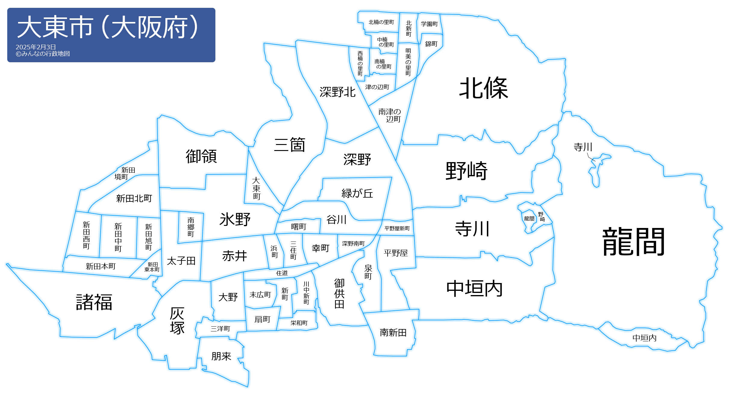 幸町(さいわいちょう)三箇(さんが)三洋町(さんようちょう)新田旭町(しんでんあさひまち)新田境町(しんでんさかいまち)新田中町(しんでんなかまち)新田西町(しんでんにしまち)新田北町(しんでんきたまち)新田東本町(しんでんひがしほんまち)新田本町(しんでんほんまち)新町(しんまち)末広町(すえひろちょう)住道(すみのどう)
