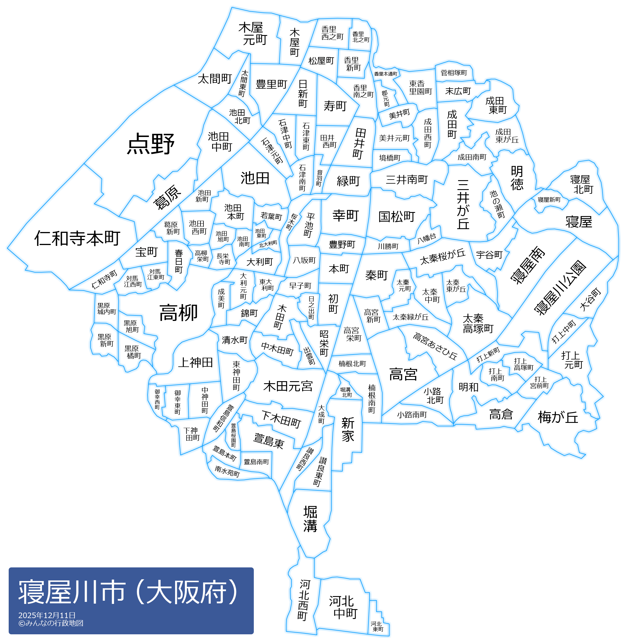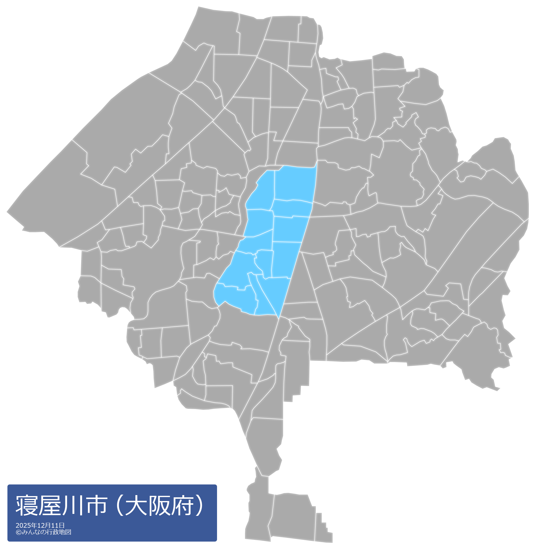 春日町(かすがちょう)上神田(かみかみだ)萱島桜園町(かやしまさくらえんちょう)萱島信和町(かやしましんわちょう)萱島本町(かやしまほんまち)萱島南町(かやしまみなみまち)萱島東(かやしまひがし)川勝町(かわかつちょう)河北中町(かわきたなかまち)河北東町(かわきたひがしまち)河北西町(かわきたにしまち)菅相塚町(かんそうづかちょう)北大利町(きたおおとしちょう)木田町(きだちょう)木田元宮(きだもとみや)楠根南町(くすねみなみまち)楠根北町(くすねきたまち)葛原(くずはら)葛原新町(くずはらしんまち)国松町(くにまつちょう)黒原旭町(くろはらあさひまち)黒原新町(くろはらしんまち)黒原城内町(くろはらじょうないちょう)黒原橘町(くろはらたちばなちょう)香里新町(こおりしんまち)香里本通町(こおりほんどおりちょう)香里西之町(こおりにしのちょう)香里南之町(こおりみなみのちょう)香里北之町(こおりきたのちょう)郡元町(こおりもとまち)寿町(ことぶきちょう)木屋町(こやちょう)木屋元町(こやもとまち)