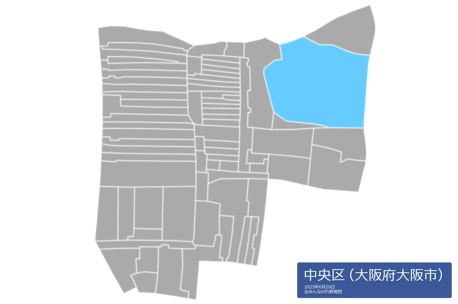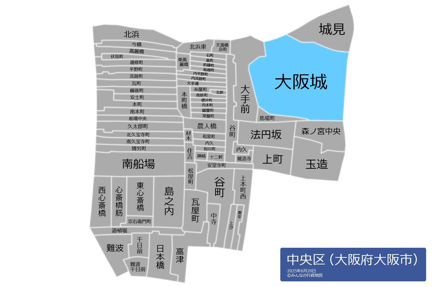 安土町(あづちまち)淡路町(あわじまち)安堂寺町(あんどうじまち)和泉町(いずみまち)糸屋町(いとやまち)今橋(いまばし)上汐(うえしお)上本町西(うえほんまちにし)上町(うえまち)内淡路町(うちあわじまち)内久宝寺町(うちきゅうほうじまち)内平野町(うちひらのまち)内本町(うちほんまち)大阪城(おおさかじょう)大手通(おおてどおり)大手前(おおてまえ)