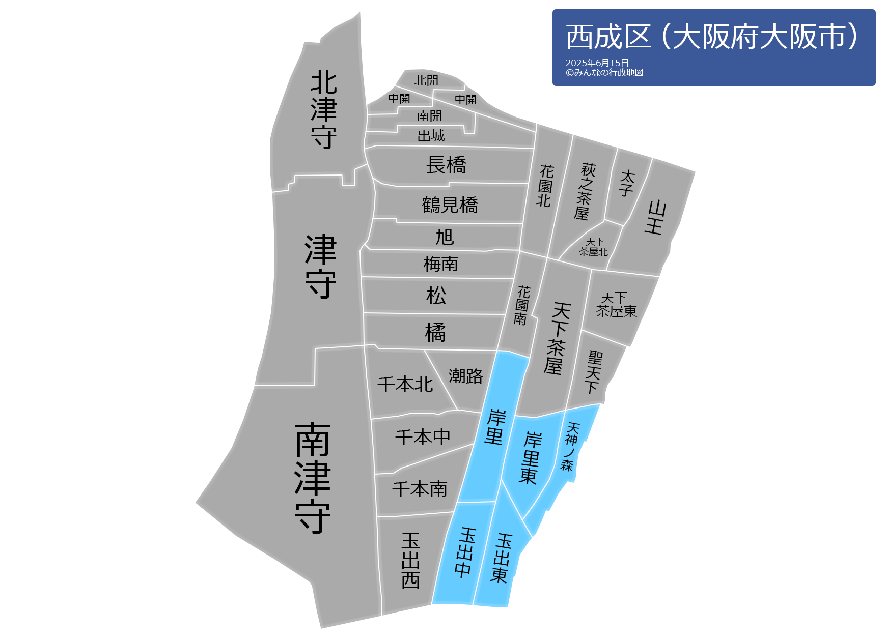 岸里(きしのさと)岸里東(きしのさとひがし)北津守(きたつもり)北開(きたびらき)