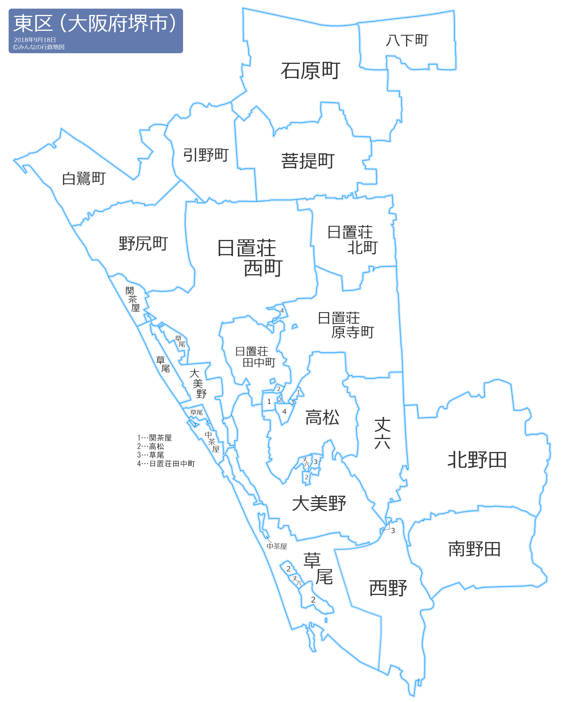 日置荘北町(ひきしょうきたまち)日置荘田中町(ひきしょうたなかまち)日置荘西町(ひきしょうにしまち)日置荘原寺町(ひきしょうはらでらまち)引野町(ひきのちょう)菩提町(ぼだいちょう)