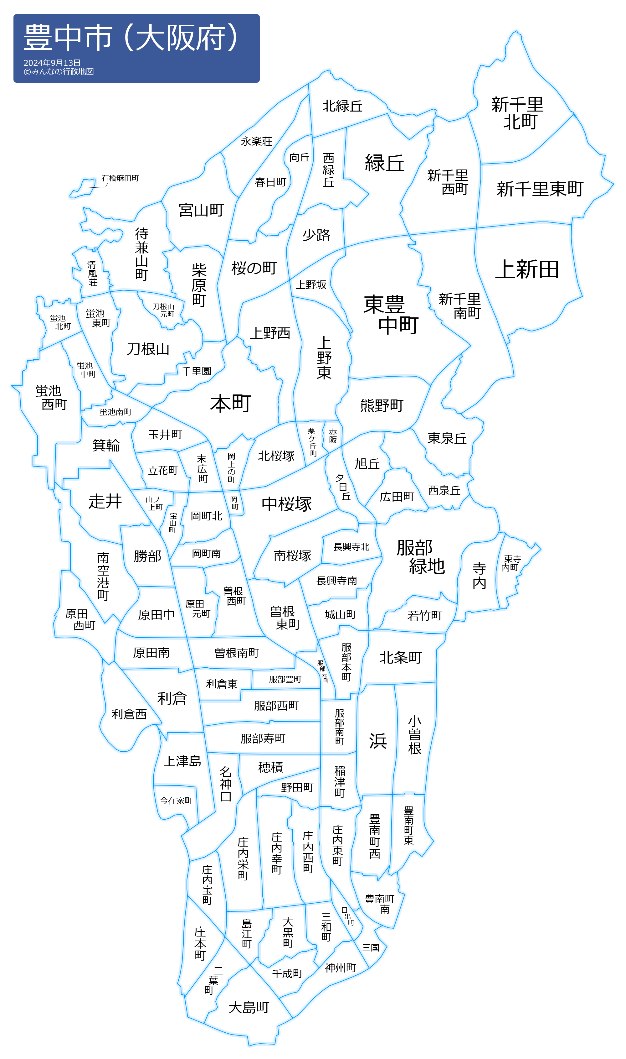桜の町(さくらのちょう)三和町(さんわちょう)柴原町(しばはらちょう)島江町(しまえちょう)少路(しょうじ)庄内幸町(しょうないさいわいまち)庄内栄町(しょうないさかえまち)庄内宝町(しょうないたからまち)庄内東町(しょうないひがしまち)庄内西町(しょうないにしまち)庄本町(しょうもとちょう)城山町(しろやまちょう)新千里東町(しんせんりひがしまち)新千里西町(しんせんりにしまち)新千里南町(しんせんりみなみまち)新千里北町(しんせんりきたまち)末広町(すえひろちょう)清風荘(せいふうそう)千成町(せんなりちょう)千里園(せんりえん)曽根東町(そねひがしのちょう)曽根西町(そねにしまち)曽根南町(そねみなみまち)