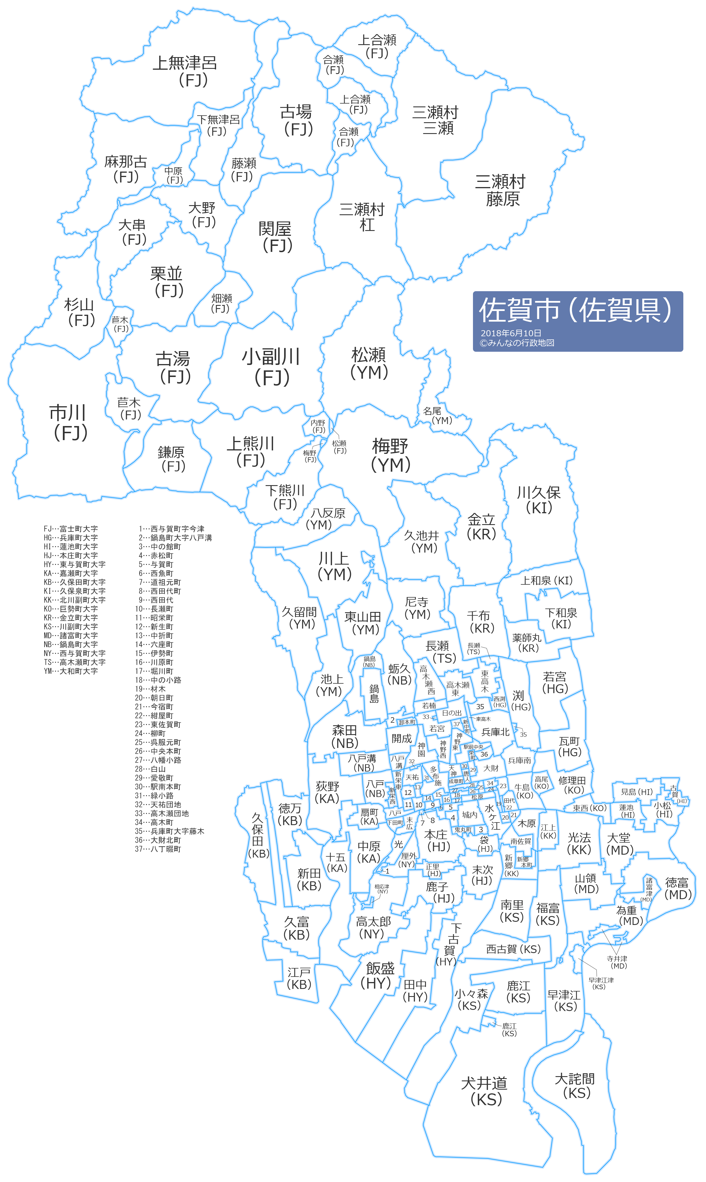 開成(かいせい)嘉瀬町扇町(かせまちおうぎまち)嘉瀬町荻野(かせまちおぎの)嘉瀬町十五(かせまちじゅうご)嘉瀬町中原(かせまちなかばる)神園(かみぞの)川副町犬井道(かわそえまちいぬいどう)川副町大詫間(かわそえまちおおだくま)川副町鹿江(かわそえまちかのえ)川副町小々森(かわそえまちこごもり)川副町南里(かわそえまちなんり)川副町西古賀(かわそえまちにしこが)川副町早津江(かわそえまちはやつえ)川副町早津江津(かわそえまちはやつえつ)川副町福富(かわそえまちふくどみ)川原町(かわはらまち)北川副町江上(きたかわそえまちえがみ)北川副町新郷(きたかわそえまちしんごう)北川副町光法(きたかわそえまちみつのり)木原(きはら)金立町金立(きんりゅうまちきんりゅう)金立町千布(きんりゅうまちちふ)金立町薬師丸(きんりゅうまちやくしまる)久保泉町上和泉(くぼいずみまちかみいずみ)久保泉町川久保(くぼいずみまちかわくぼ)久保泉町下和泉(くぼいずみまちしもいずみ)久保田町江戸(くぼたちょうえど)久保田町久保田(くぼたちょうくぼた)久保田町新田(くぼたちょうしんでん)久保田町徳万(くぼたちょうとくまん)久保田町久富(くぼたちょうひさどみ)神野東(こうのひがし)神野西(こうのにし)巨勢町牛島(こせまちうしじま)巨勢町高尾(こせまちたかお)巨勢町修理田(こせまちしゅりた)巨勢町東西(こせまちとうざい)呉服元町(ごふくもとまち)紺屋町(こんやまち)