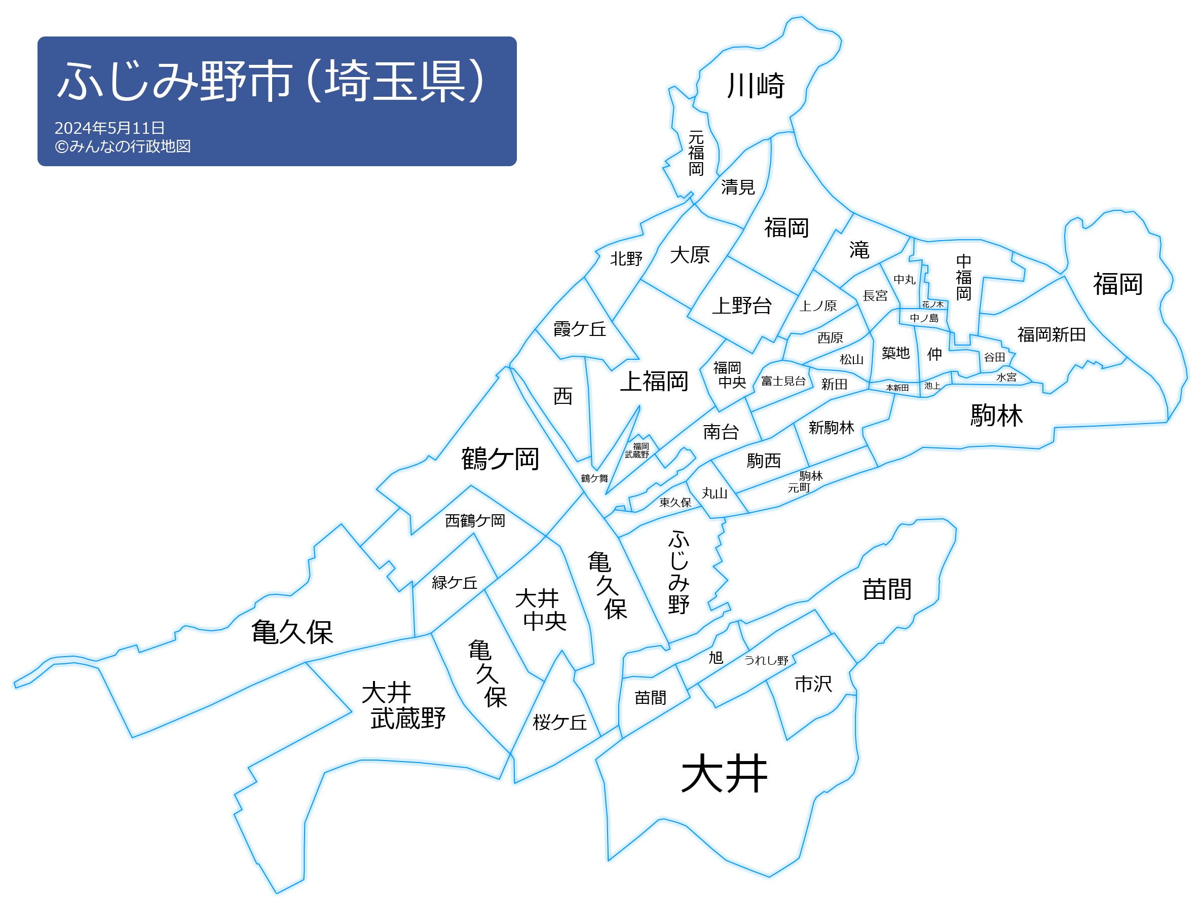 旭(あさひ)池上(いけがみ)市沢(いちさわ)上野台(うえのだい)上ノ原(うえのはら)うれし野(うれしの)大井(おおい)大井中央(おおいちゅうおう)大井武蔵野(おおいむさしの)大原(おおはら)