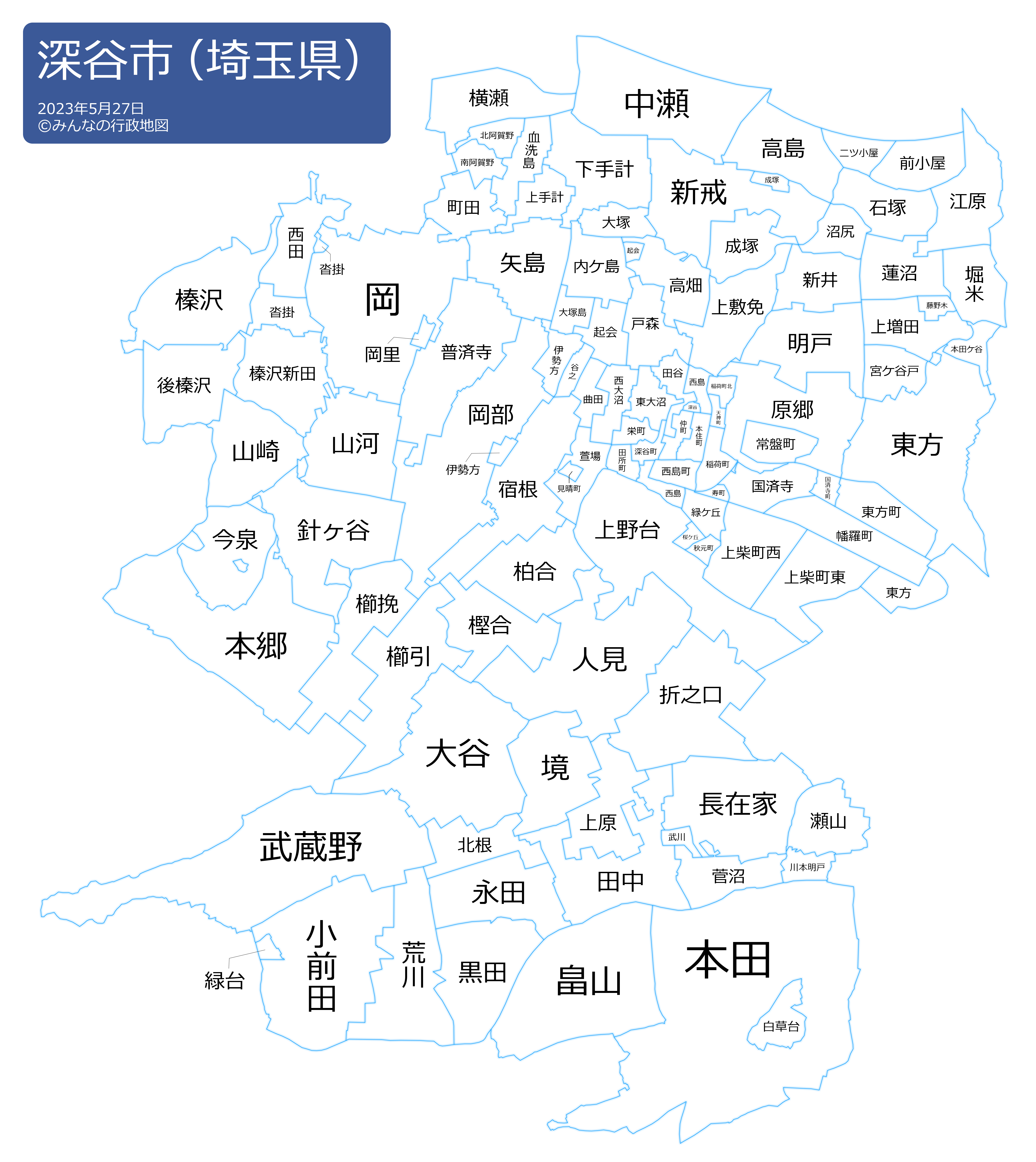 秋元町(あきもとちょう)明戸(あけと)新井(あらい)荒川(あらかわ)石塚(いしづか)伊勢方(いせがた)稲荷町(いなりちょう)稲荷町北(いなりちょうきた)今泉(いまいずみ)後榛沢(うしろはんざわ)内ケ島(うちがしま)上野台(うわのだい)江原(えばら)大塚島(おおつかじま)大塚(おおづか)大谷(おおや)岡(おか)岡里(おかざと)岡部(おかべ)起会(おきあい)小前田(おまえだ)折之口(おりのくち)