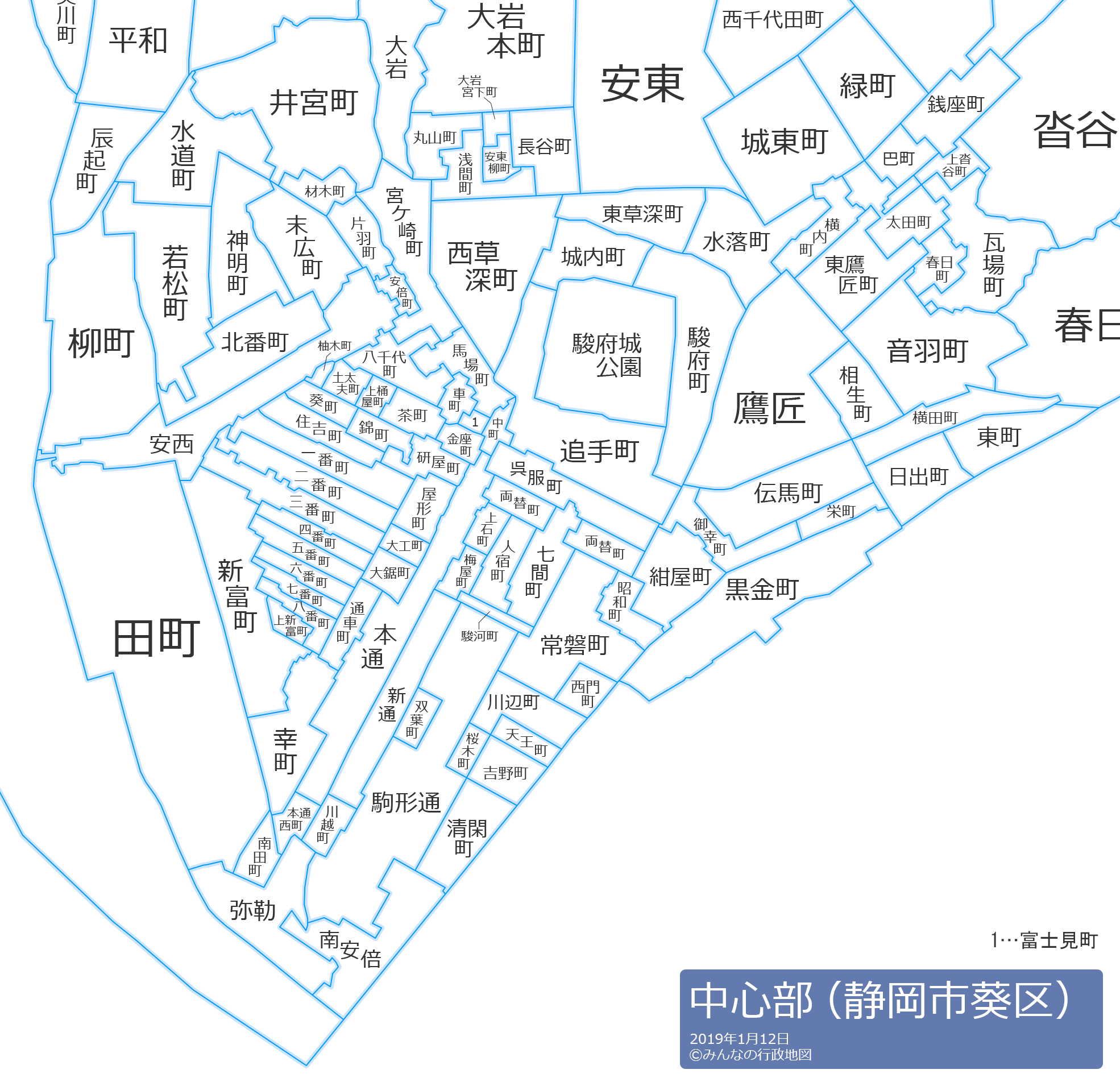 材木町(ざいもくちょう)幸町(さいわいちょう)栄町(さかえちょう)坂ノ上(さかのかみ)坂本(さかもと)桜木町(さくらぎちょう)桜町(さくらちょう)三番町(さんばんちょう)慈悲尾(しいのお)七間町(しちけんちょう)七番町(しちばんちょう)芝原(しばはら)下(しも)城東町(じょうとうちょう)城内町(じょうないちょう)昭府(しょうぶ)昭府町(しょうぶちょう)城北(じょうほく)昭和町(しょうわちょう)新伝馬(しんてんま)新通(しんとおり)新富町(しんとみちょう)新間(しんま)神明町(しんめいちょう)水道町(すいどうちょう)末広町(すえひろちょう)杉尾(すぎお)住吉町(すみよしちょう)駿河町(するがちょう)諏訪(すわ)駿府城公園(すんぷじょうこうえん)駿府町(すんぷちょう)清閑町(せいかんちょう)瀬名(せな)瀬名中央(せなちゅうおう)瀬名川(せながわ)浅間町(せんげんちょう)銭座町(ぜんざまち)千代(せんだい)