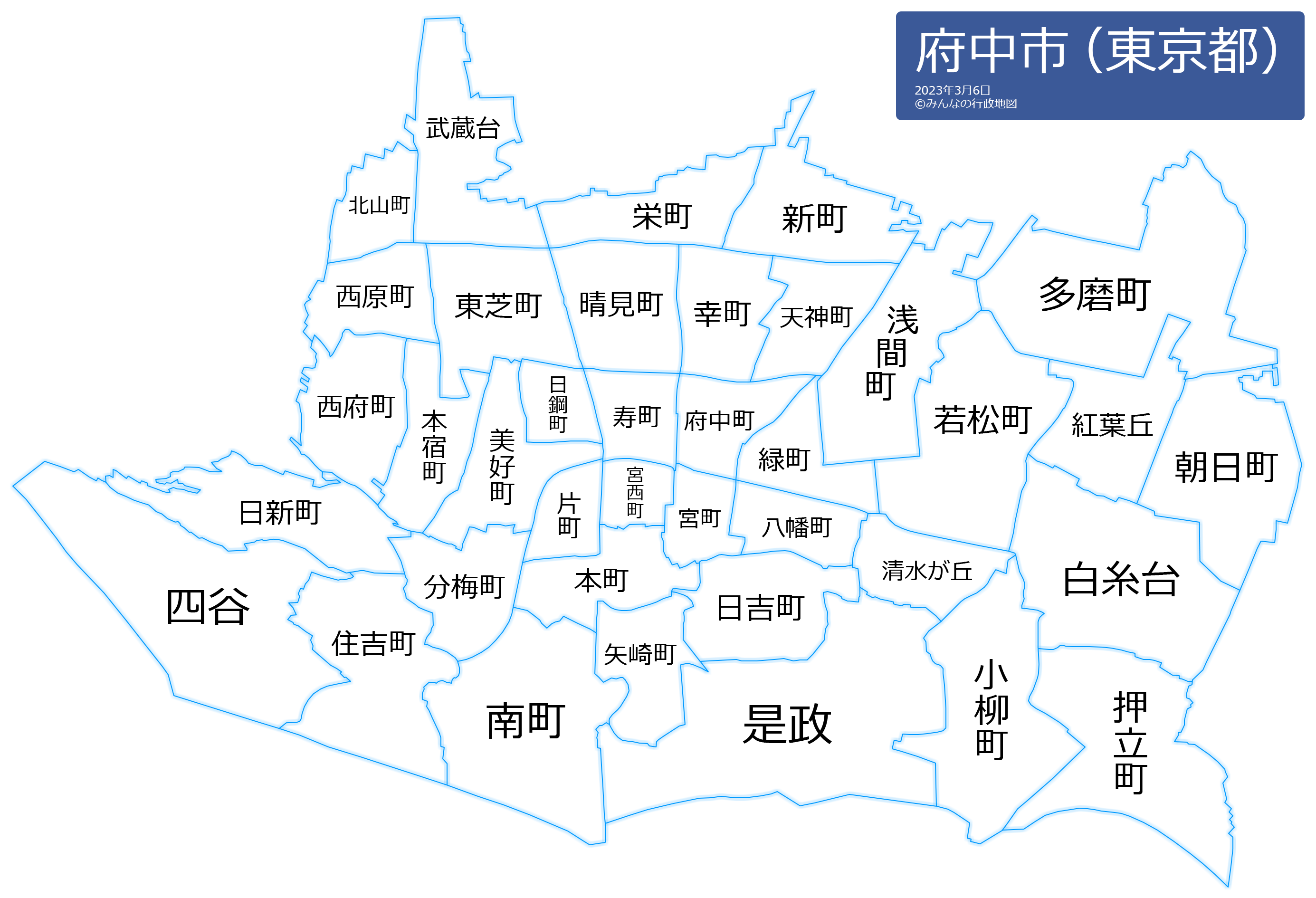 幸町(さいわいちょう)栄町(さかえちょう)清水が丘(しみずがおか)白糸台(しらいとだい)新町(しんまち)住吉町(すみよしちょう)浅間町(せんげんちょう)