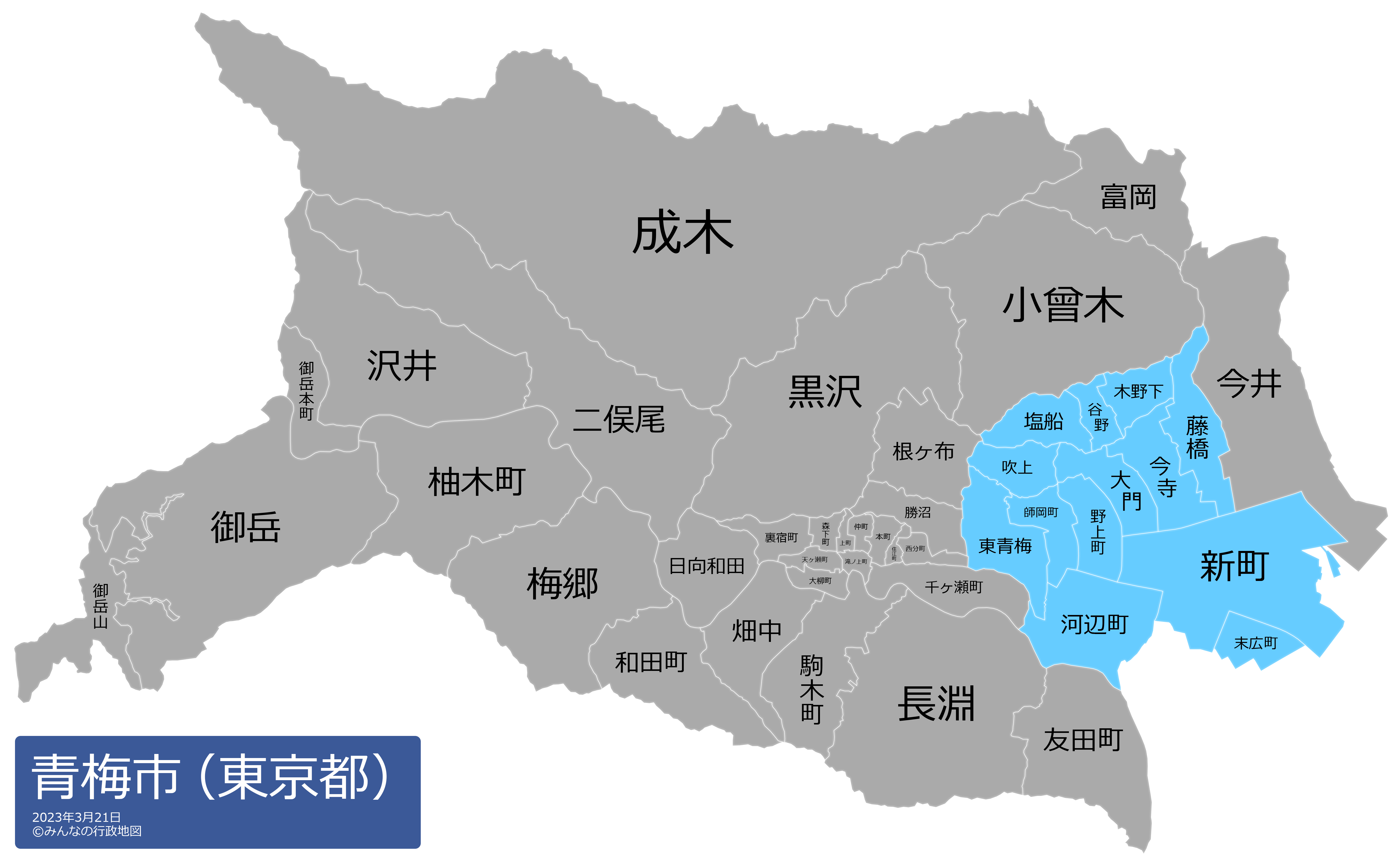 梅郷(ばいごう)畑中(はたなか)東青梅(ひがしおうめ)日向和田(ひなたわだ)吹上(ふきあげ)藤橋(ふじはし)二俣尾(ふたまたお)本町(ほんちょう)